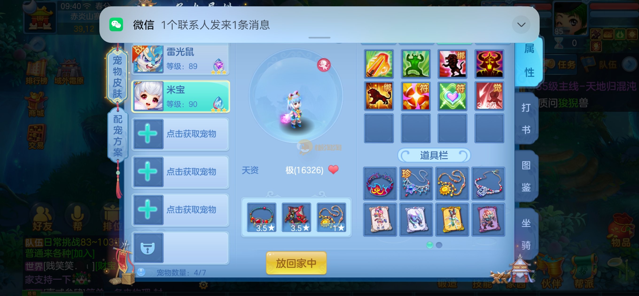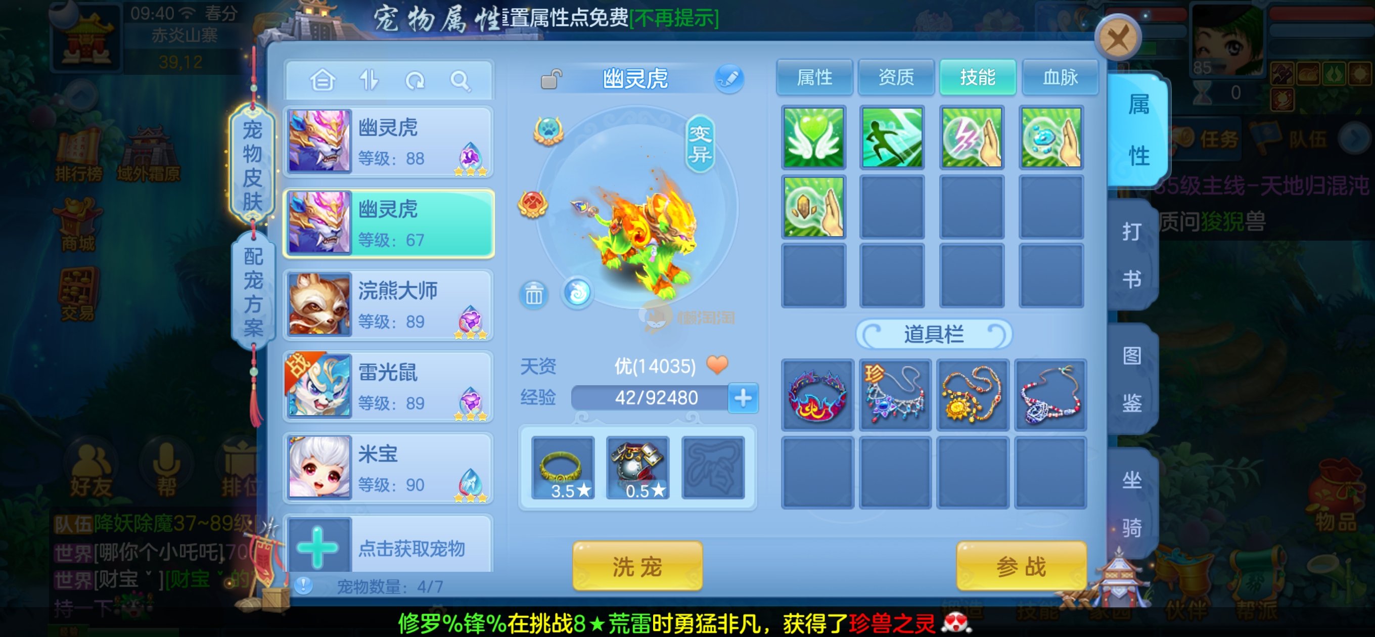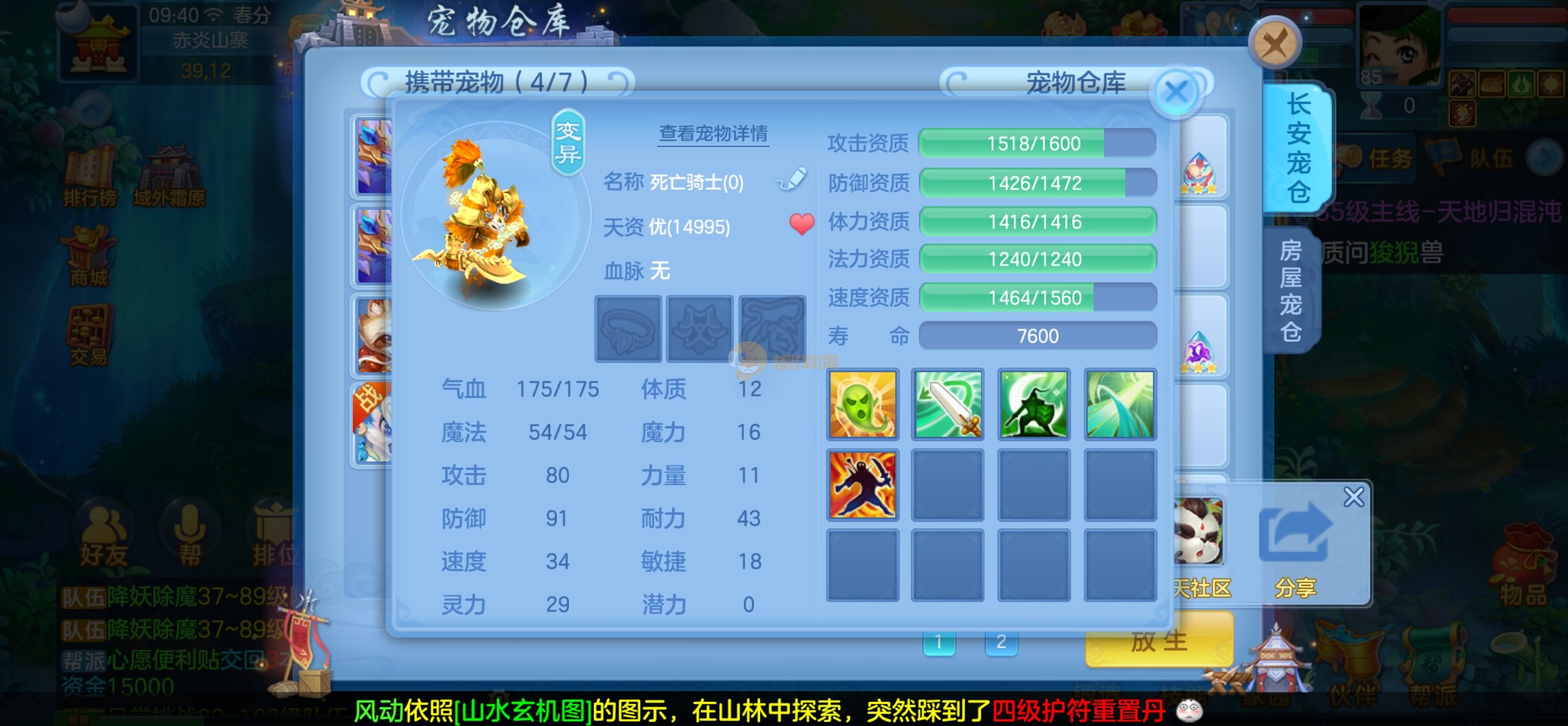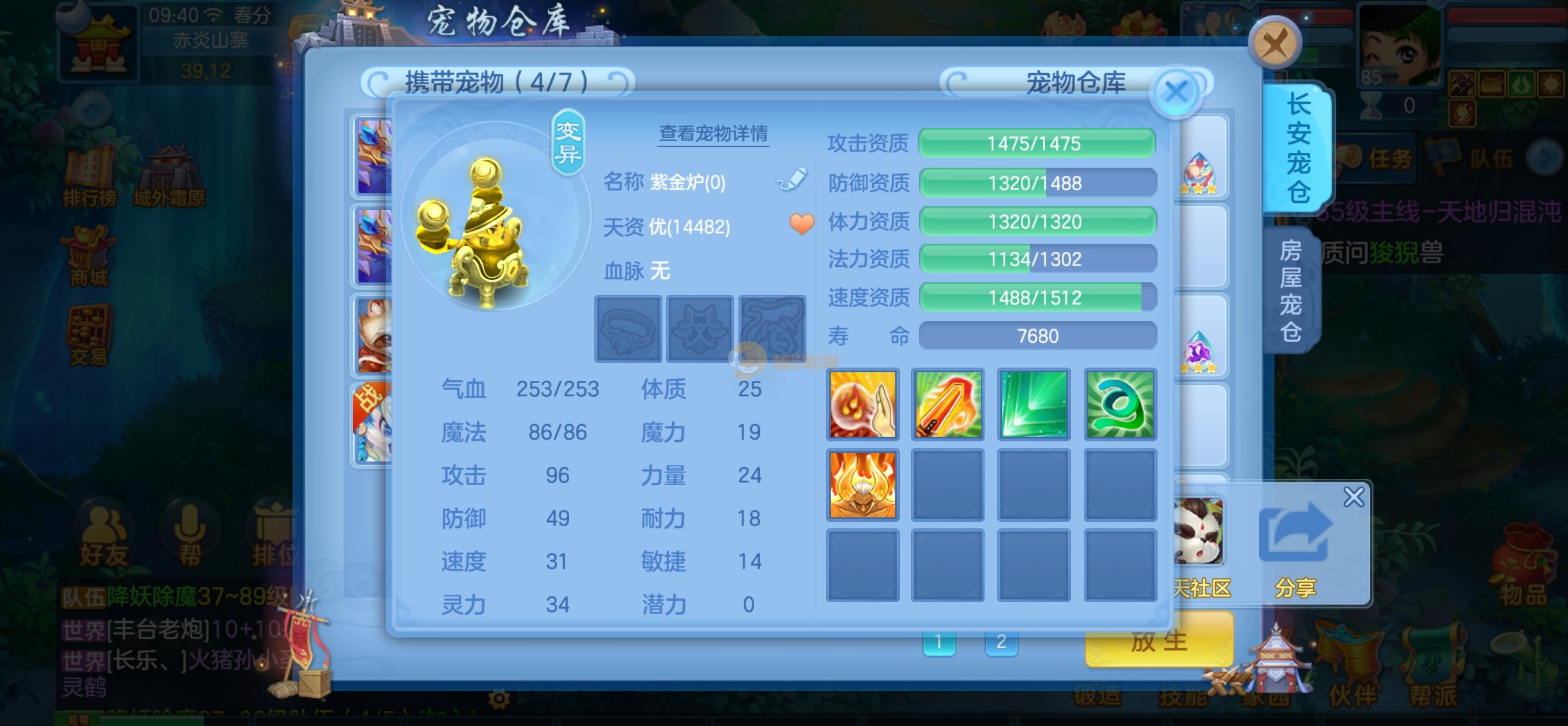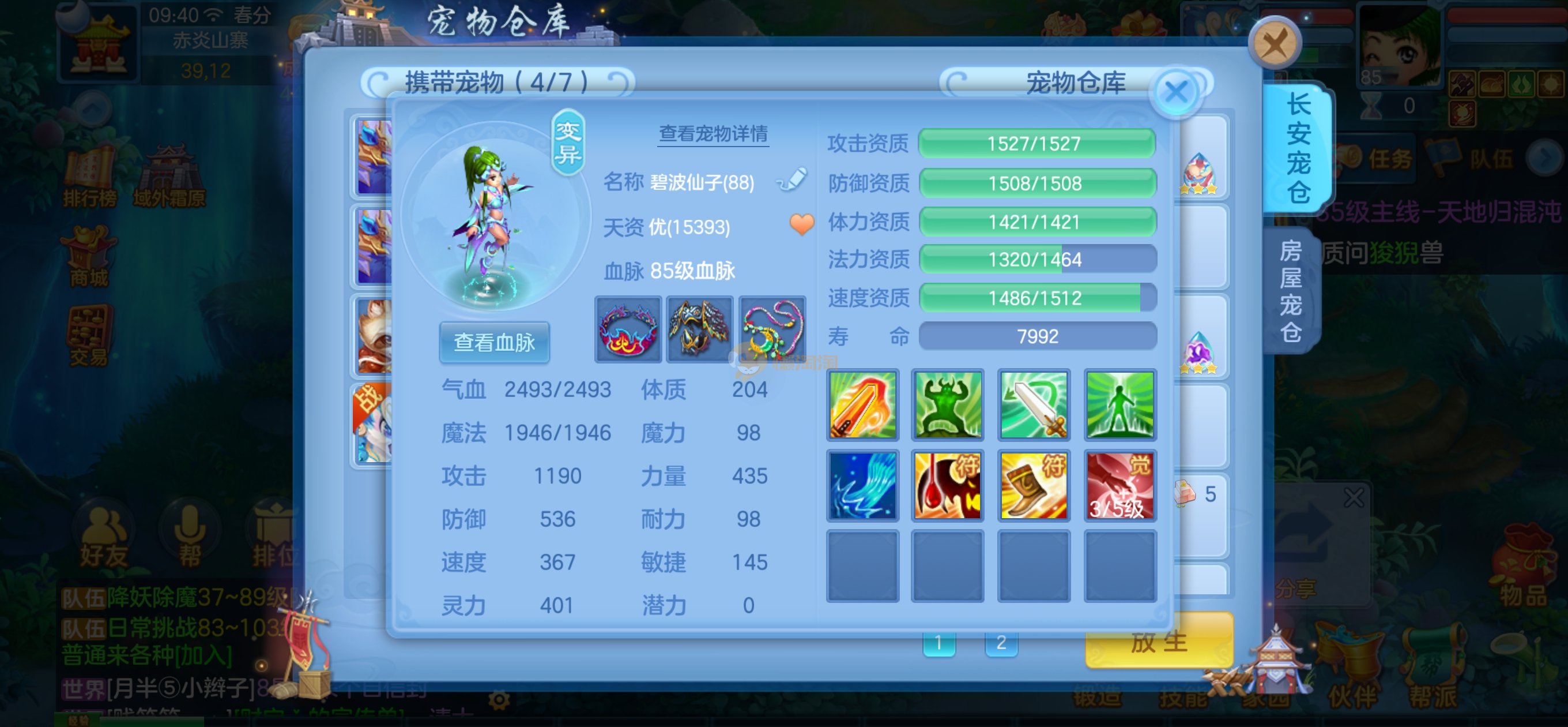 高级坐骑,85的宝宝齐全了都是高资质,仓库一堆通灵符和极品剑气护符,后期用精研就能用了