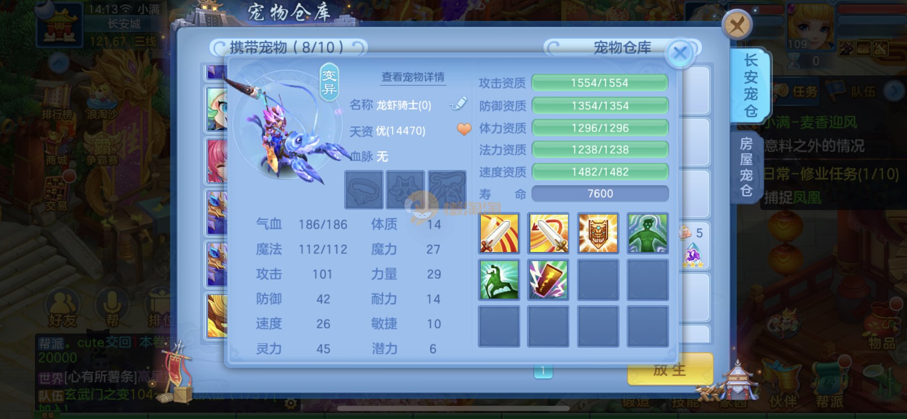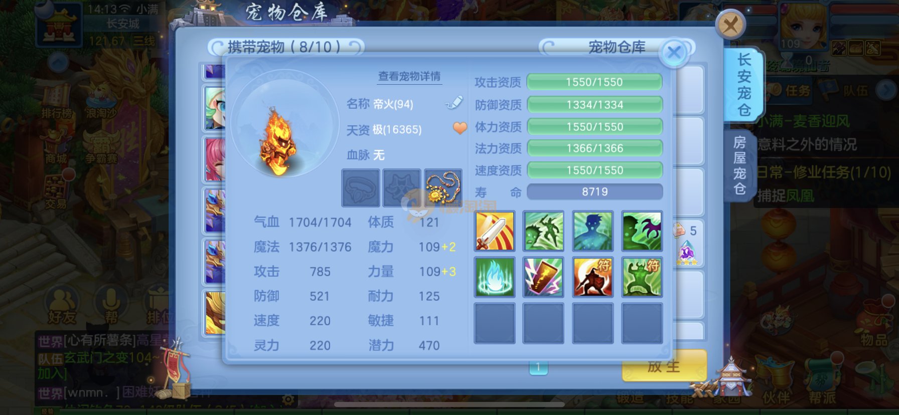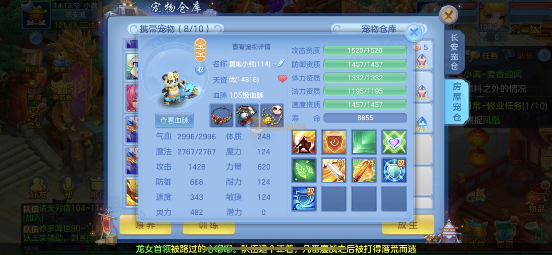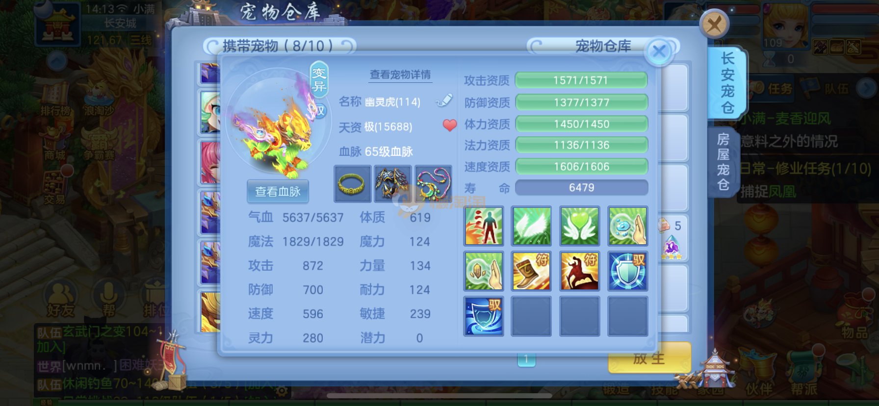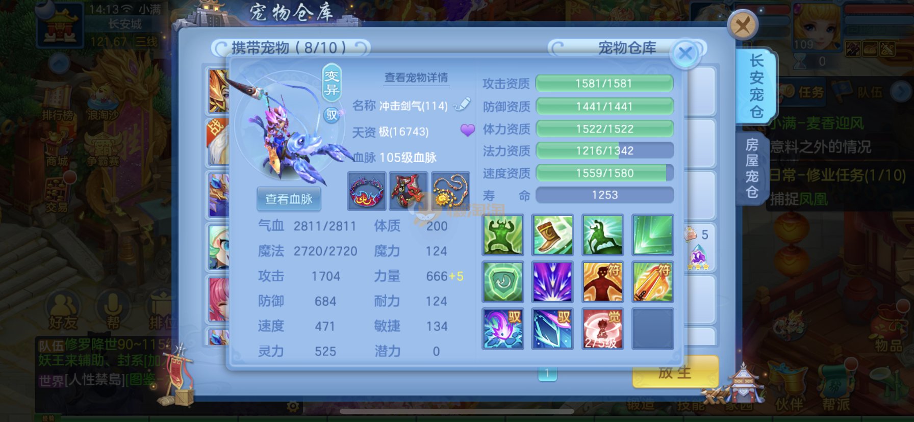 笑傲江湖109男冥月,13段,初攻595易/597必杀天地武器,冷静易腰带,易守护鞋子,装备均单加32左右,4神兽(玉龙强化、3青蛇1强化)11个满兽魂,10个专属天赋,带3个飞升奶粉,2980邮箱,无双重。7天换绑