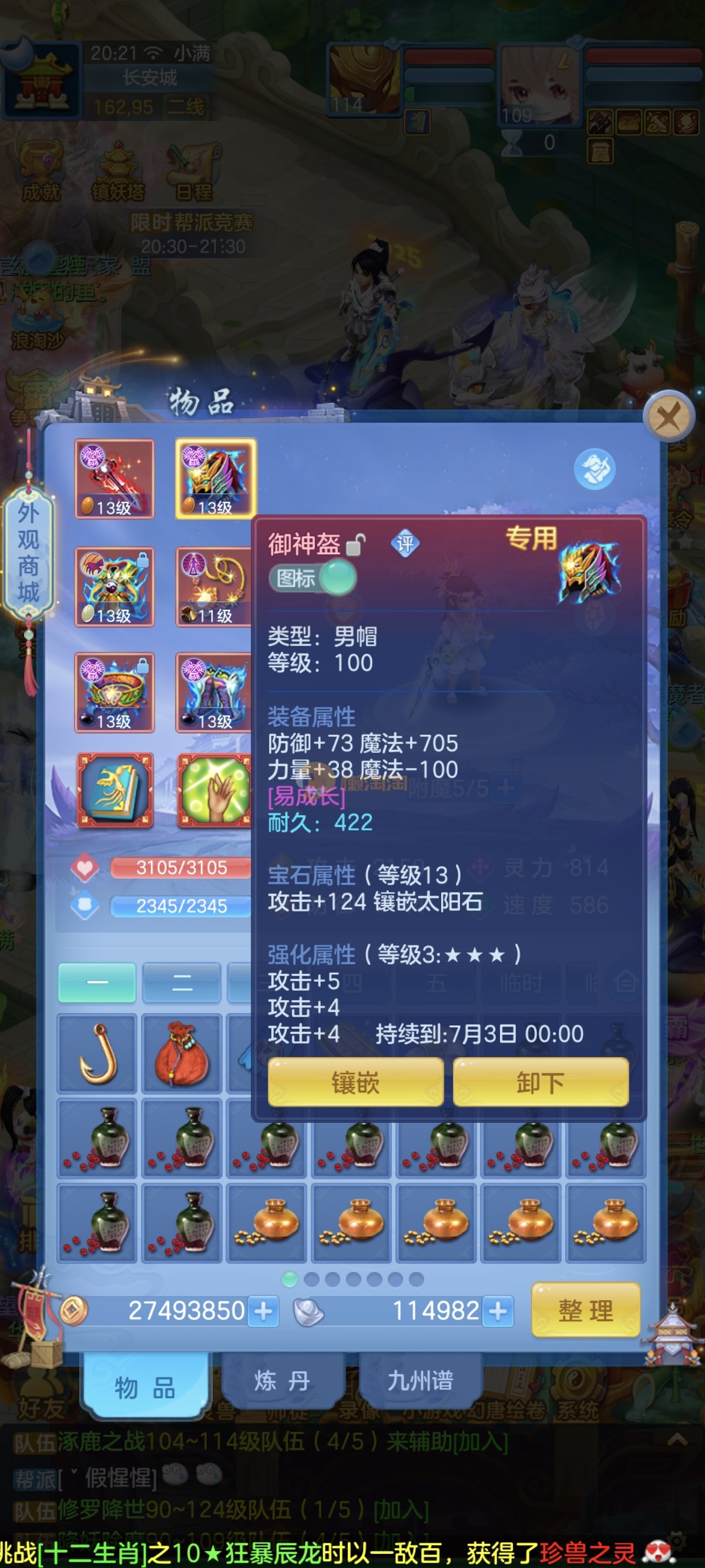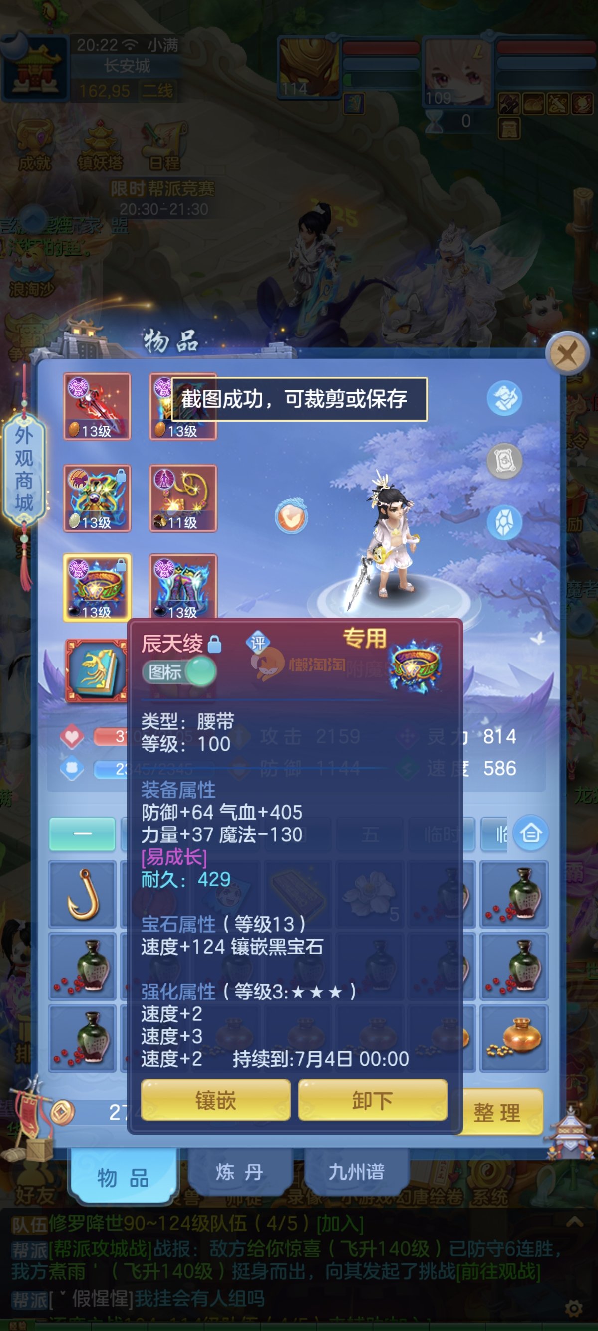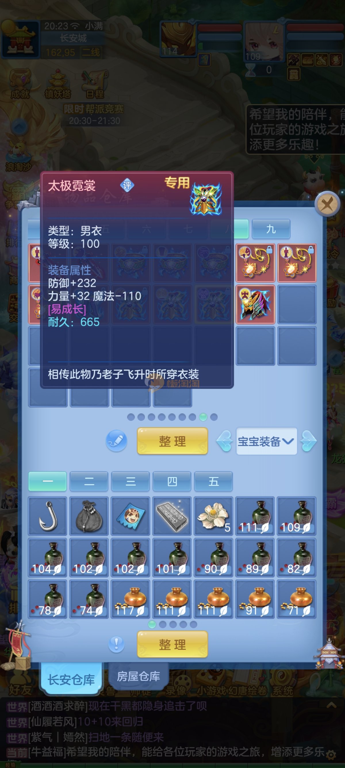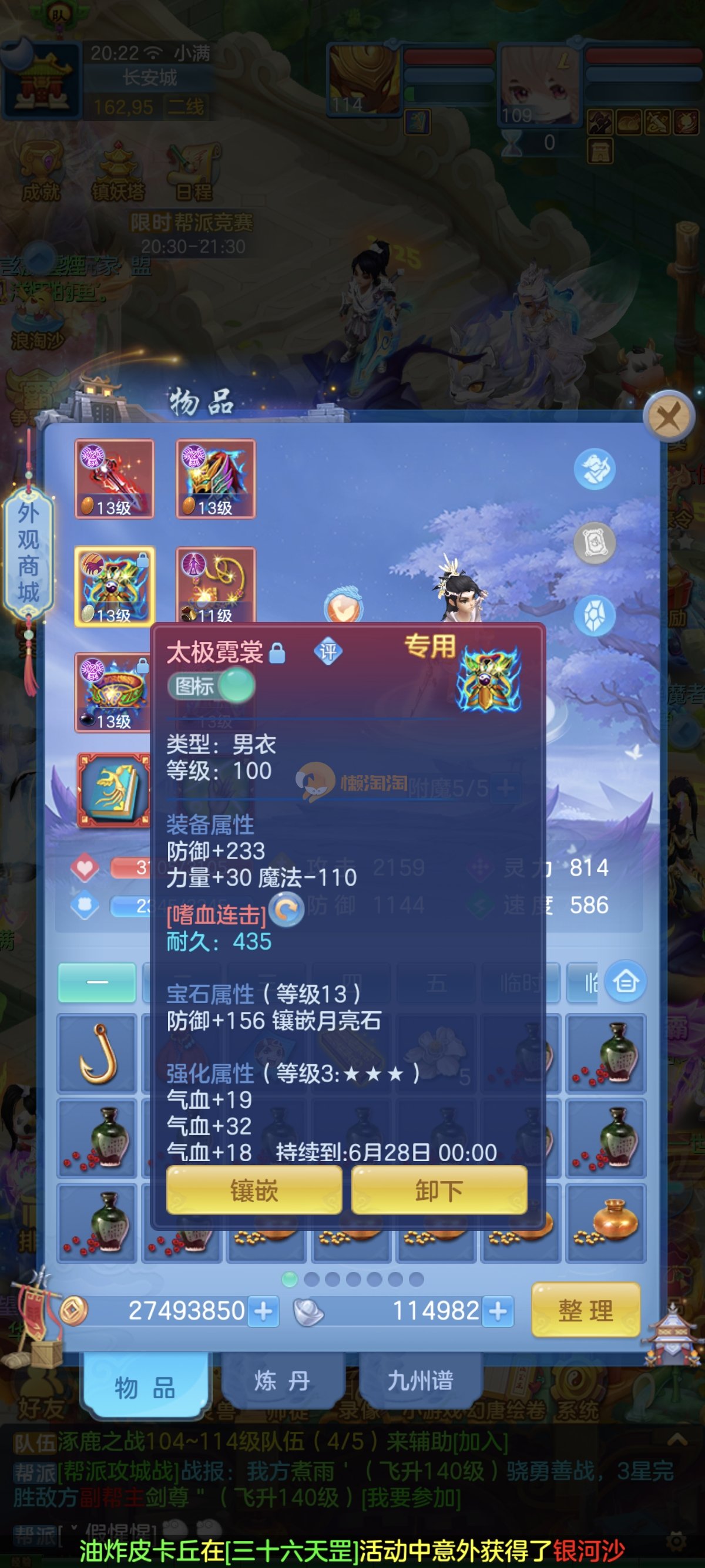 笑傲江湖109男冥月,13段,初攻595易/597必杀天地武器,冷静易腰带,易守护鞋子,装备均单加32左右,4神兽(玉龙强化、3青蛇1强化)11个满兽魂,10个专属天赋,带3个飞升奶粉,2980邮箱,无双重。7天换绑