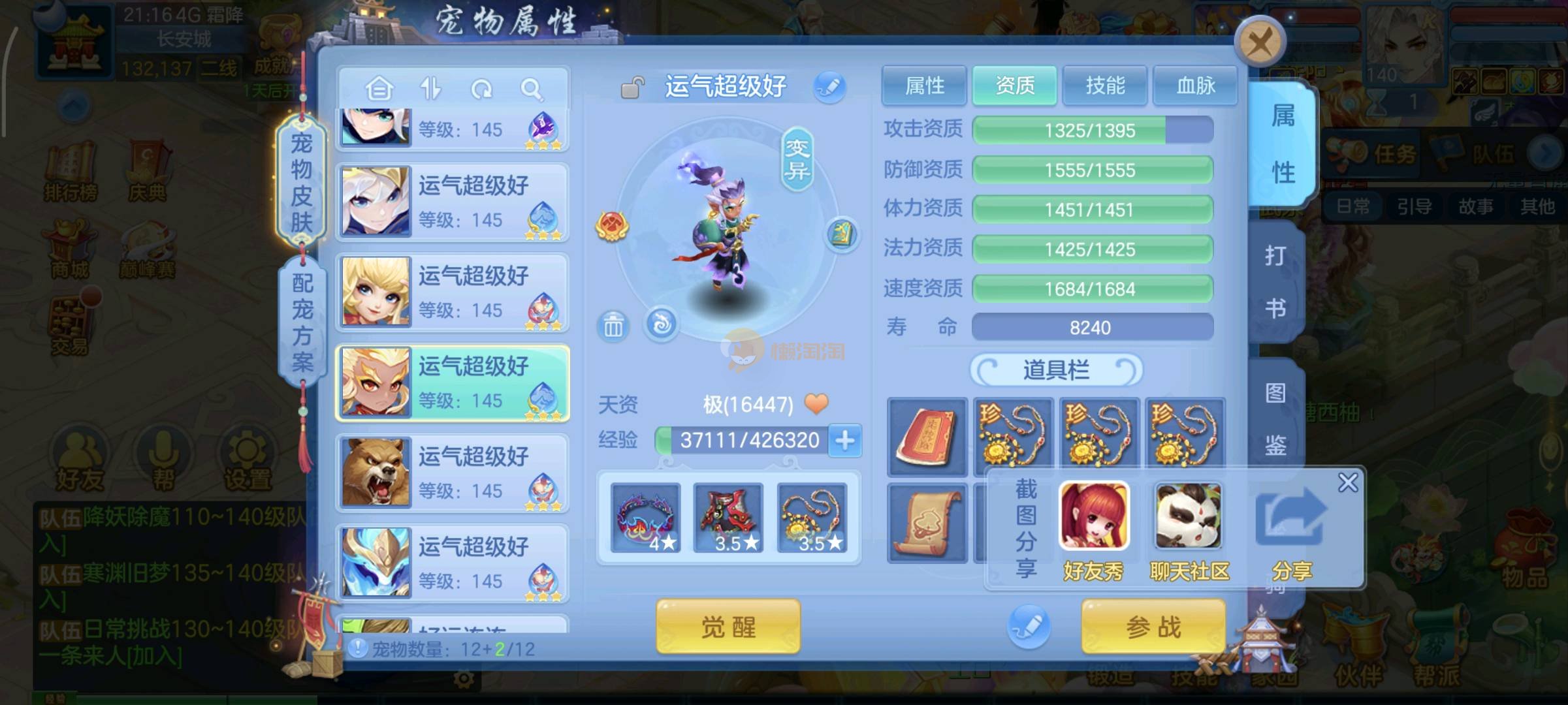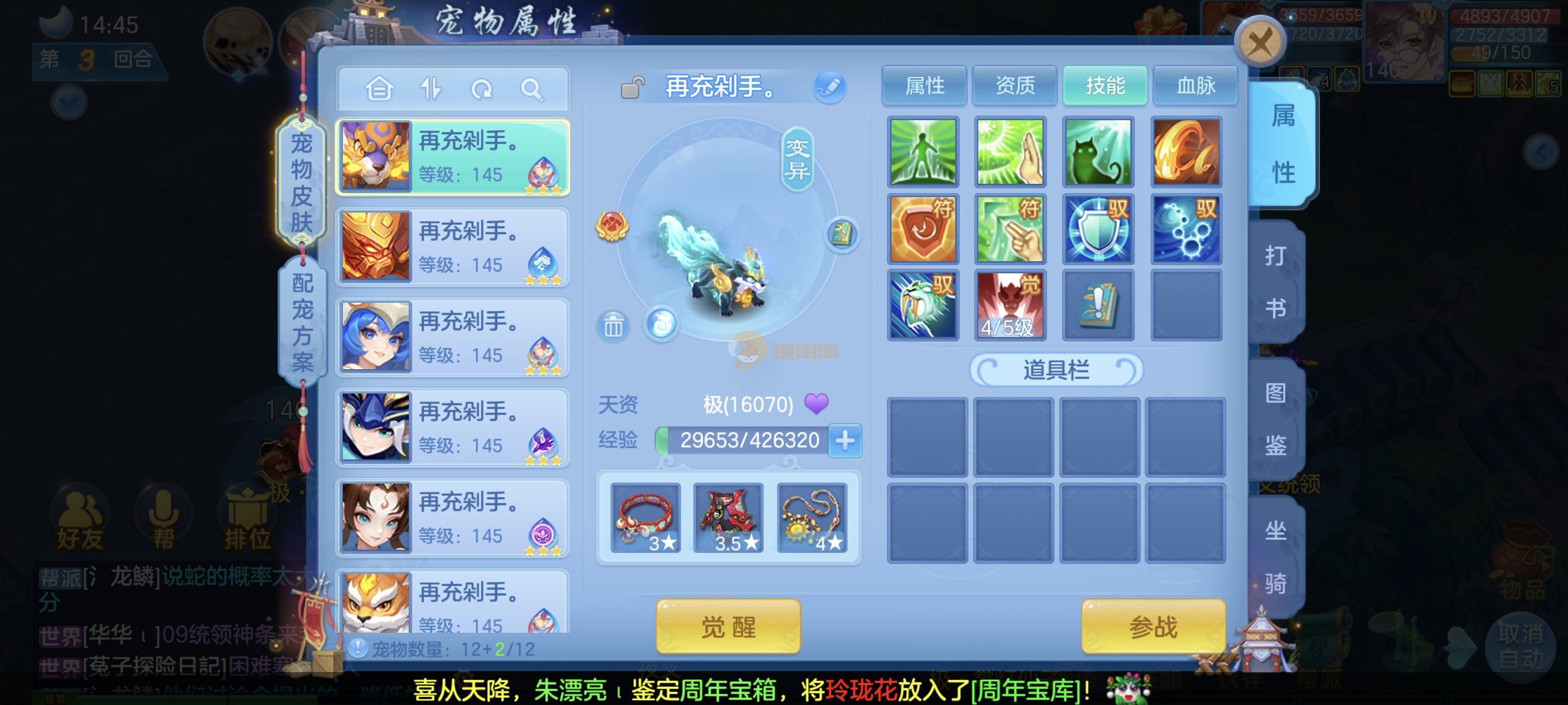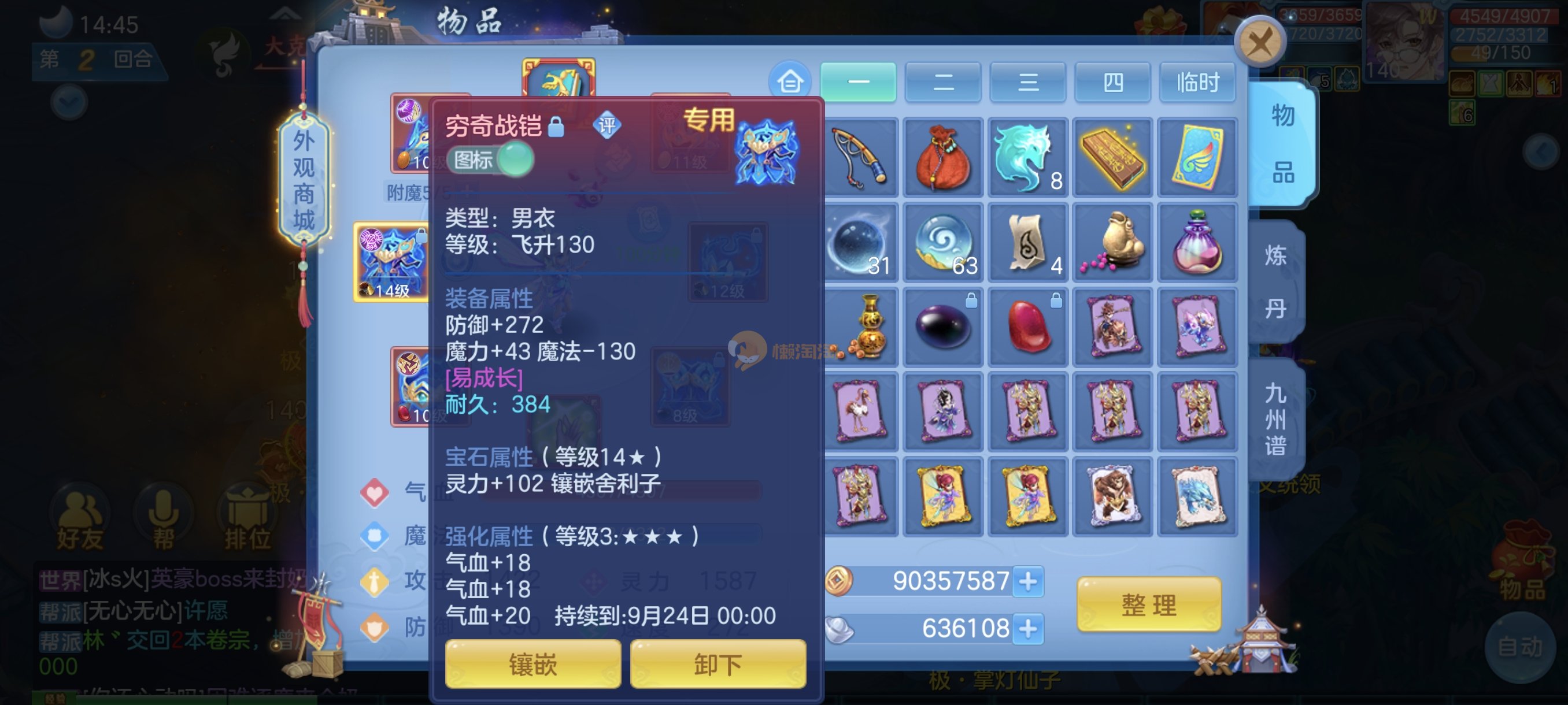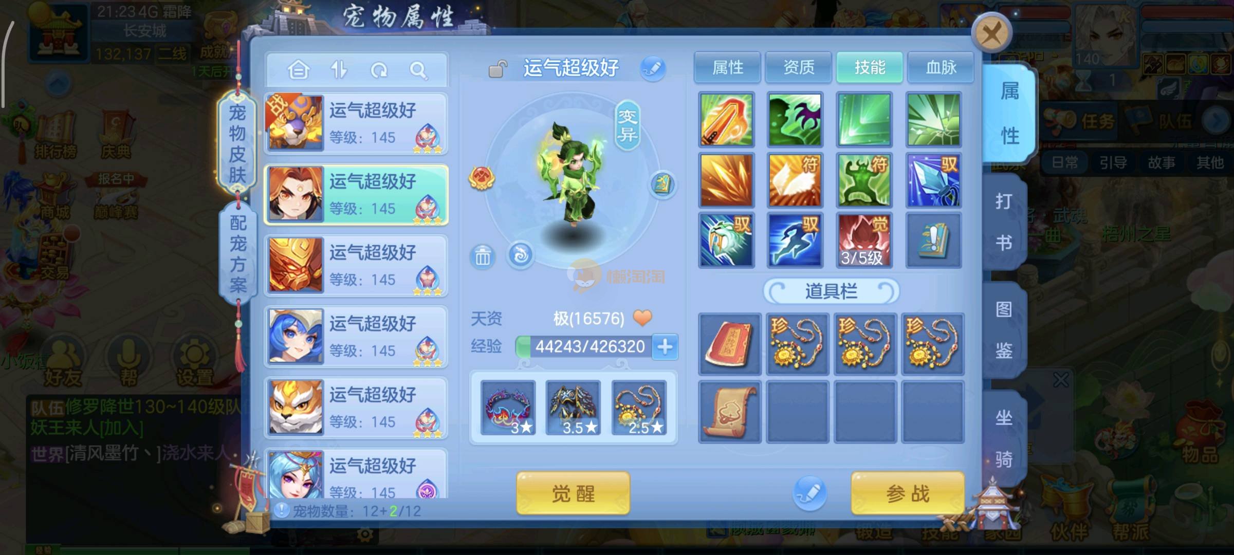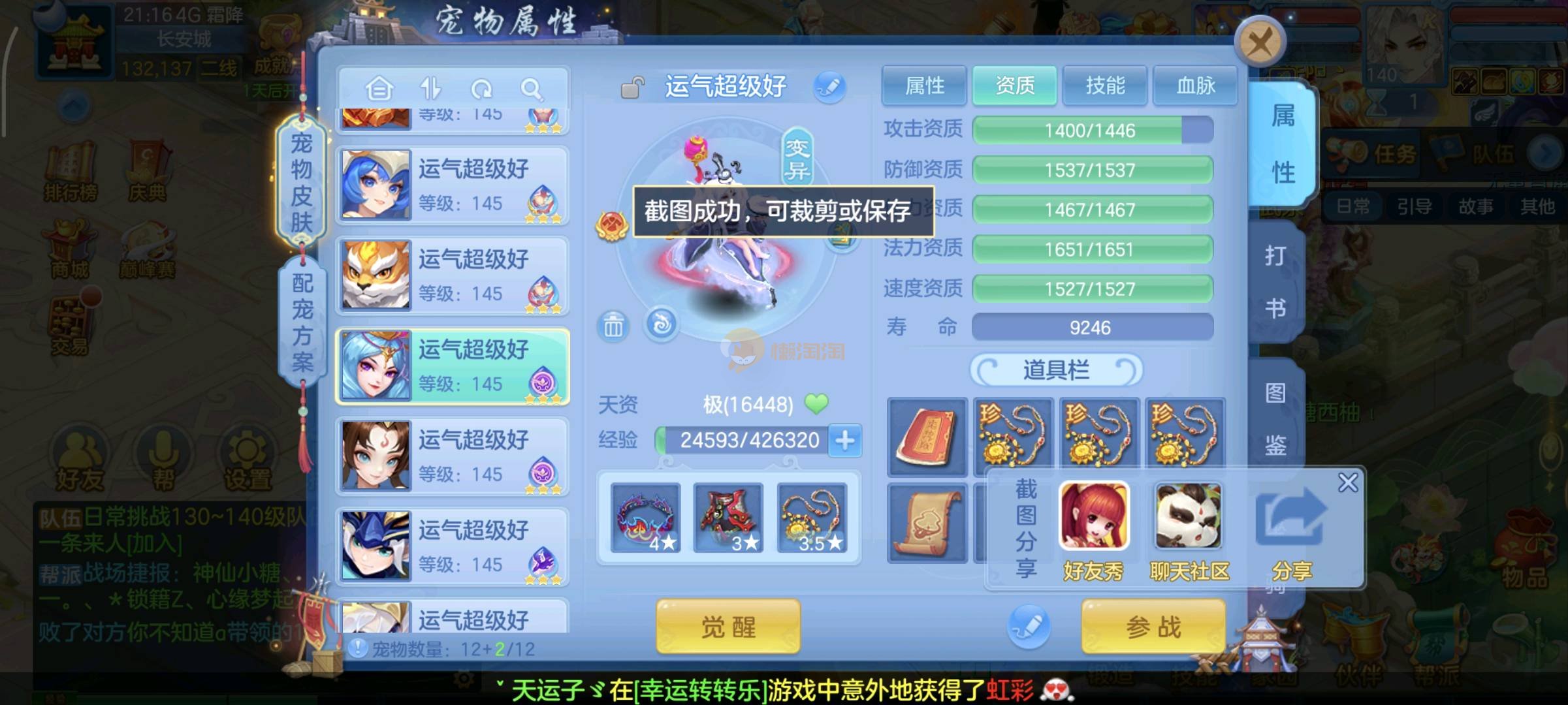 今年勇140男魔王,14段衣服13段项链,双红愤怒腰带 有玉龙和蛇 都只缺最后的强化 pk宝宝全 千速 尾速 首发老虎 首发孟婆 双红腰带 易成长高单加衣服 法爆武器,装备均单加42,高级坐骑龙 花2000金进化变身 ,1年换绑。不变卡1576灵 变卡1600无压力