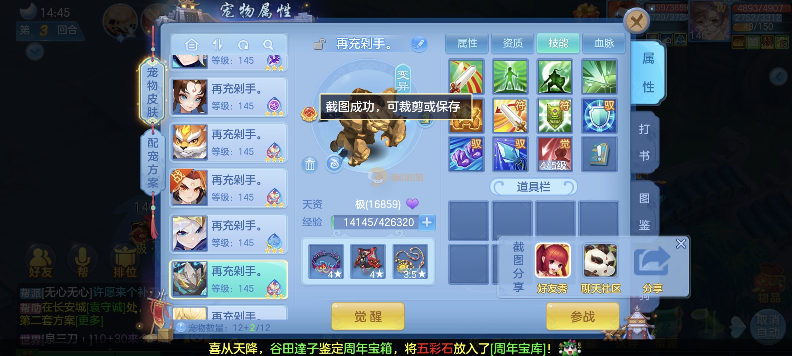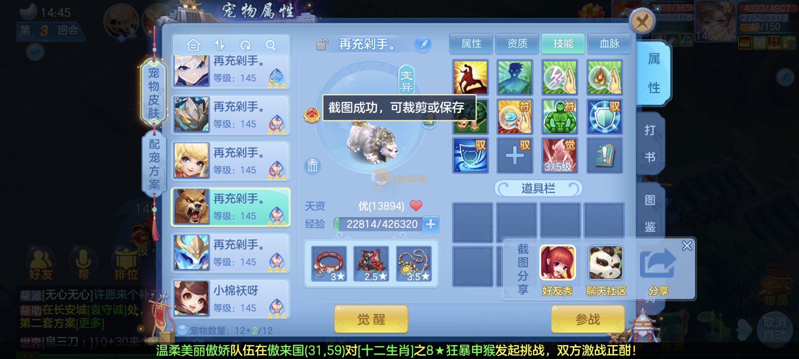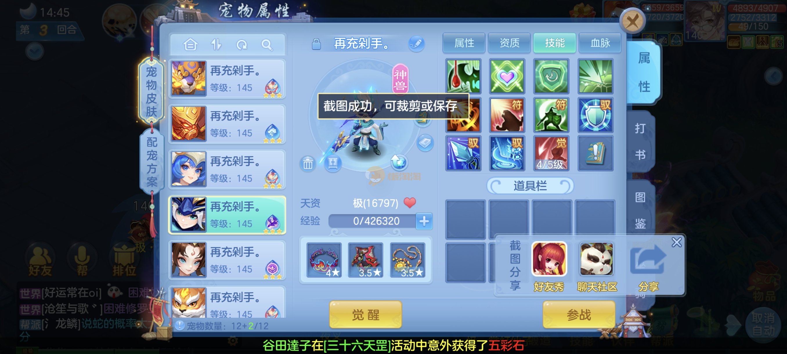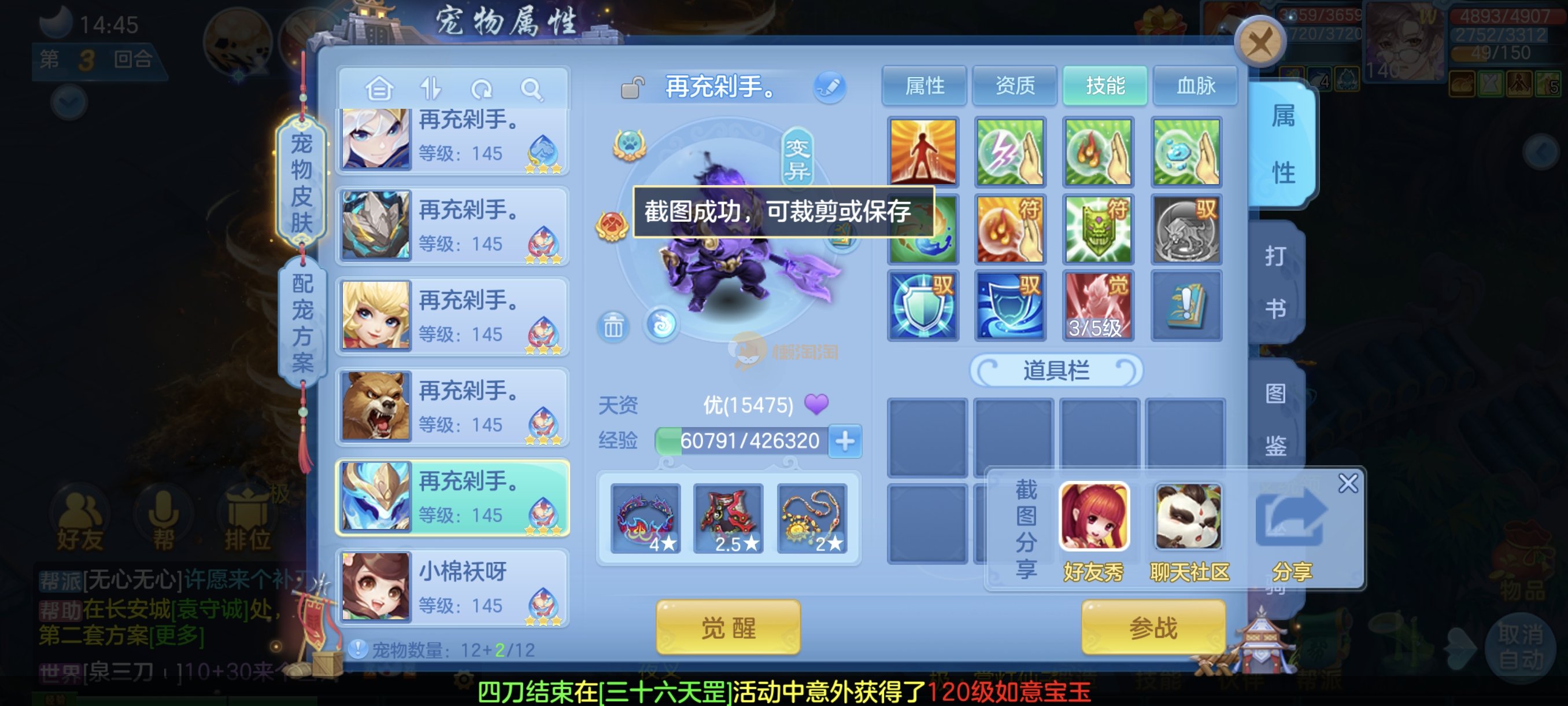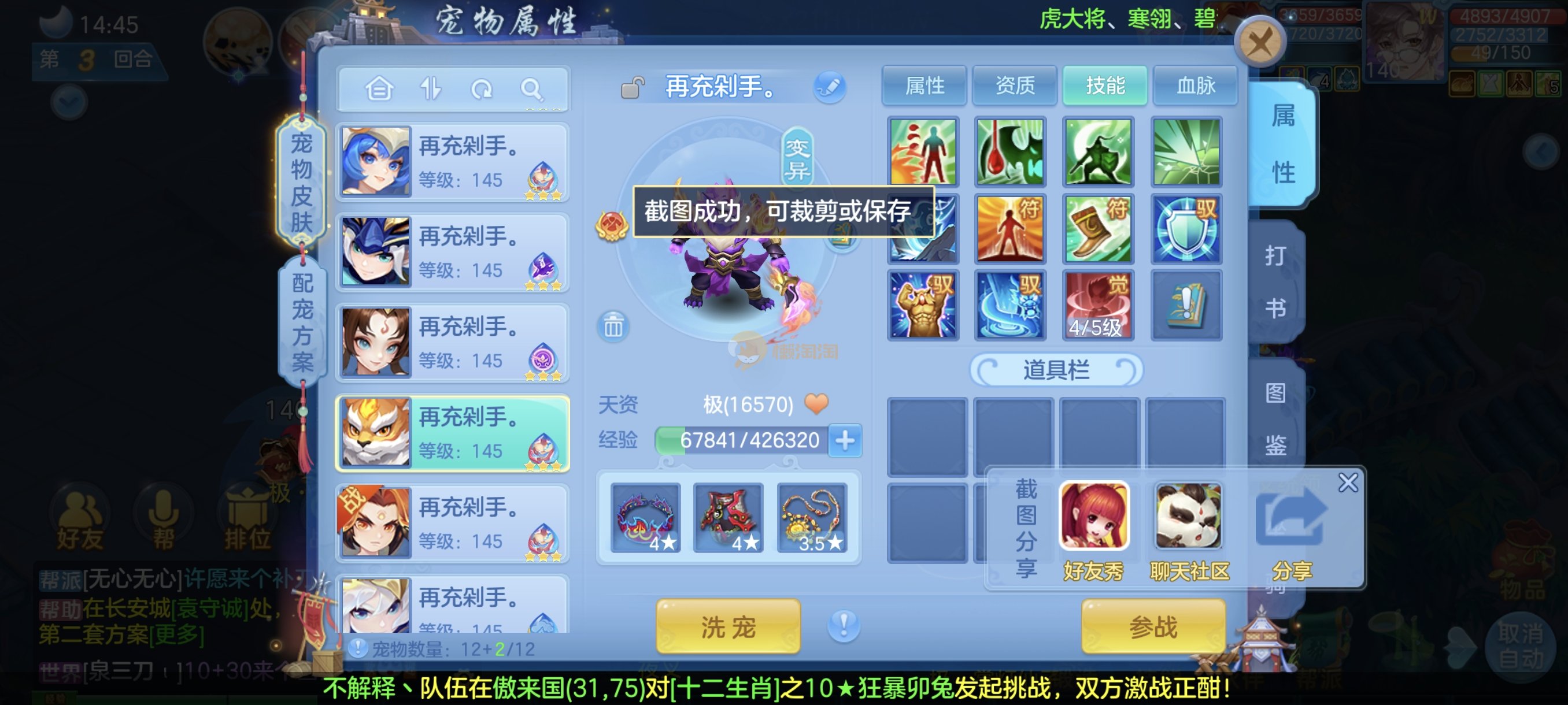 今年勇140男魔王,14段衣服13段项链,双红愤怒腰带 有玉龙和蛇 都只缺最后的强化 pk宝宝全 千速 尾速 首发老虎 首发孟婆 双红腰带 易成长高单加衣服 法爆武器,装备均单加42,高级坐骑龙 花2000金进化变身 ,1年换绑。不变卡1576灵 变卡1600无压力