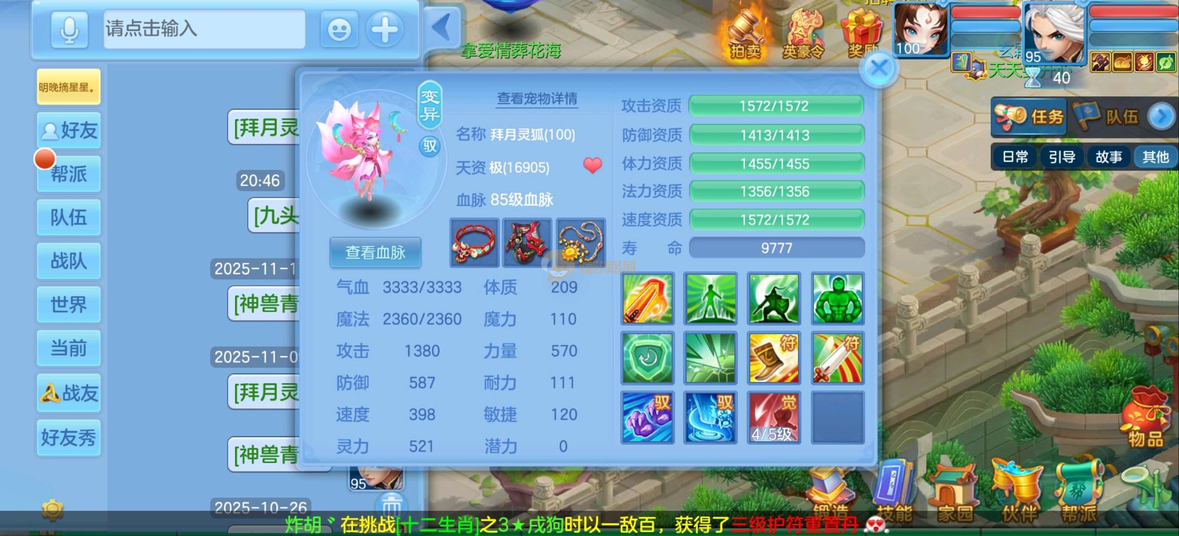 元宵情长95男无量,可卡级可跟服务器,11段,特技齐全,愤怒易腰带,神佑群净项链,双内丹神兽青蛇,天策孩子,2980邮箱,有双重。