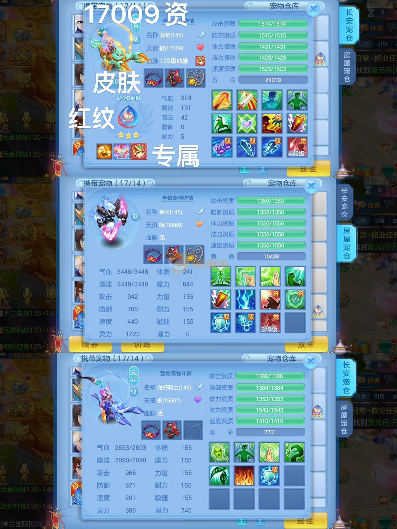 13段装备,10个红纹5专属血脉,不变卡2574攻,11个6技能宝宝,9只宠皮肤,神兽青蛇,6只满兽魂,4个高级坐骑,带4820金币,2980邮箱可以改密码关联手机