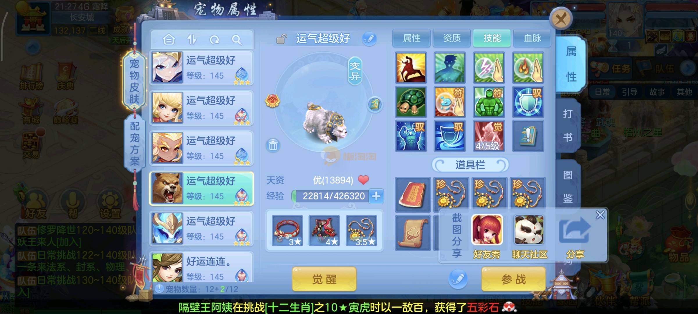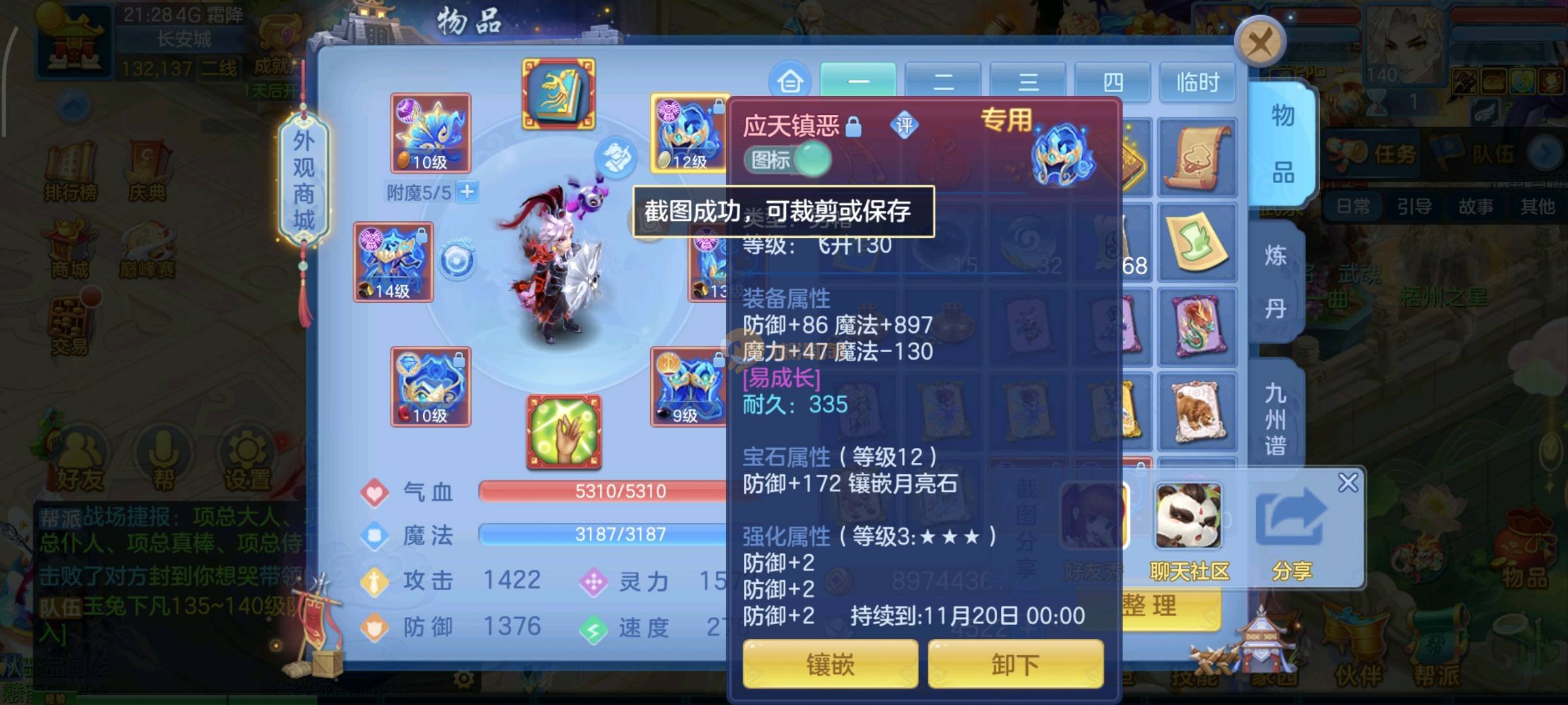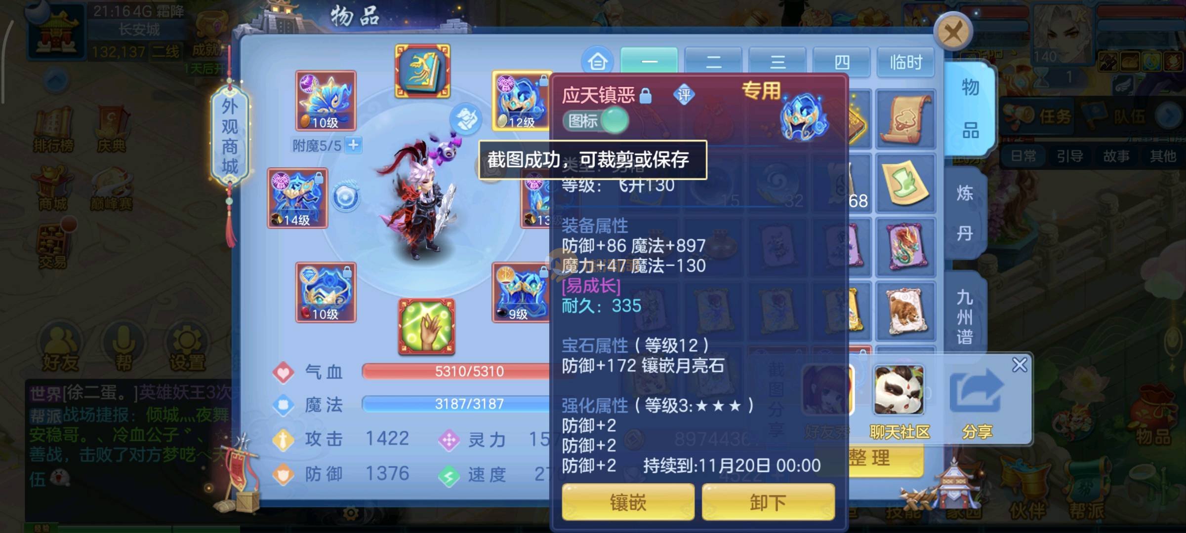 今年勇140男魔王,14段衣服13段项链,双红愤怒腰带 有玉龙和蛇 都只缺最后的强化 pk宝宝全 千速 尾速 首发老虎 首发孟婆 双红腰带 易成长高单加衣服 法爆武器,装备均单加42,高级坐骑龙 花2000金进化变身 ,1年换绑。不变卡1576灵 变卡1600无压力