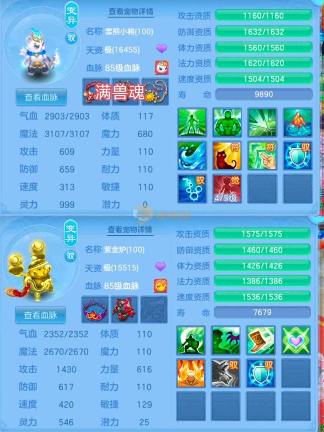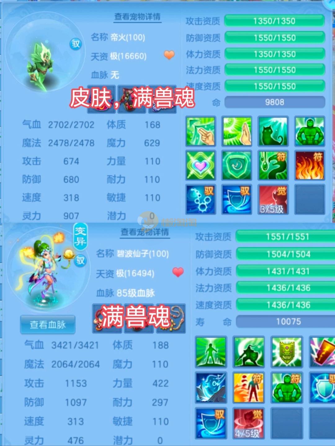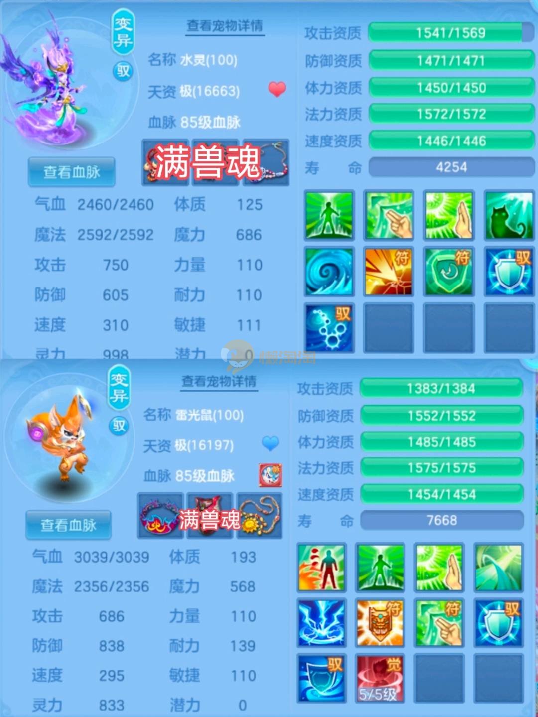 三神兽 均有内丹(剑气蛇兽魂满,法蛇兽魂5),雷光鼠(天赋+兽魂15),2童子(2天赋),2九头(2天赋,1皮肤),幽灵虎(天赋,5兽魂),浣熊大师(天
