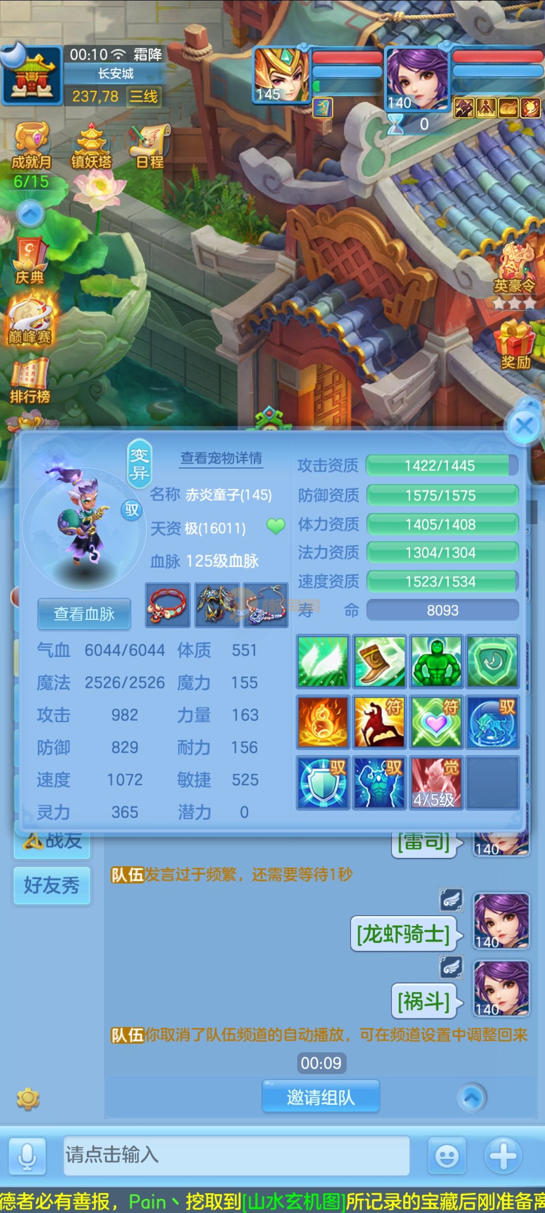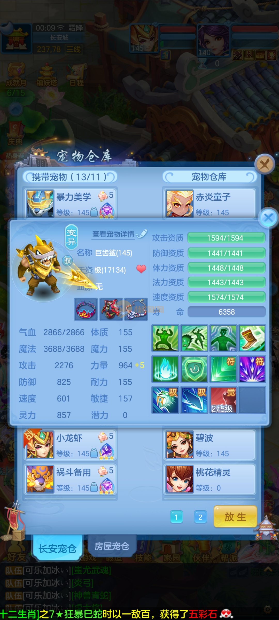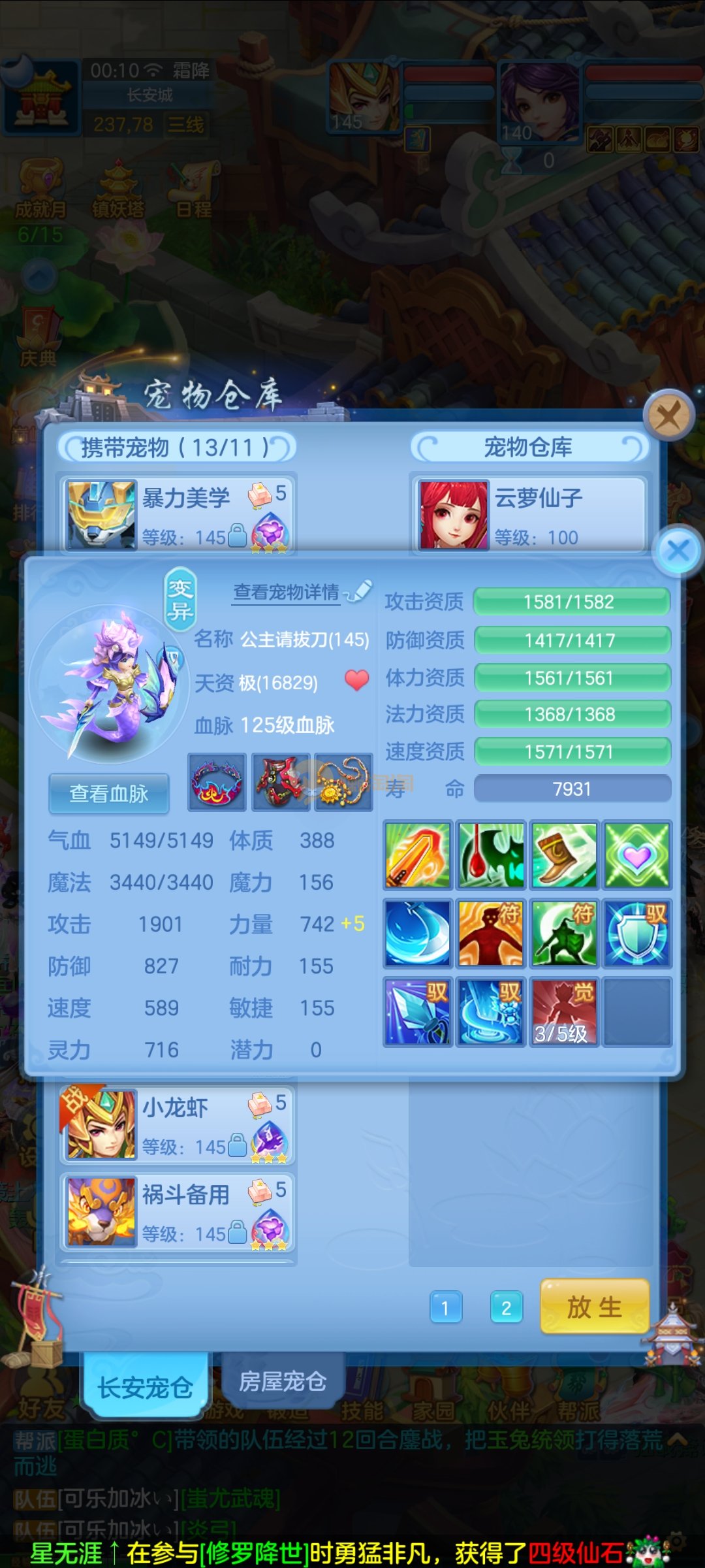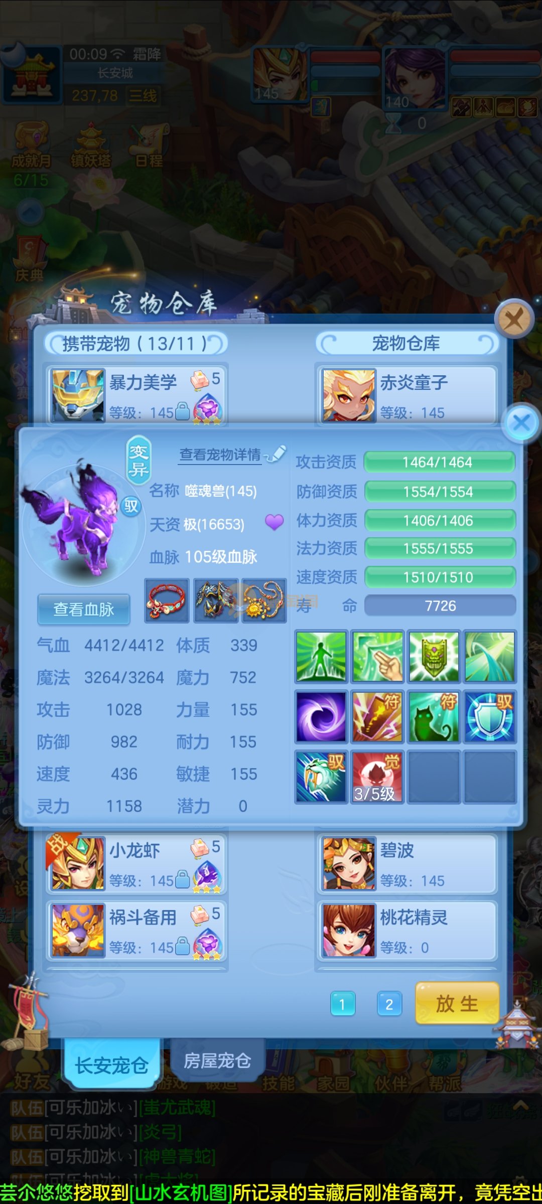极品1540灵祸斗,双公主,双雷丝,内丹神兽蛇,完美天策孩子,童子三个,红心冥煞,5个皮肤,6个满兽魂,宝宝齐全,各种难度没问题。