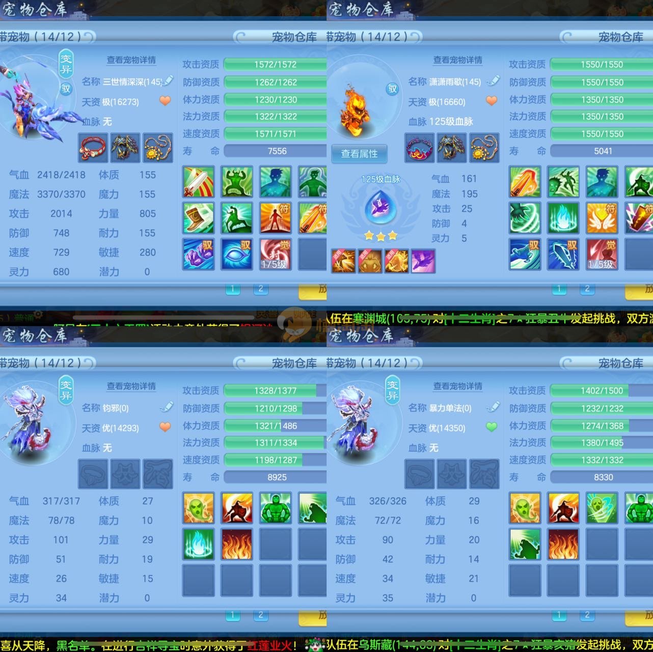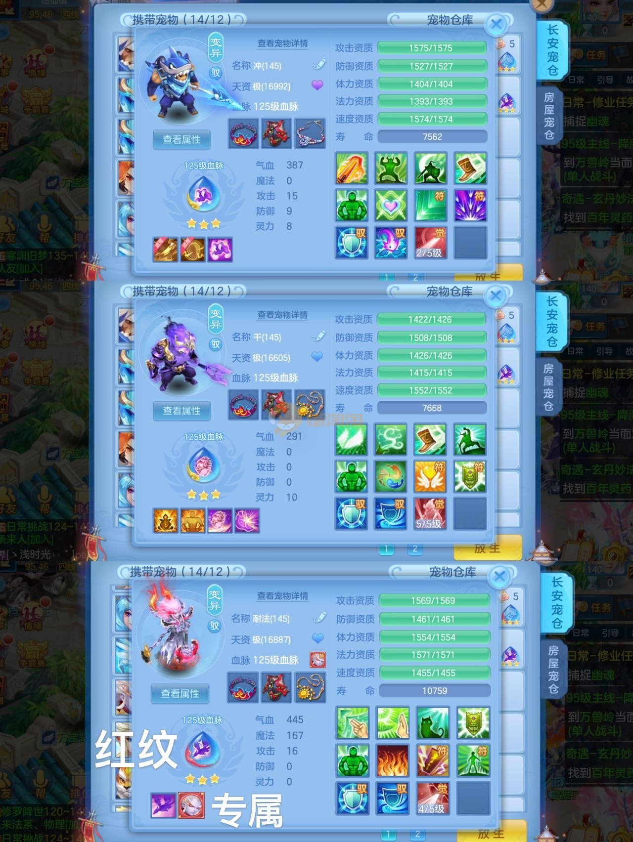 12个红纹5专属血脉,3件12段2星装备,带717万银子可上14段腰带,不变卡1503灵,12个6技能宝宝,高级坐骑,宠物皮肤,3只满兽魂,可以改密码关联手机