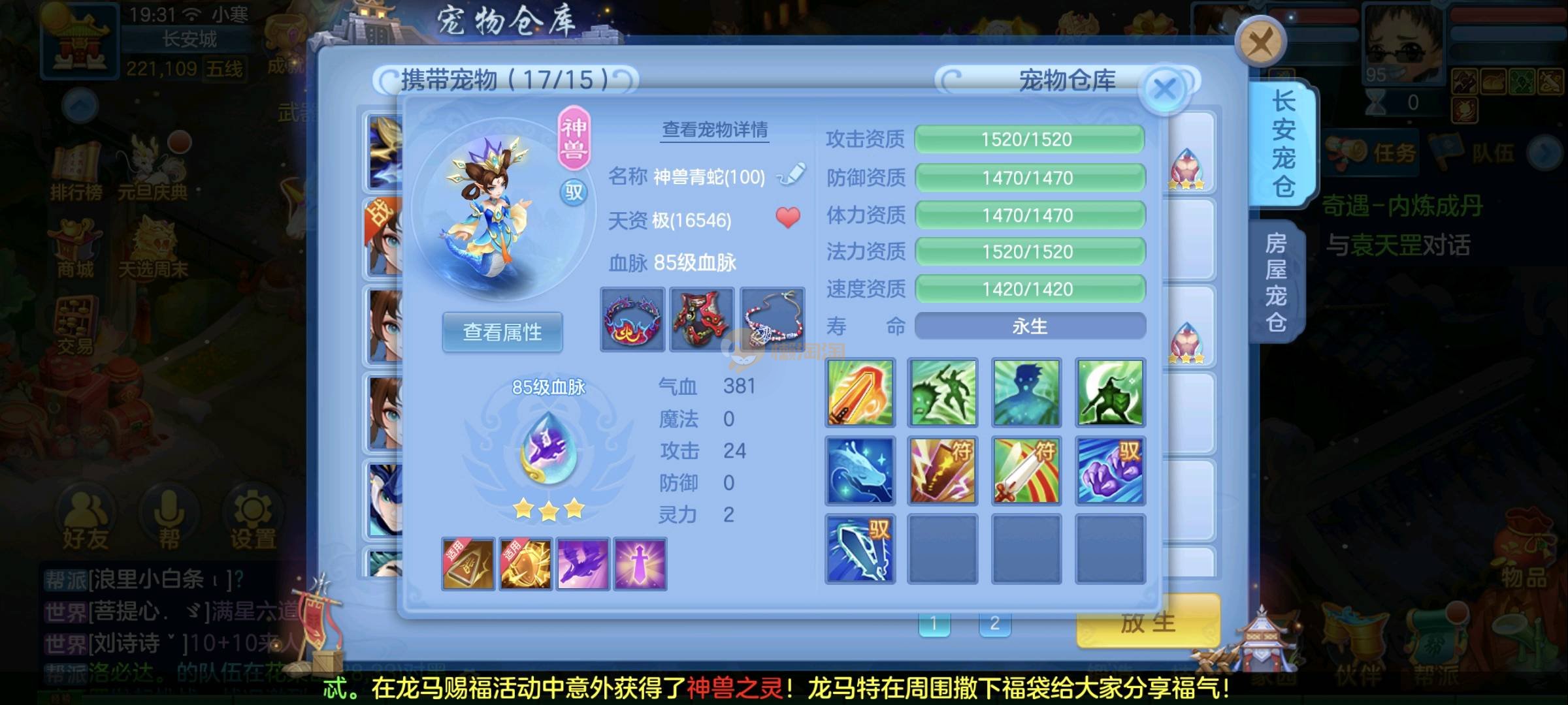 二020区 109男龙宫 1仙兽 23个满兽魂果的宝宝 18个宠物皮肤 8个高级坐骑 2980邮箱 1年换绑 验证码找懒懒