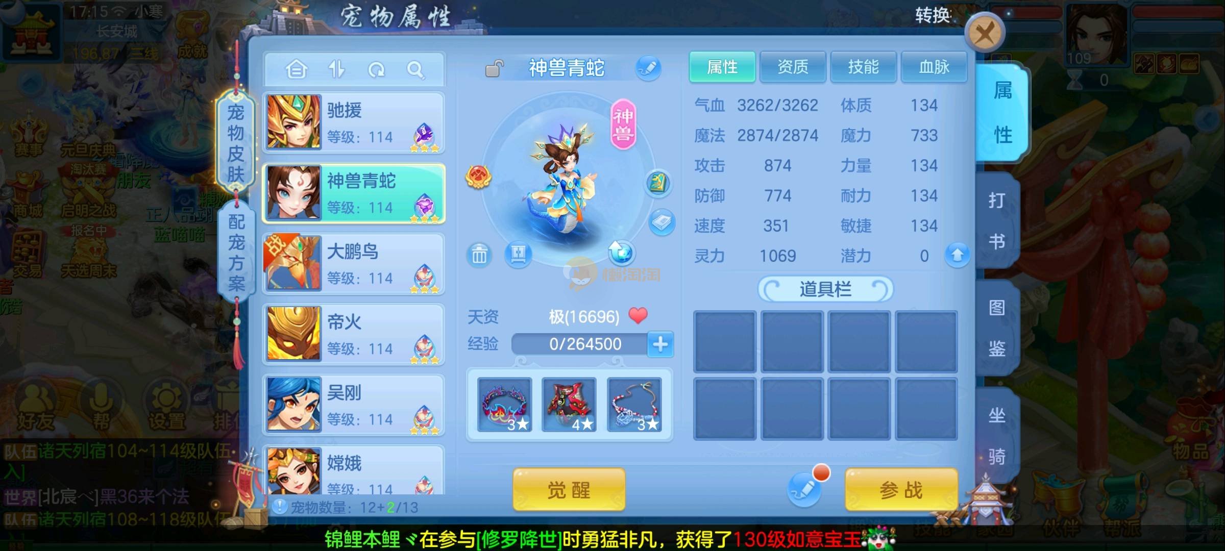三件满段三件12段 带高坐骑一皮肤 有内丹神兽蛇 15个成品宝宝 六个满兽魂 专属血脉四个 修炼啥的全满 上手直接玩 帮战日常难度任务无压力 新手练手绝佳