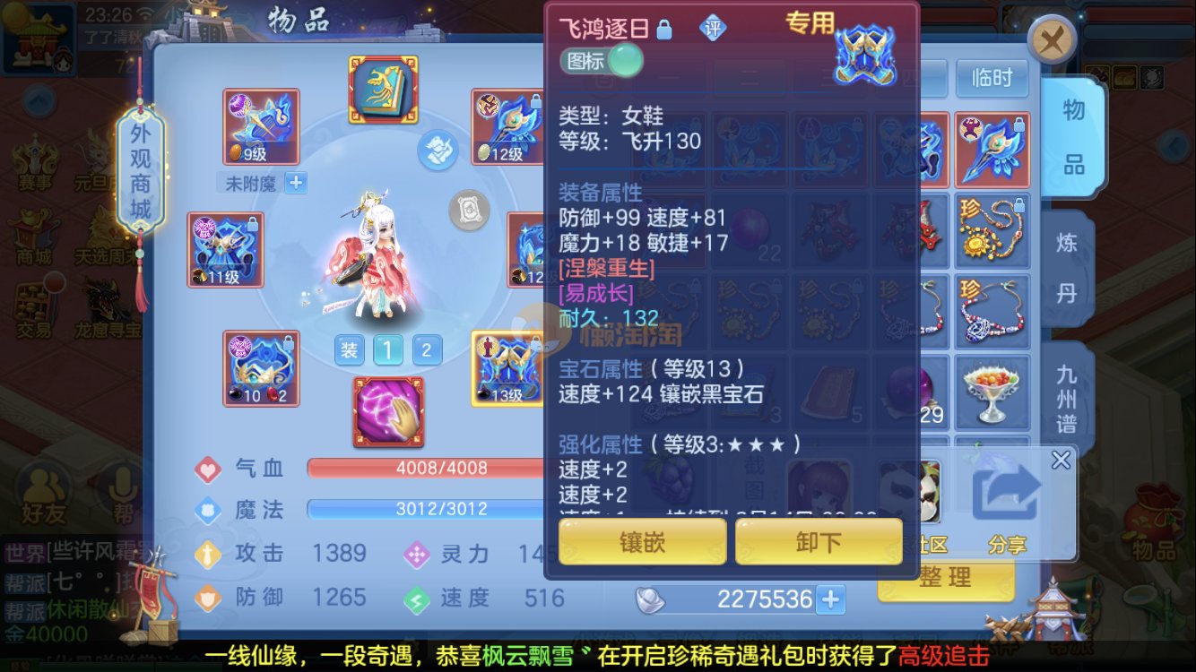 2023强力奶妈,任务一套装备打架一套,高级坐骑,2套坐骑加点,黑36一条随便打,装备齐全,上手直接打架,差14个出内丹,鞋子腰带衣服头12段,细节看图