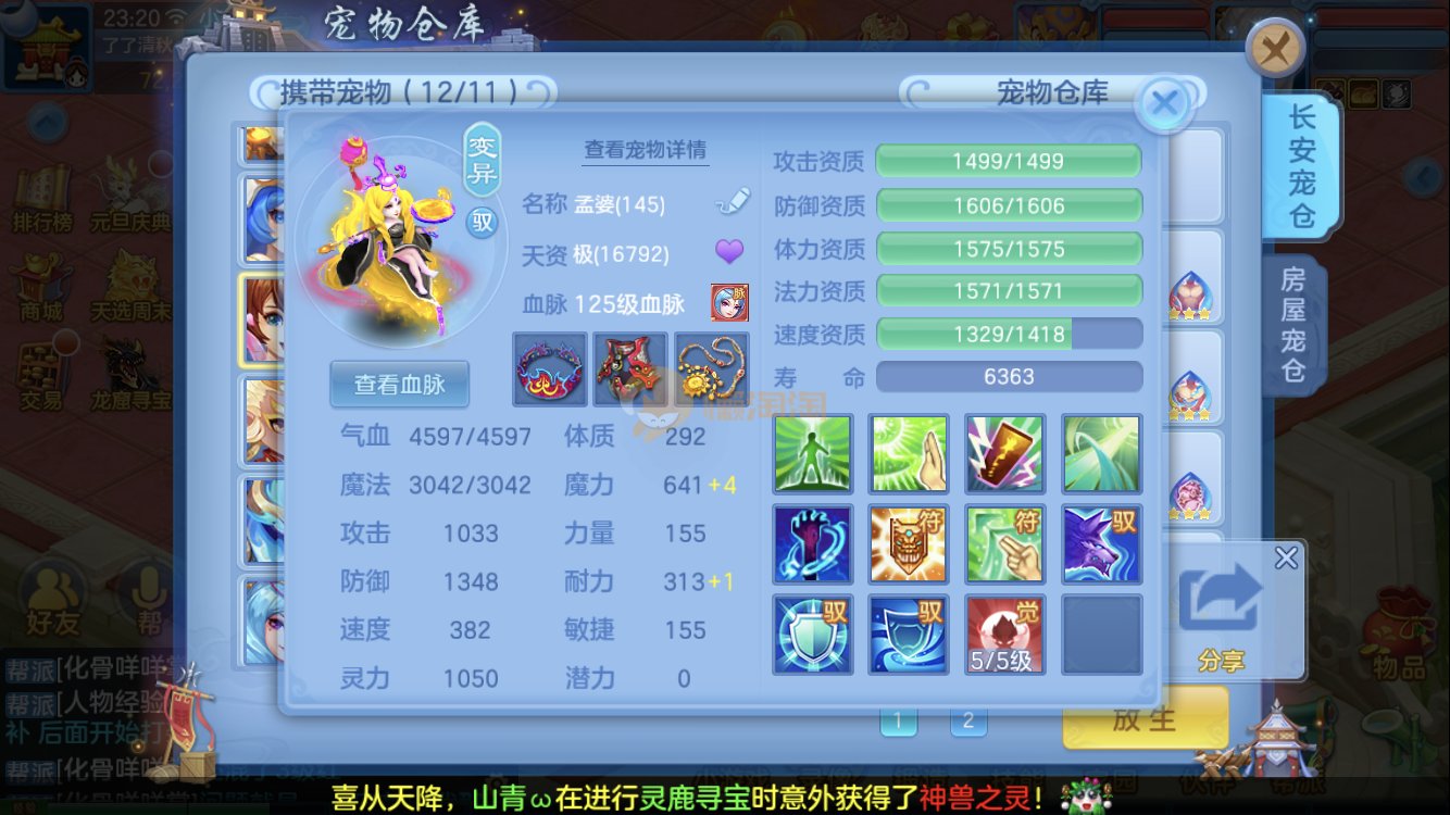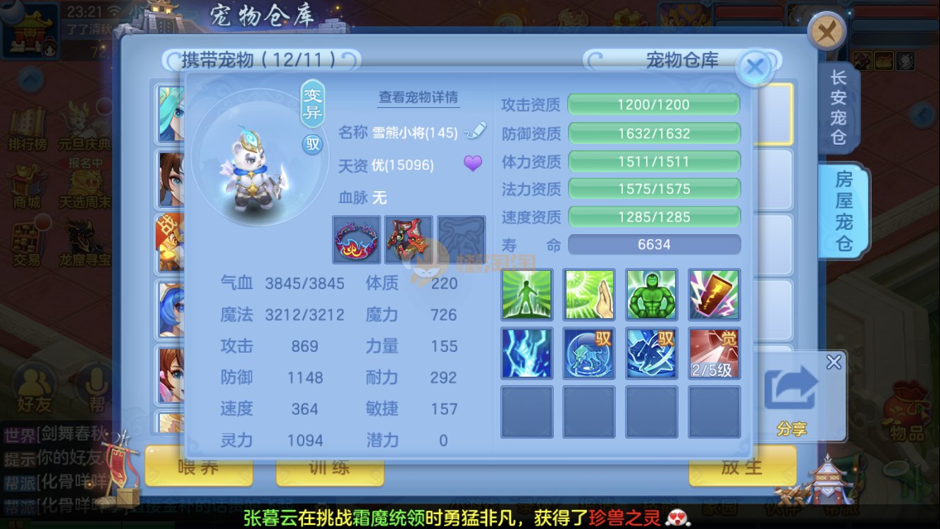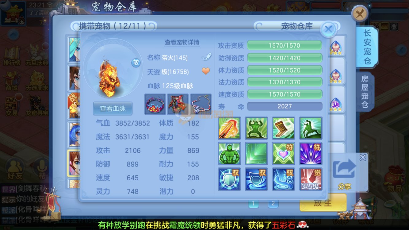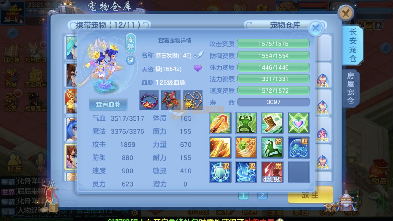 满家具,有装备可转辅助封,爆资质老虎,童子,祸斗,寒翎,双倍充值,易激励/易五雷头,满伤武器,双内丹神兽