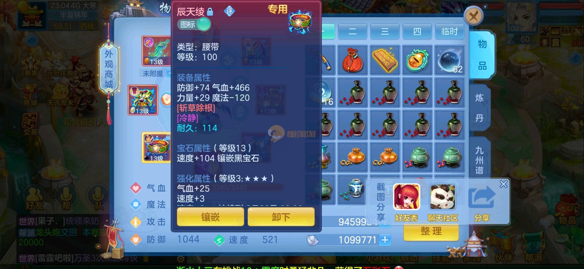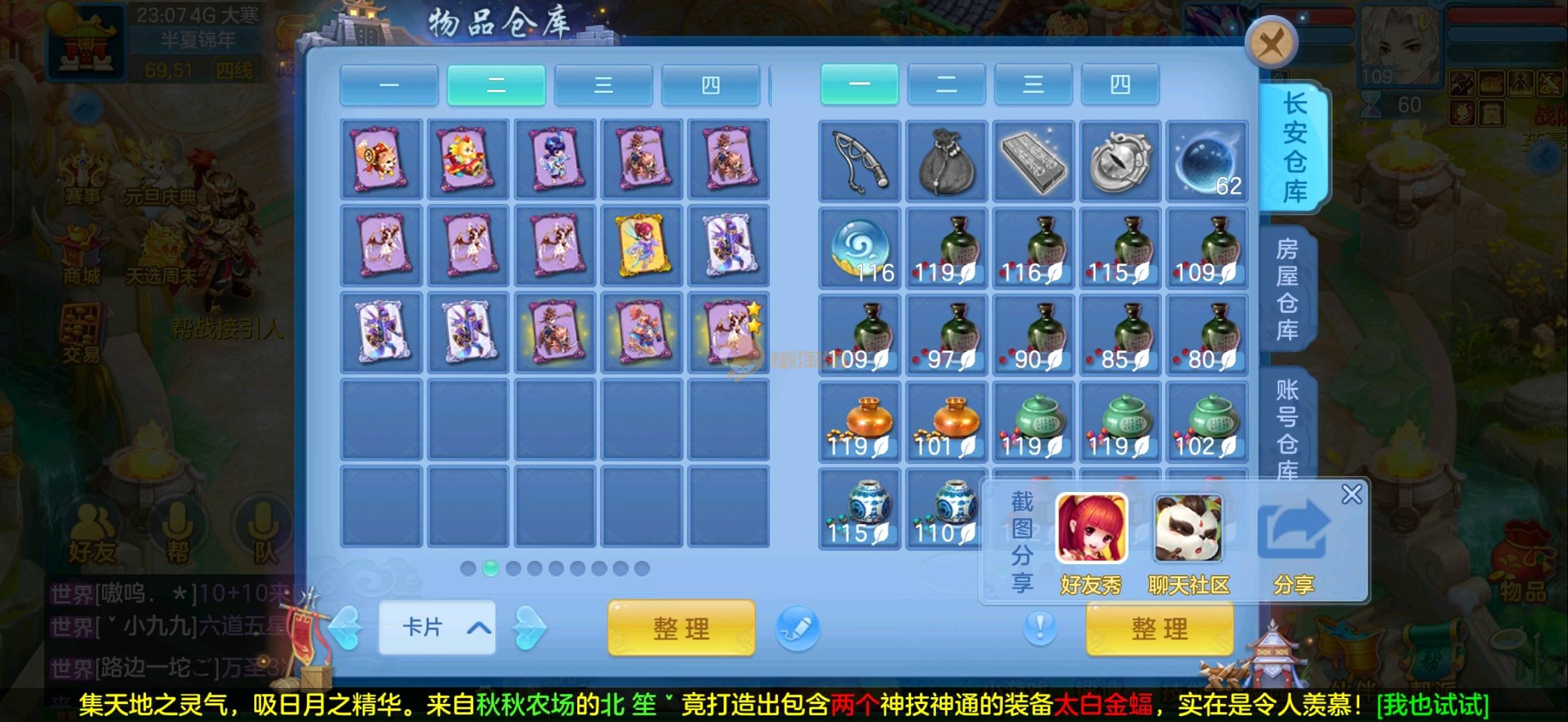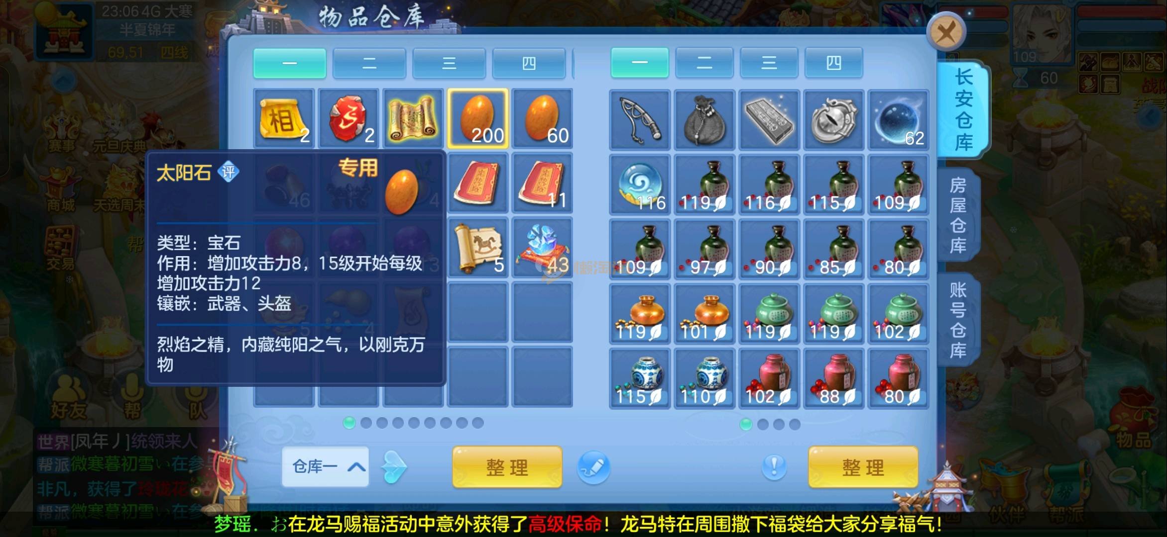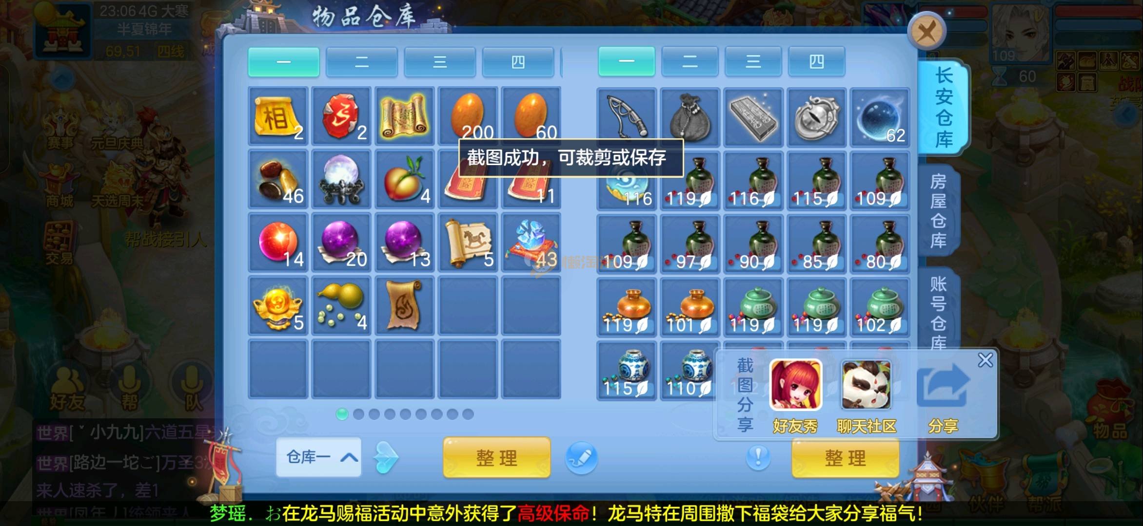 志气冲天109全13段狮子 1强化仙2内胆蛇仓库还多余两个内胆 上手直接打架 各种宝宝齐全仓库还有十多只 带200万银启动资金 过年没钱了便宜卖