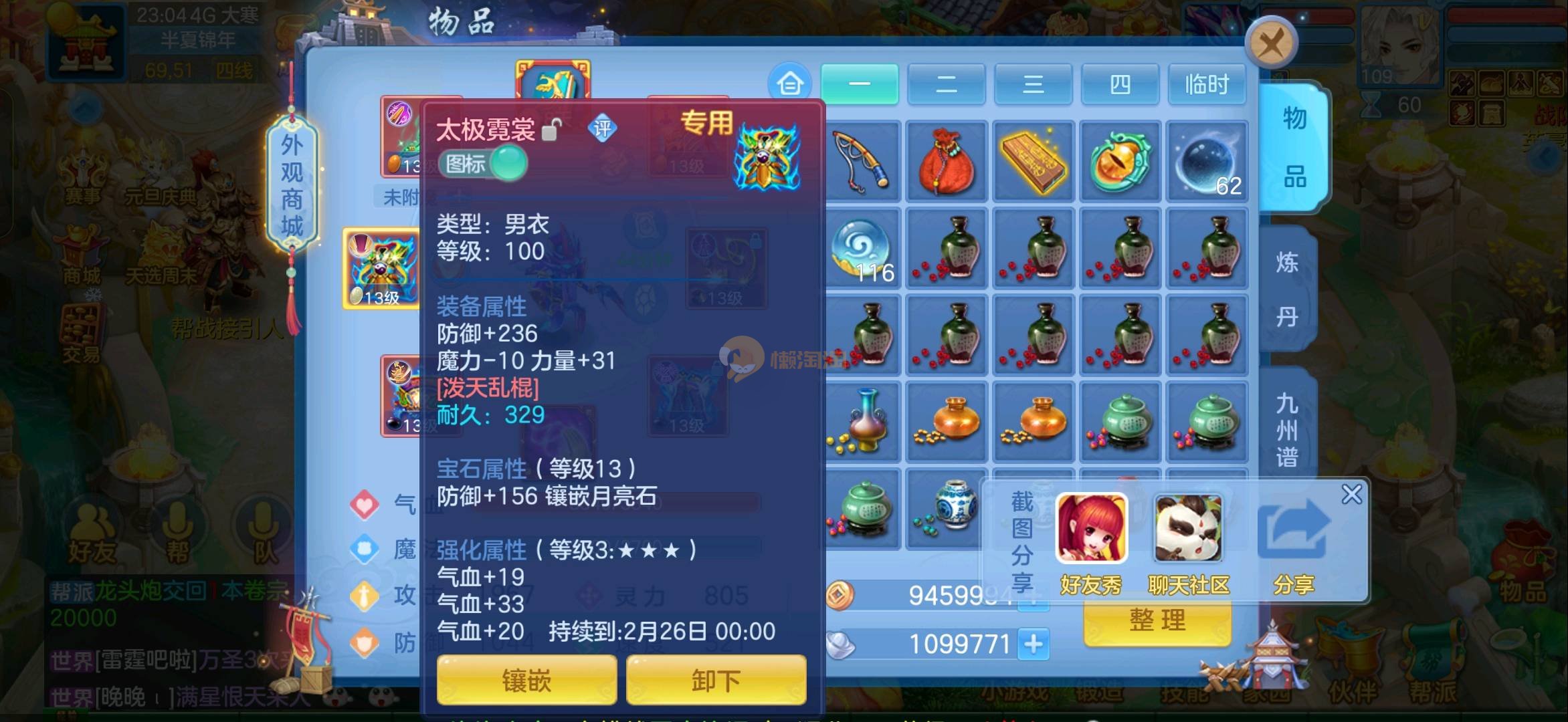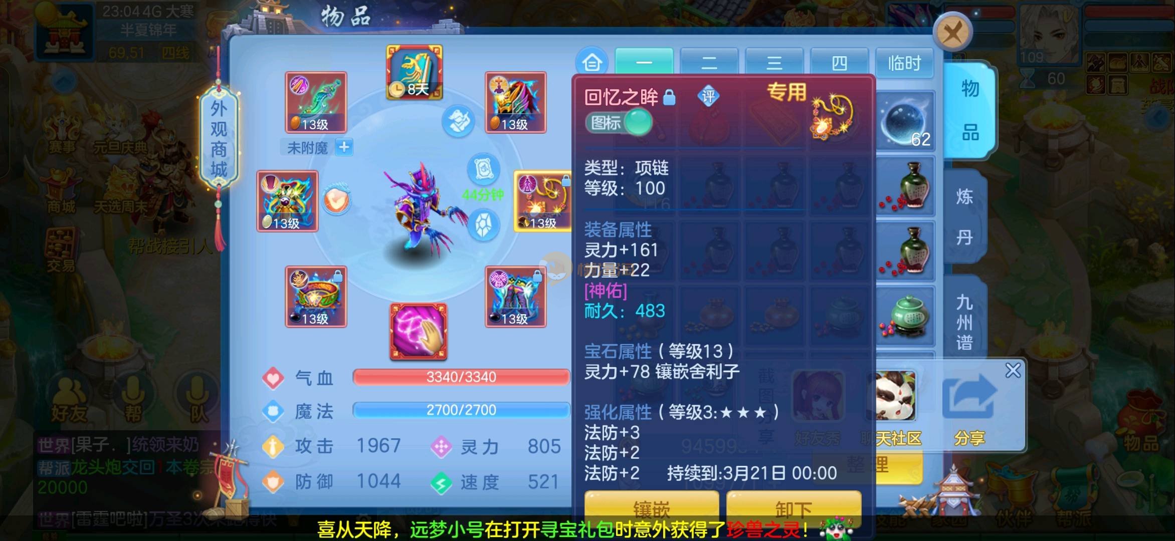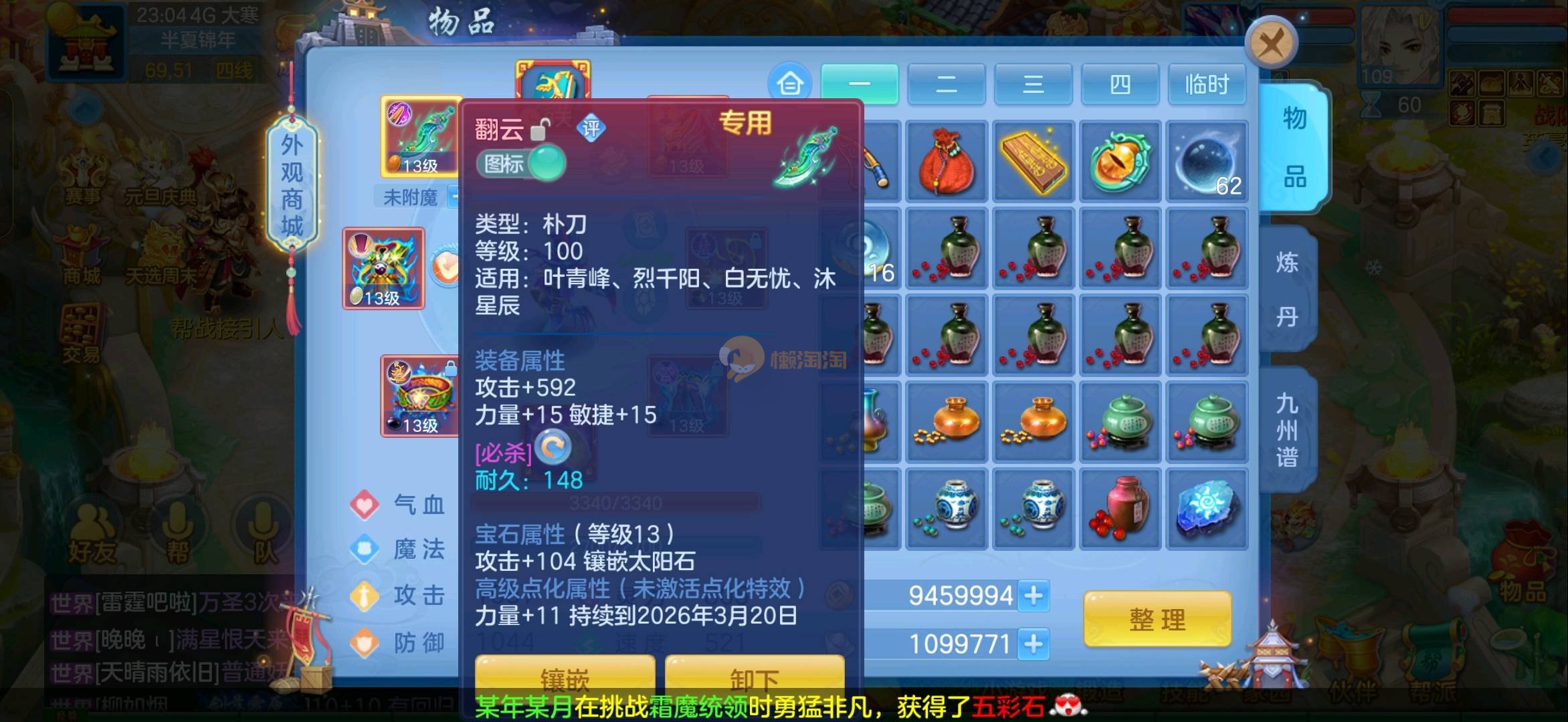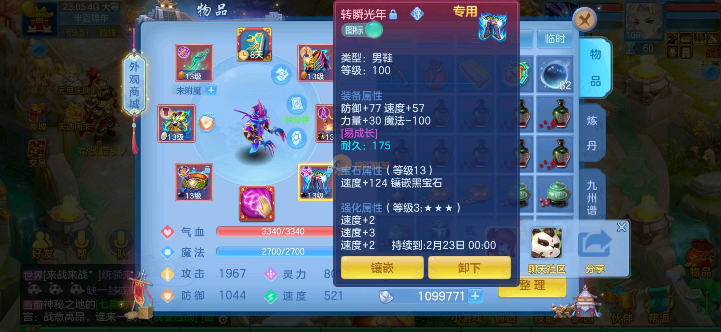 志气冲天109全13段狮子 1强化仙2内胆蛇仓库还多余两个内胆 上手直接打架 各种宝宝齐全仓库还有十多只 带200万银启动资金 过年没钱了便宜卖