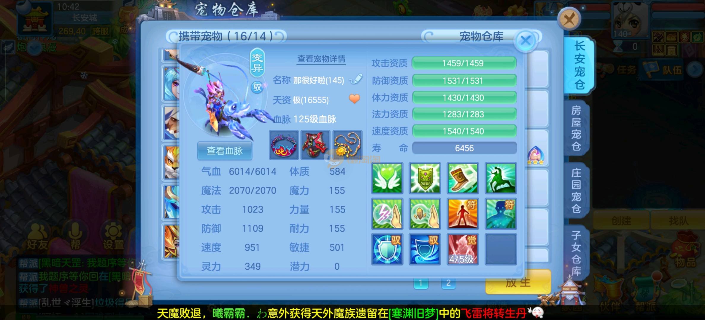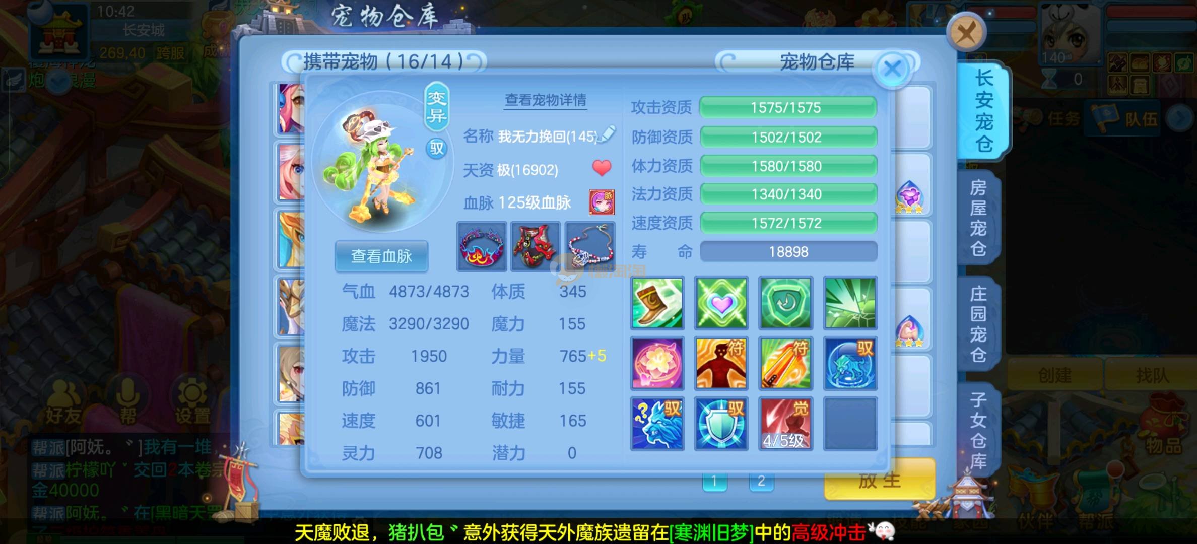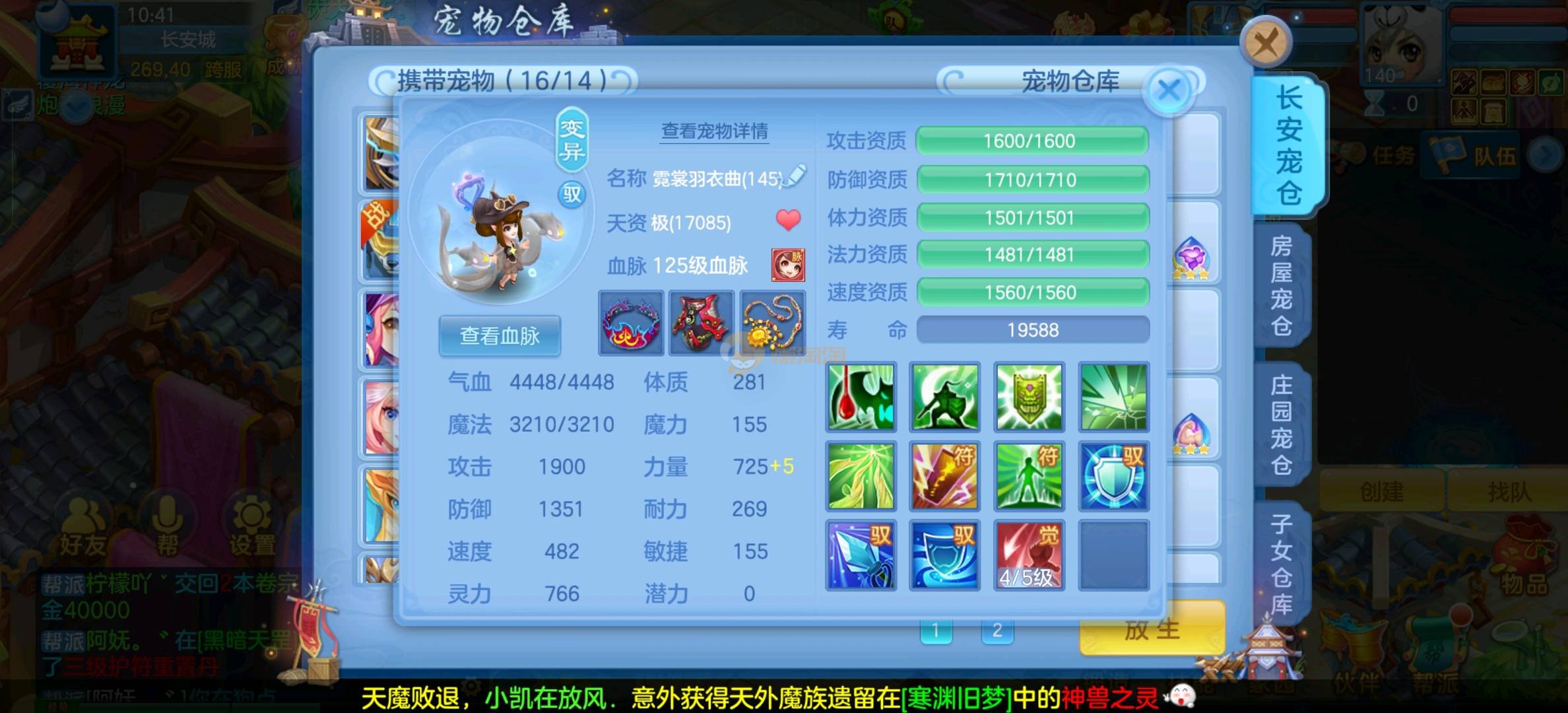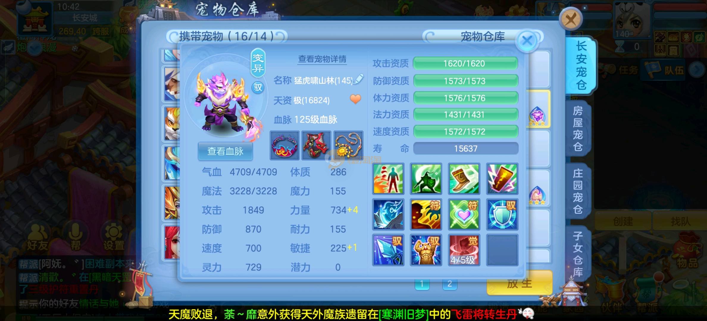 今年勇 140男魔王,三件14.4,不变卡灵力防御双1570+,变卡双1600+ 14个满兽魂宝宝 11专属血脉 5宠物皮肤 无双重,带庄园2980邮箱 1年换绑 验证码找懒懒