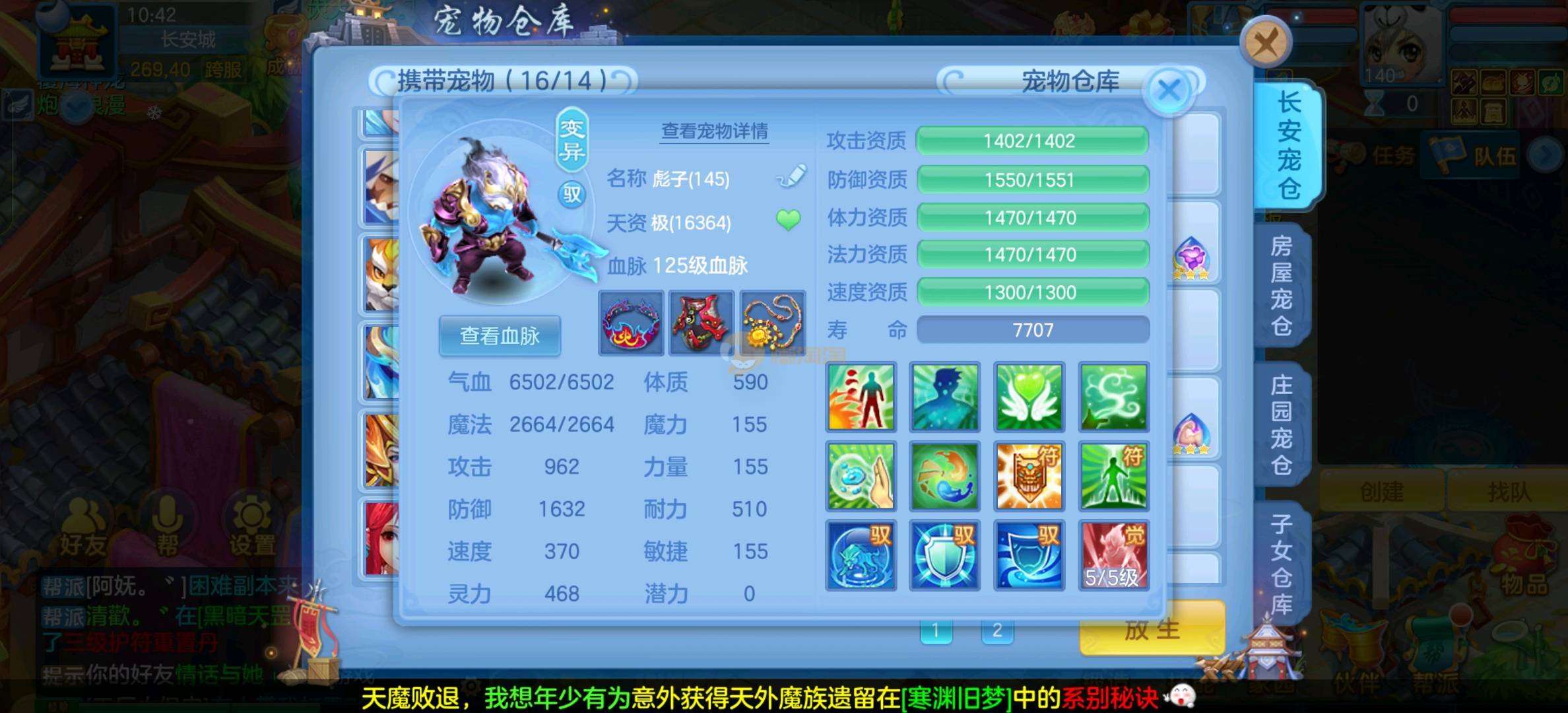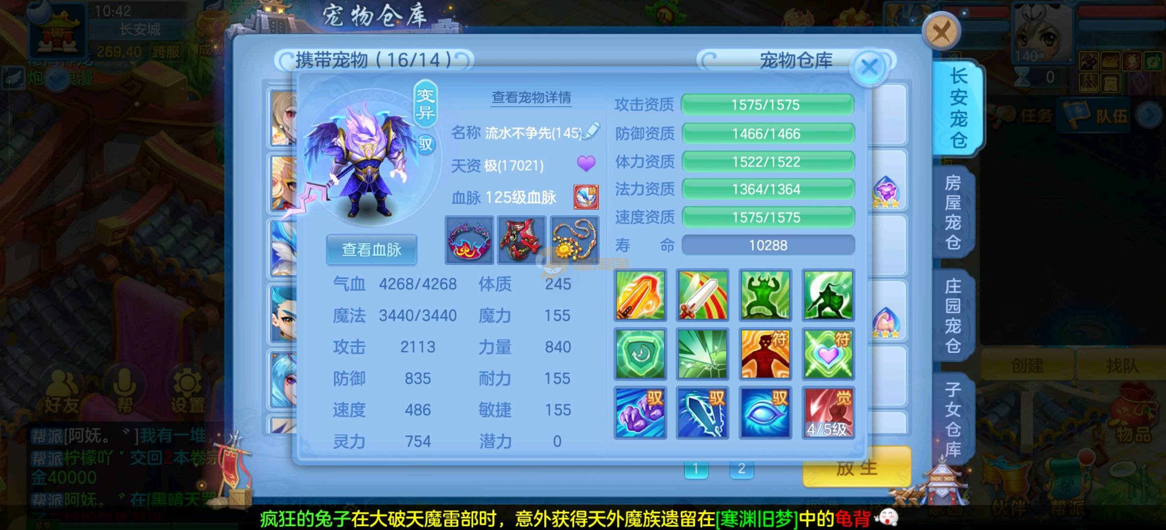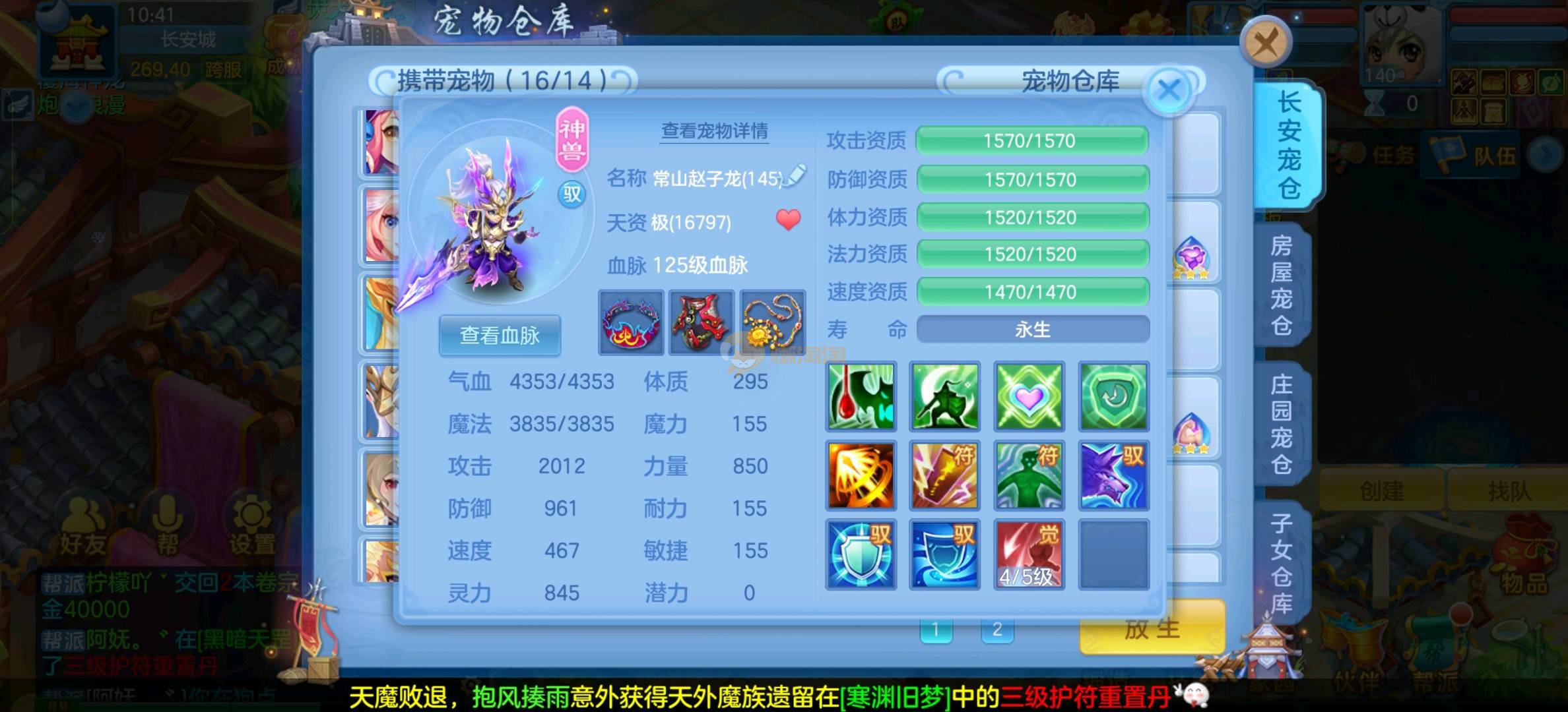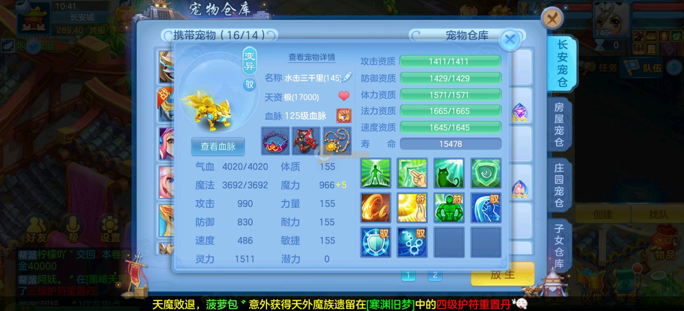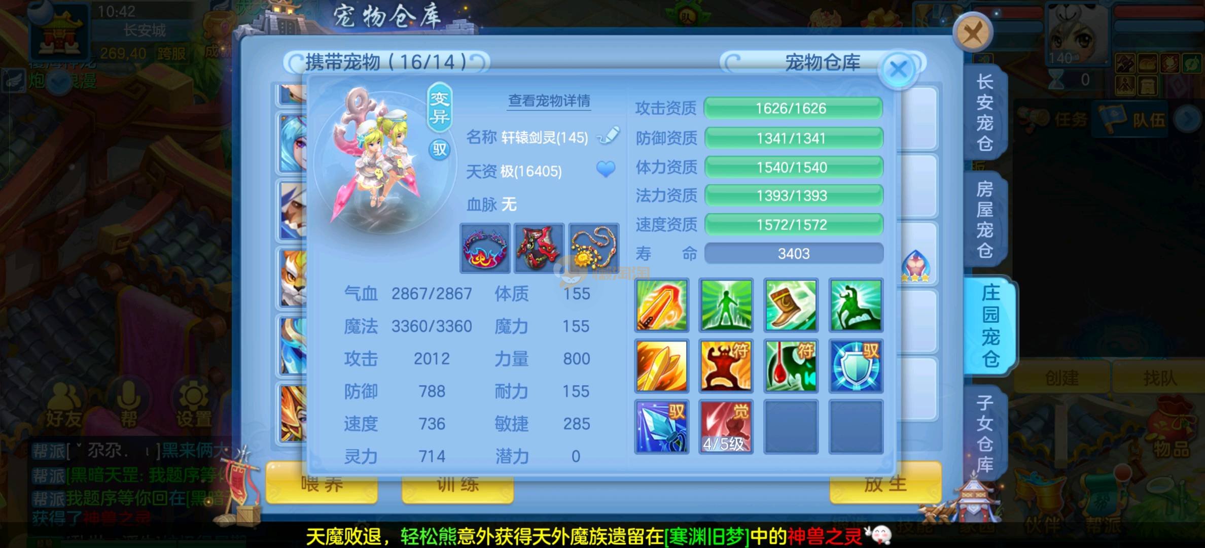 今年勇 140男魔王,三件14.4,不变卡灵力防御双1570+,变卡双1600+ 14个满兽魂宝宝 11专属血脉 5宠物皮肤 无双重,带庄园2980邮箱 1年换绑 验证码找懒懒