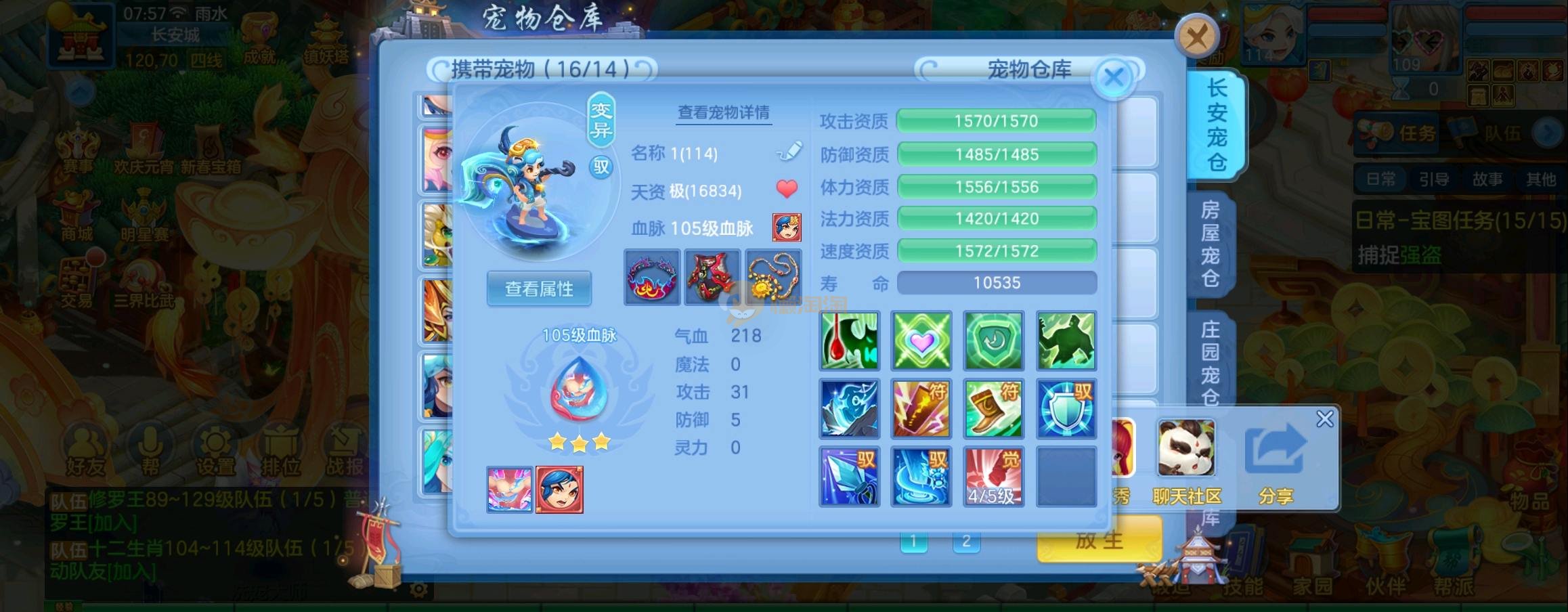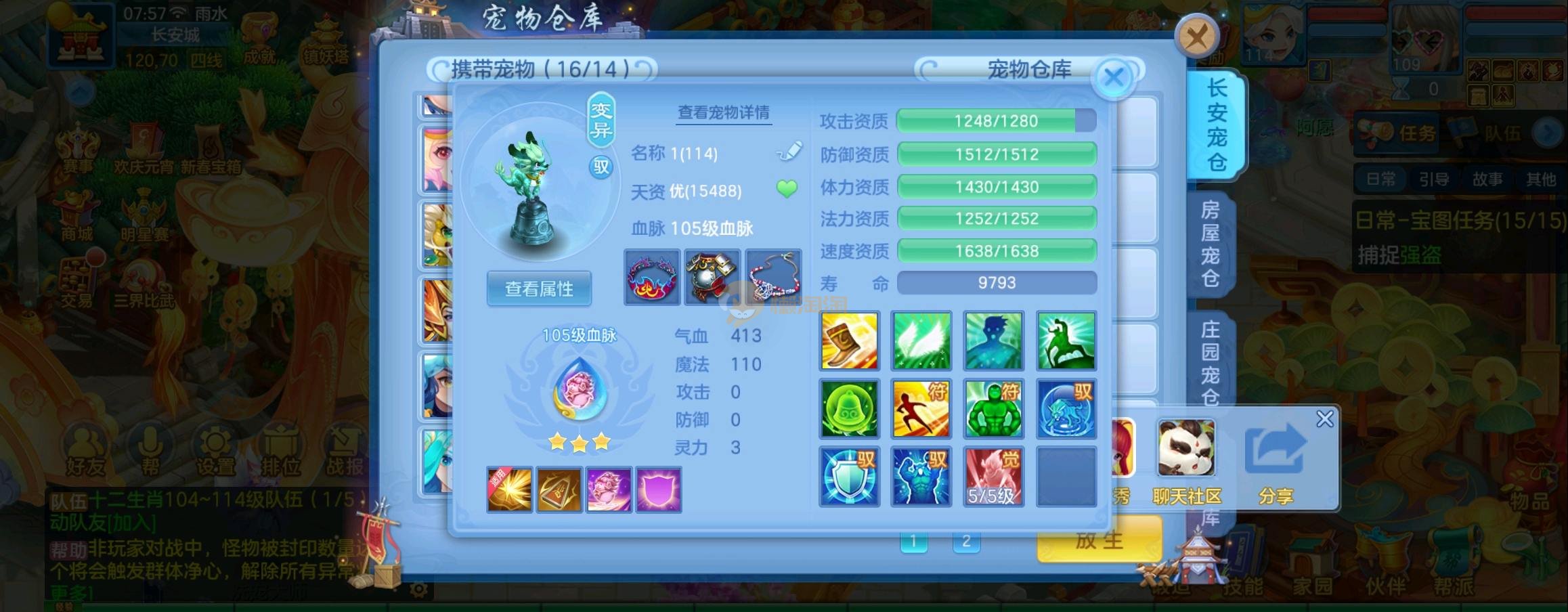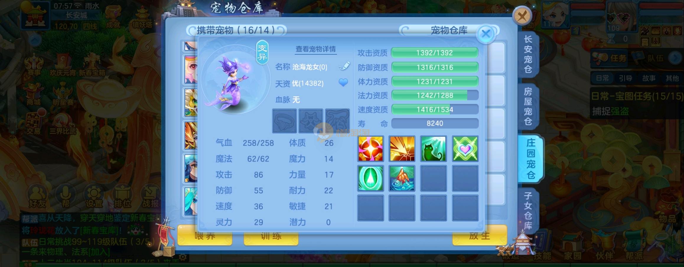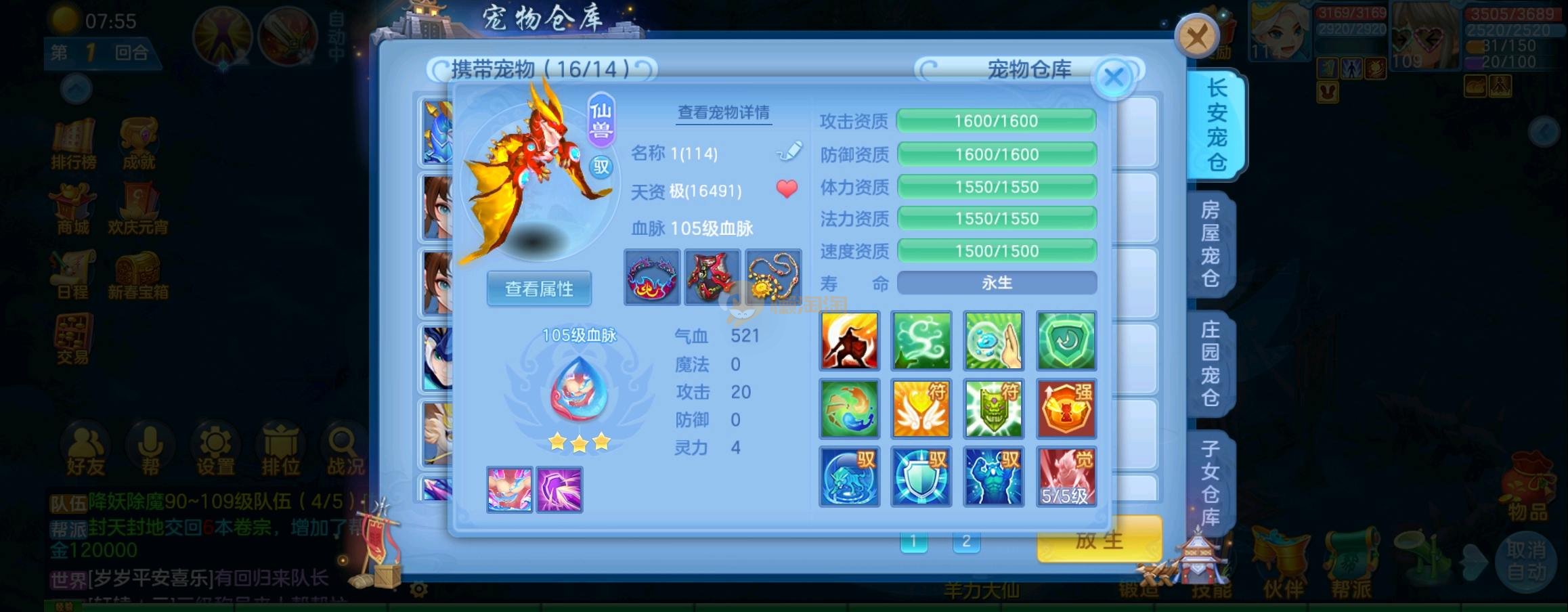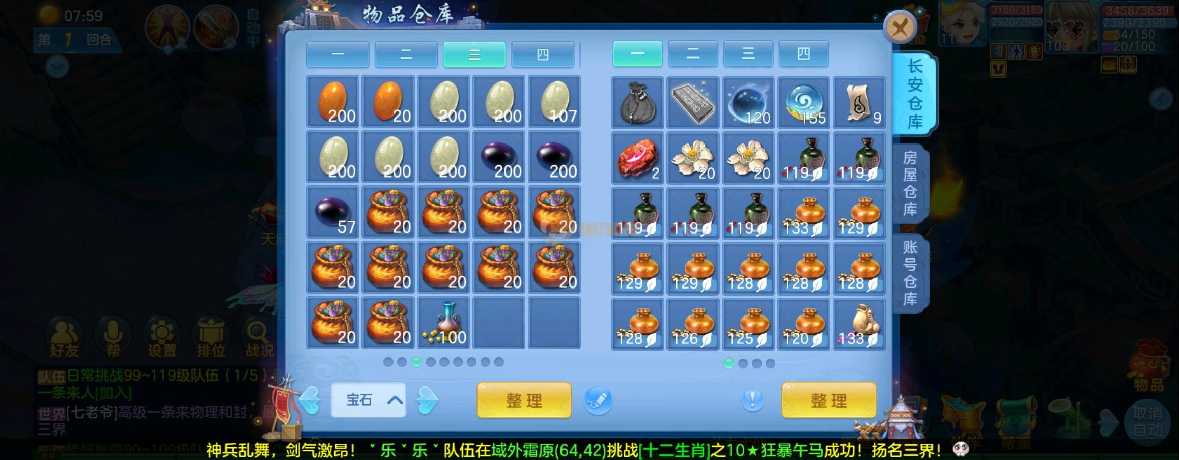 装备毕业,宝宝齐全,新版成就宠寒翎,坐狮,蒲牢全有,双葫芦娃天赋,仓库还有很多兽魂果,第五个内胆马上合成。