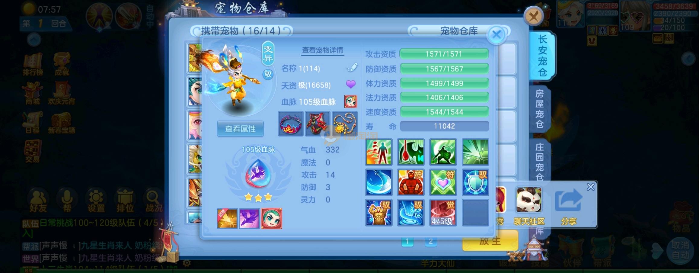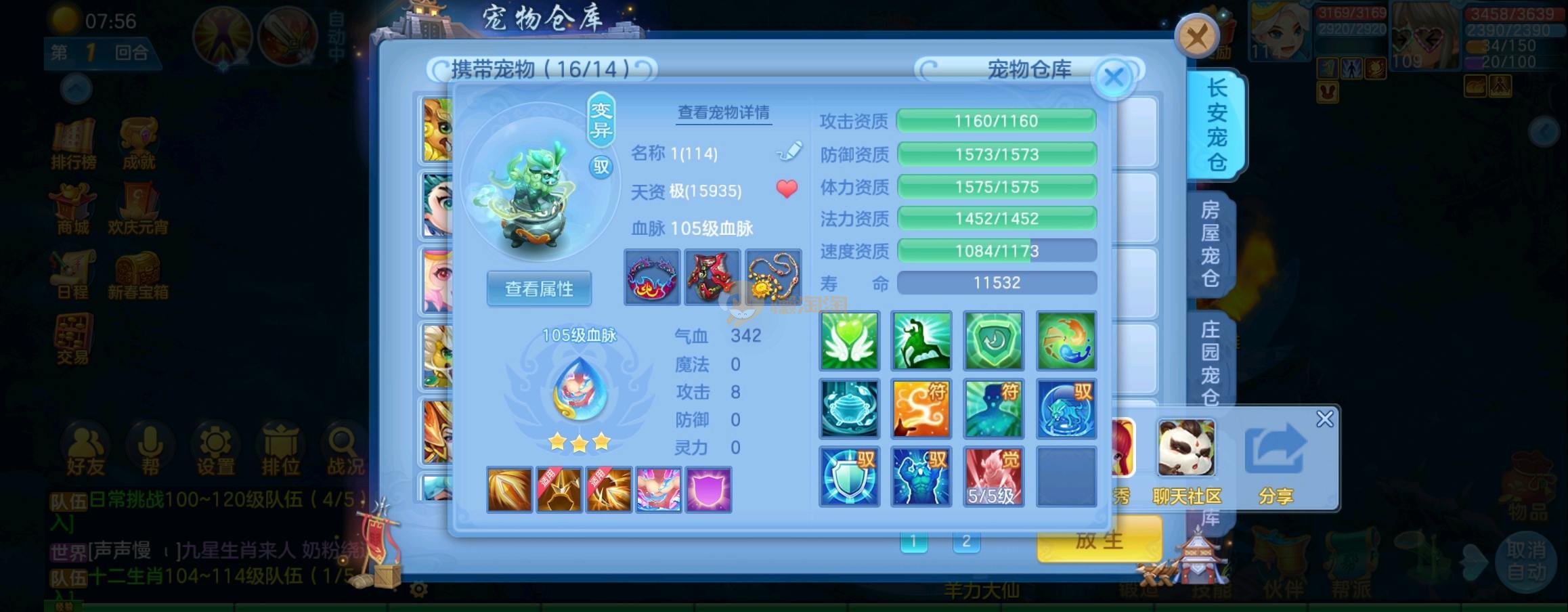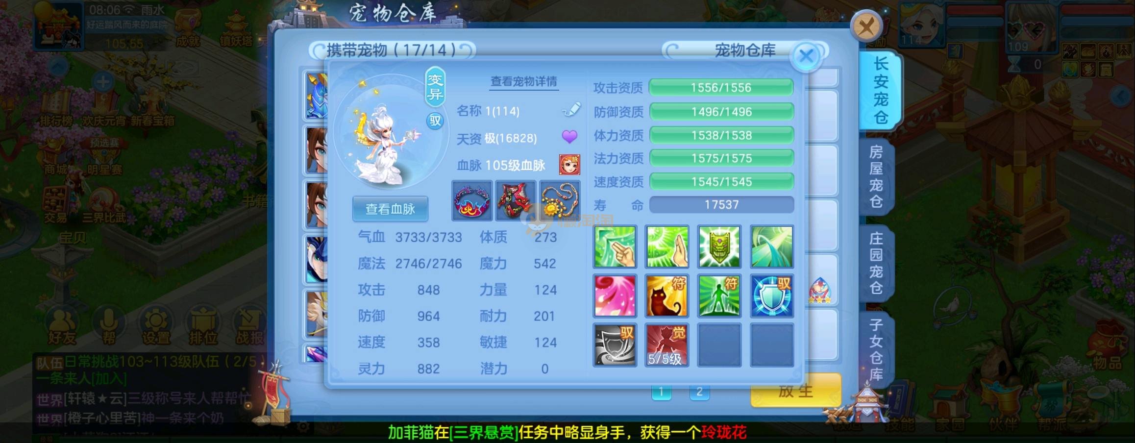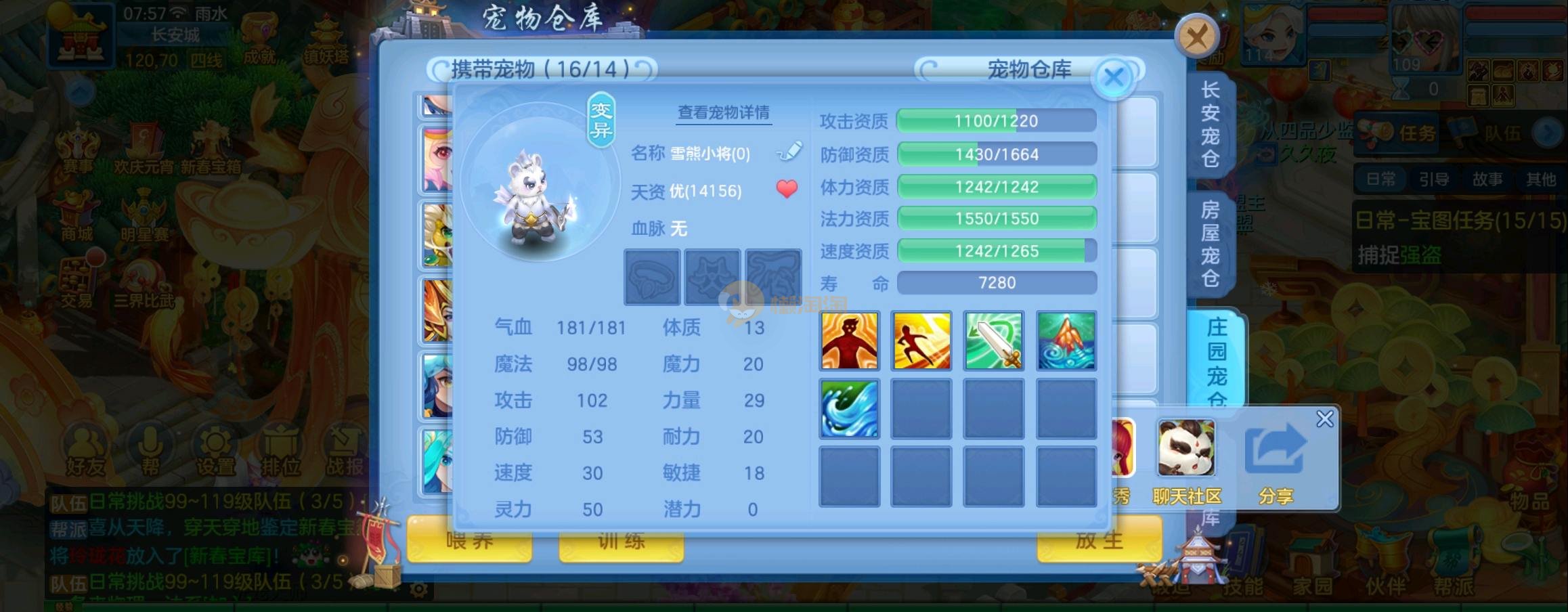 装备毕业,宝宝齐全,新版成就宠寒翎,坐狮,蒲牢全有,双葫芦娃天赋,仓库还有很多兽魂果,第五个内胆马上合成。