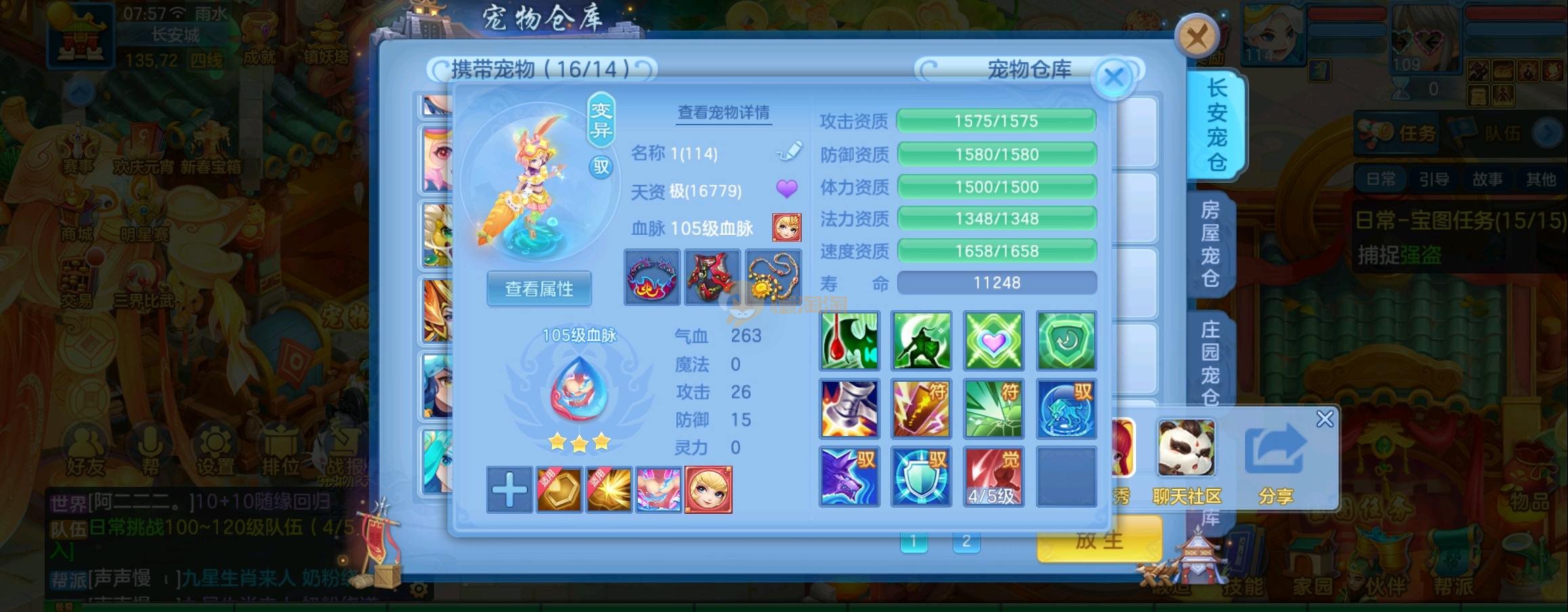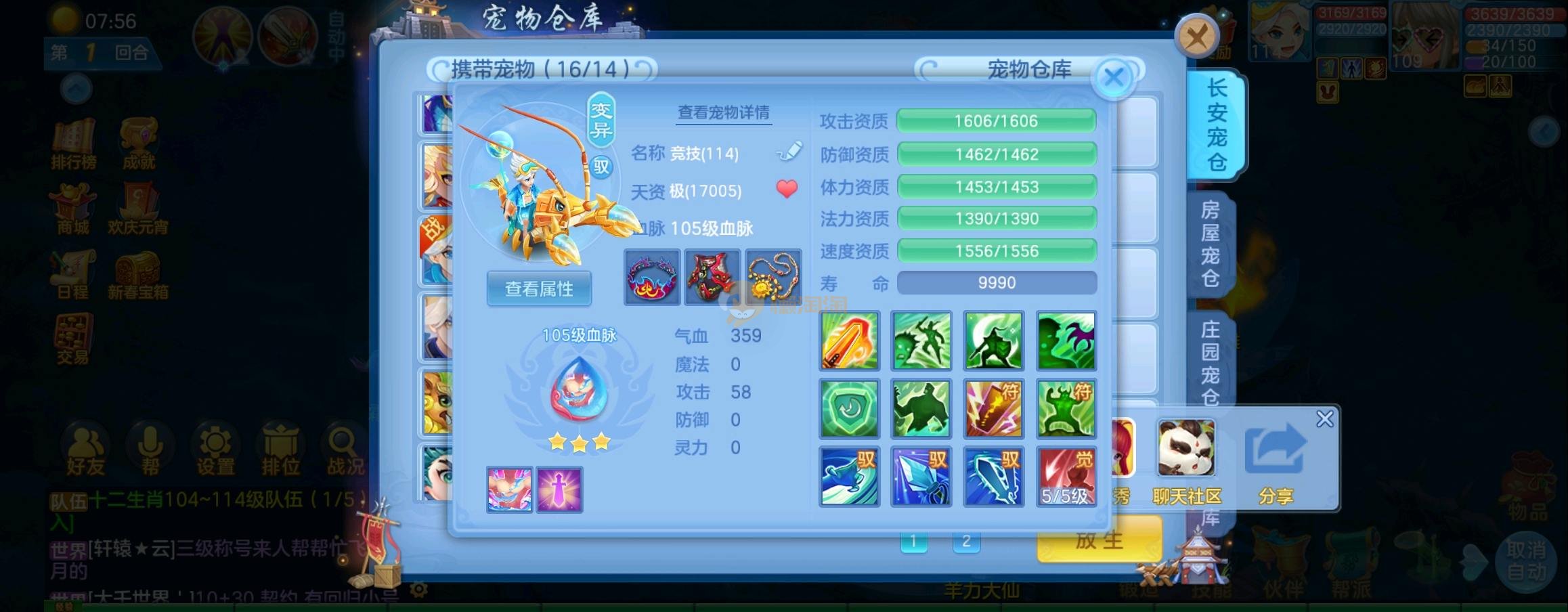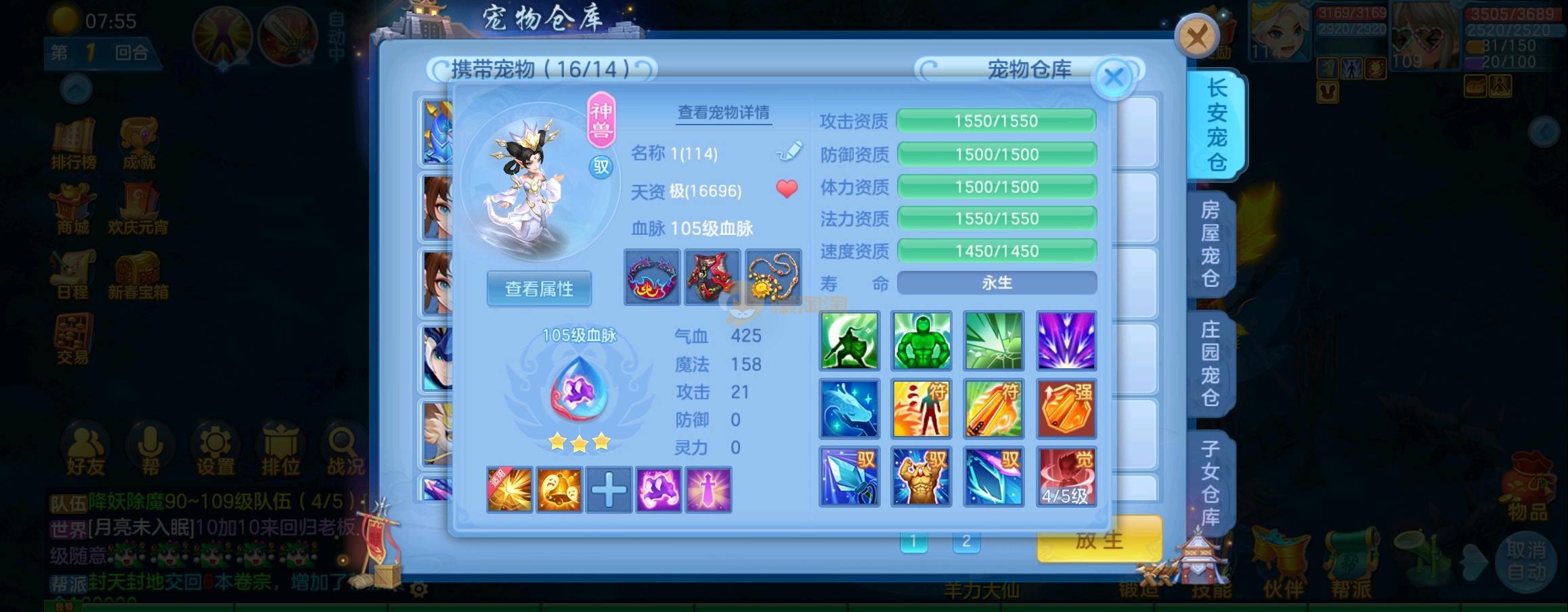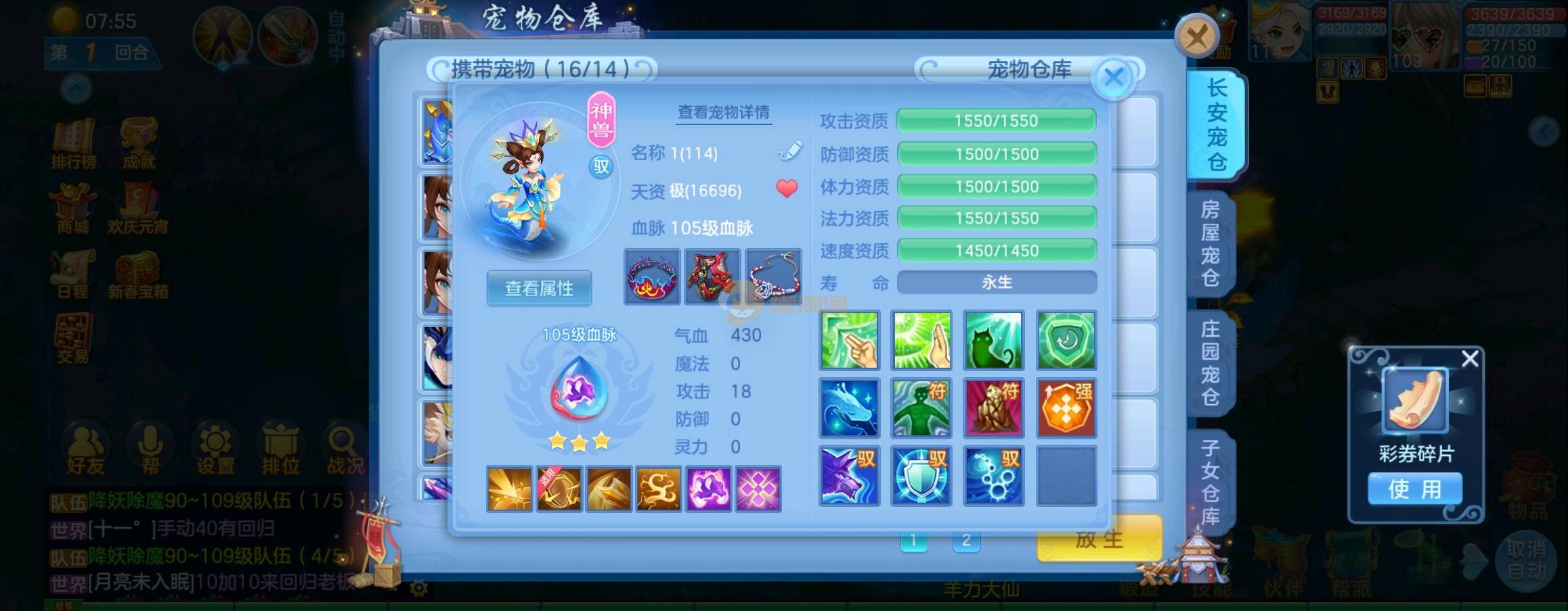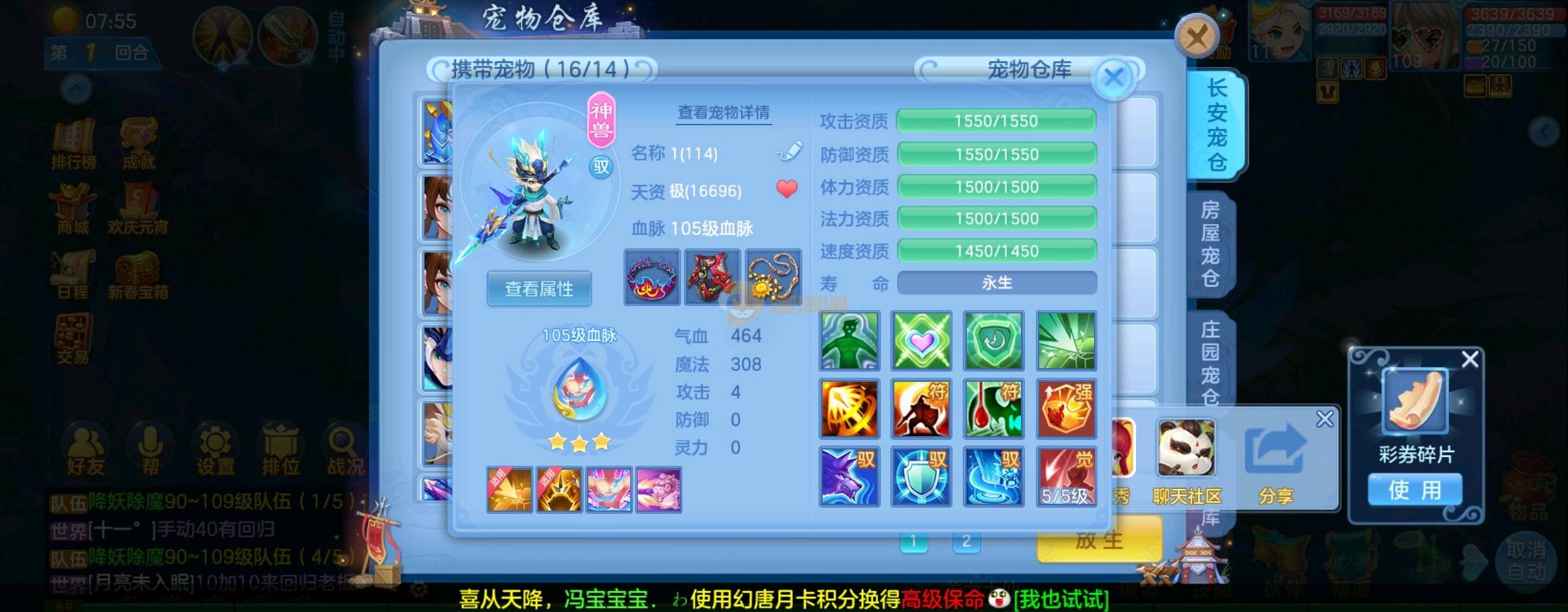 装备毕业,宝宝齐全,新版成就宠寒翎,坐狮,蒲牢全有,双葫芦娃天赋,仓库还有很多兽魂果,第五个内胆马上合成。