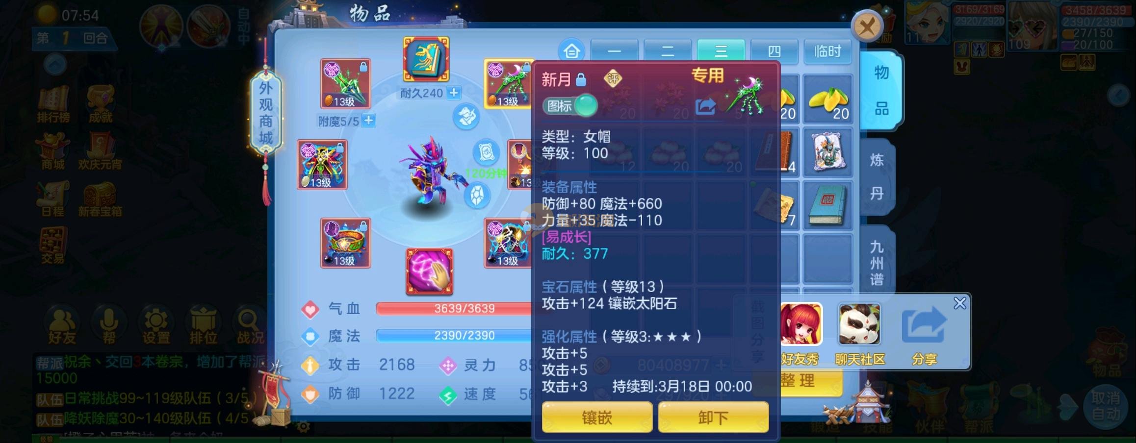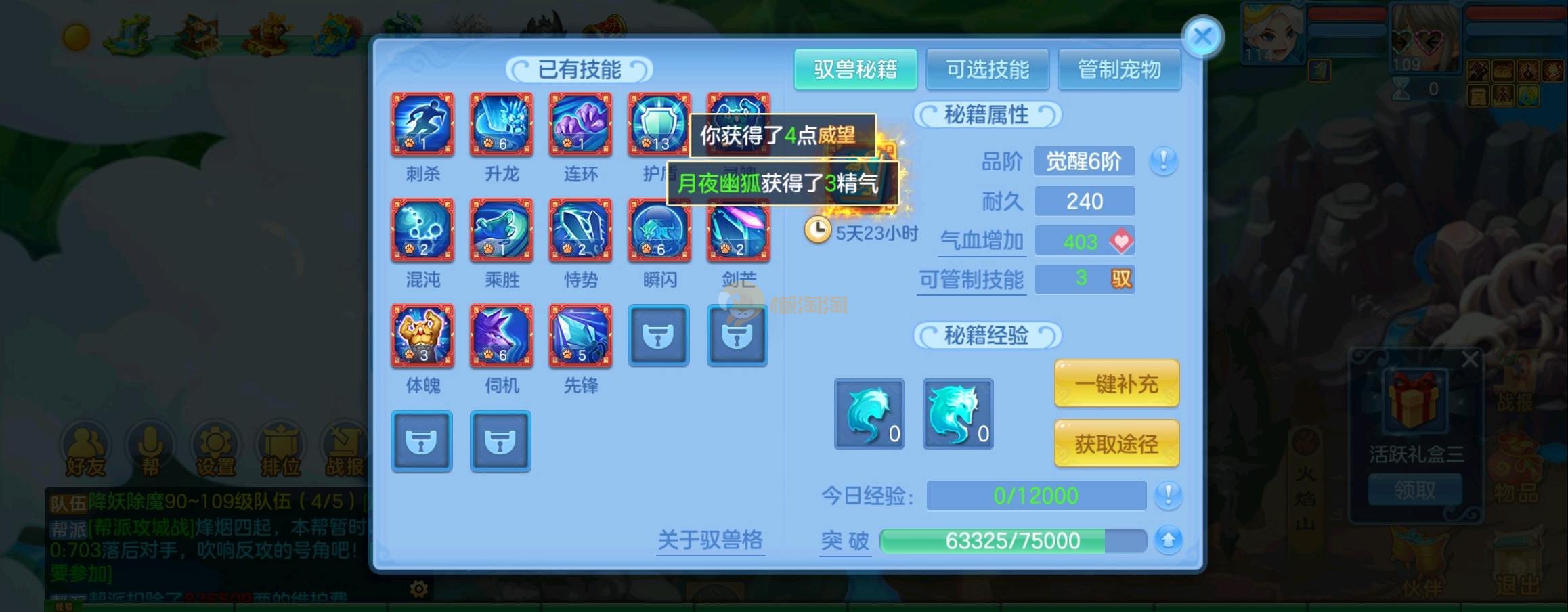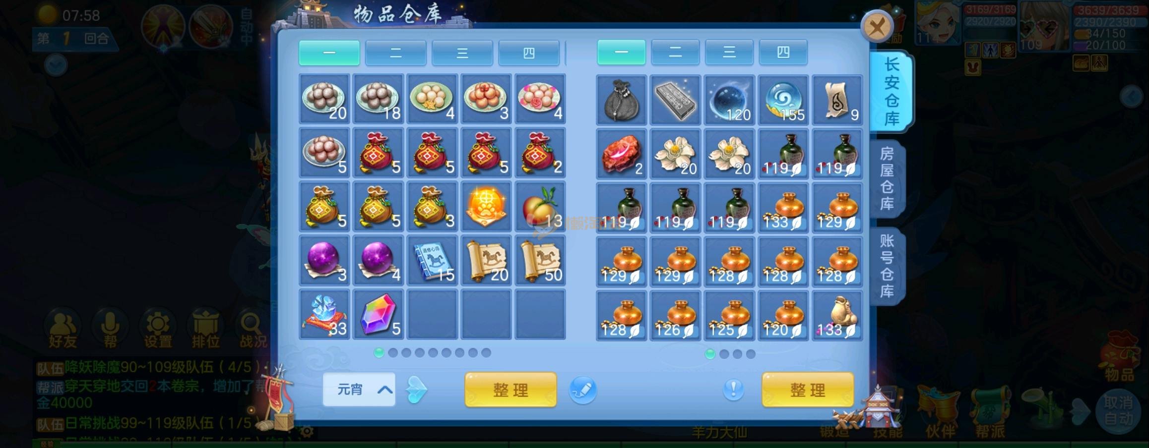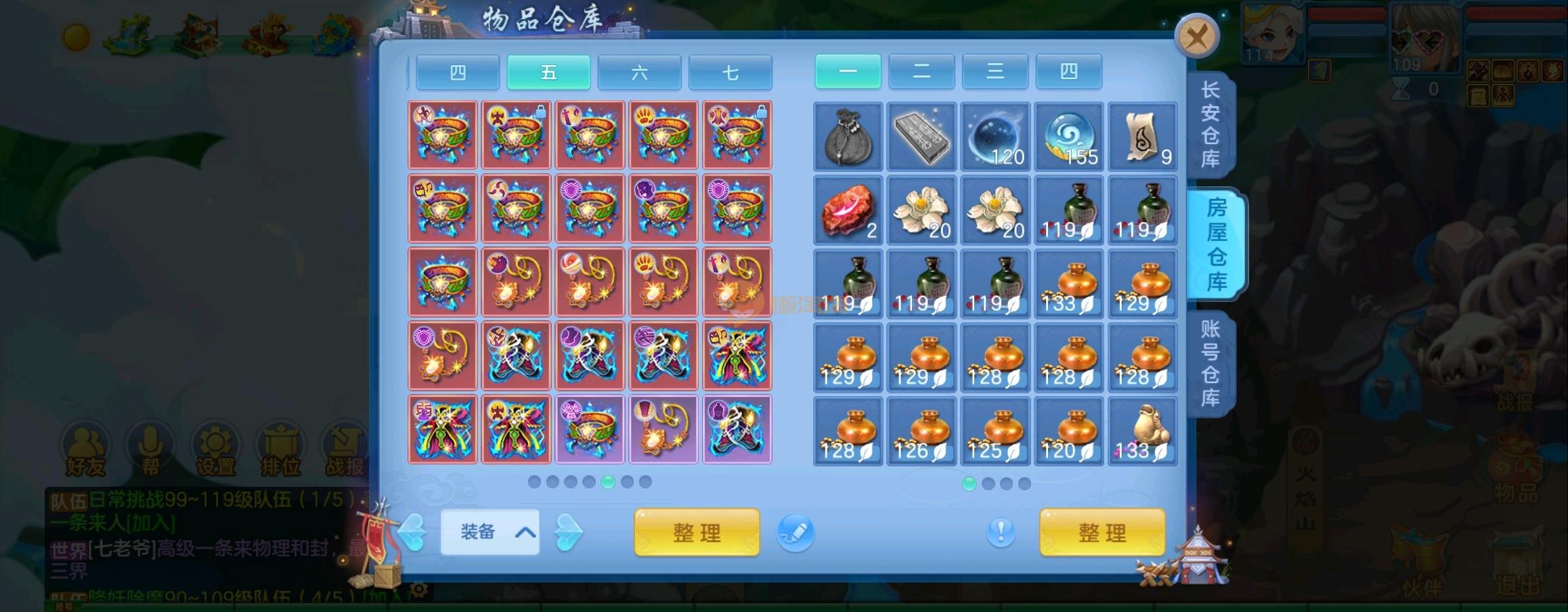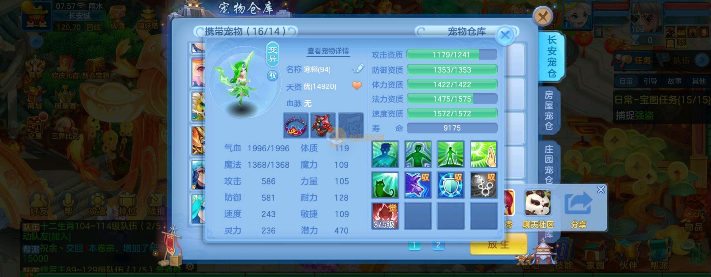 装备毕业,宝宝齐全,新版成就宠寒翎,坐狮,蒲牢全有,双葫芦娃天赋,仓库还有很多兽魂果,第五个内胆马上合成。
