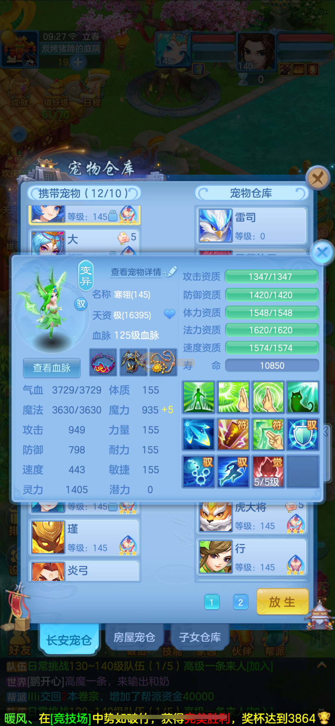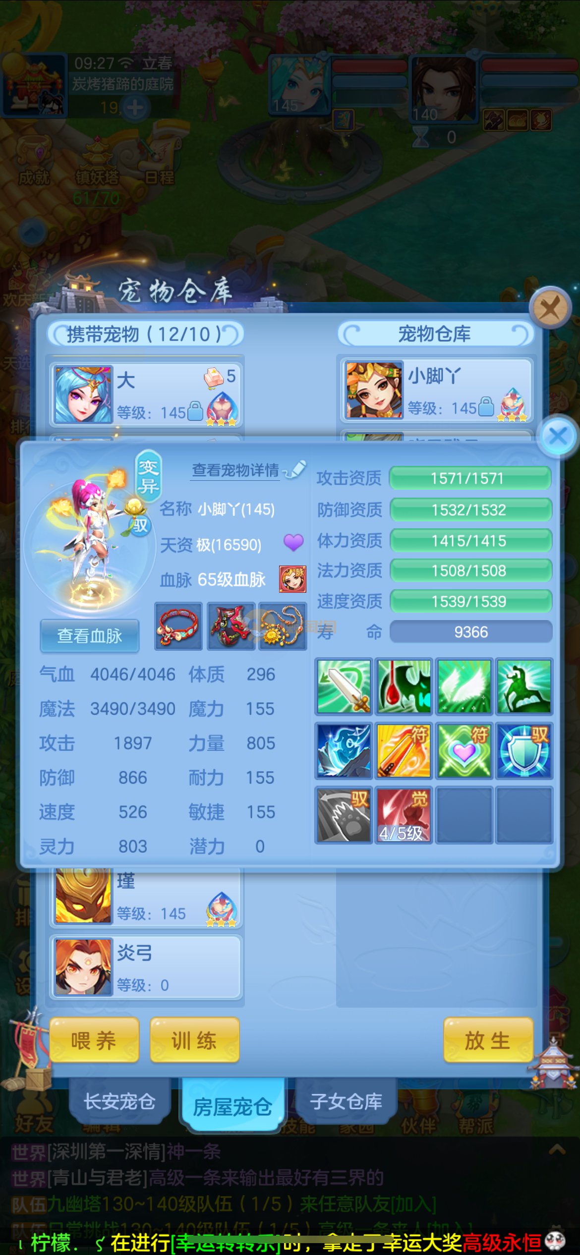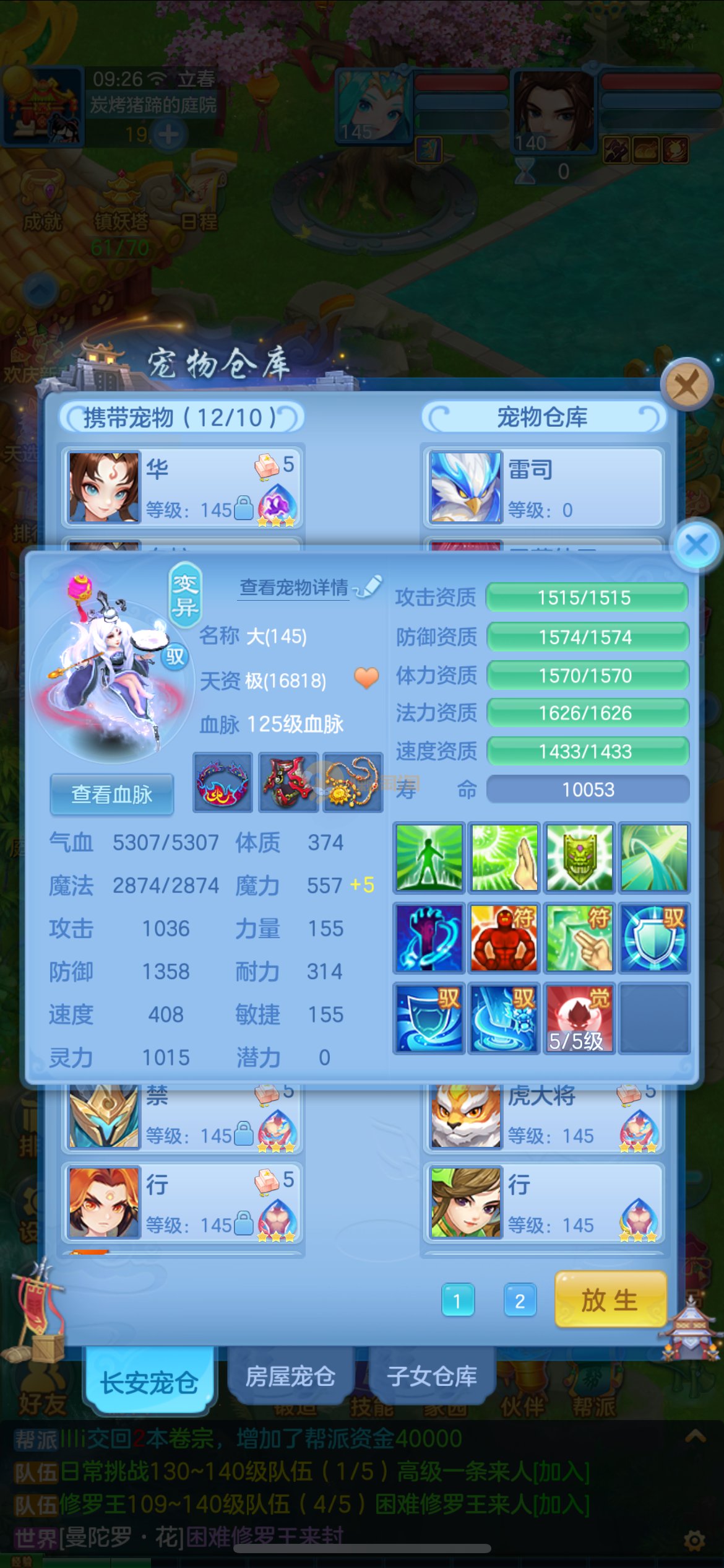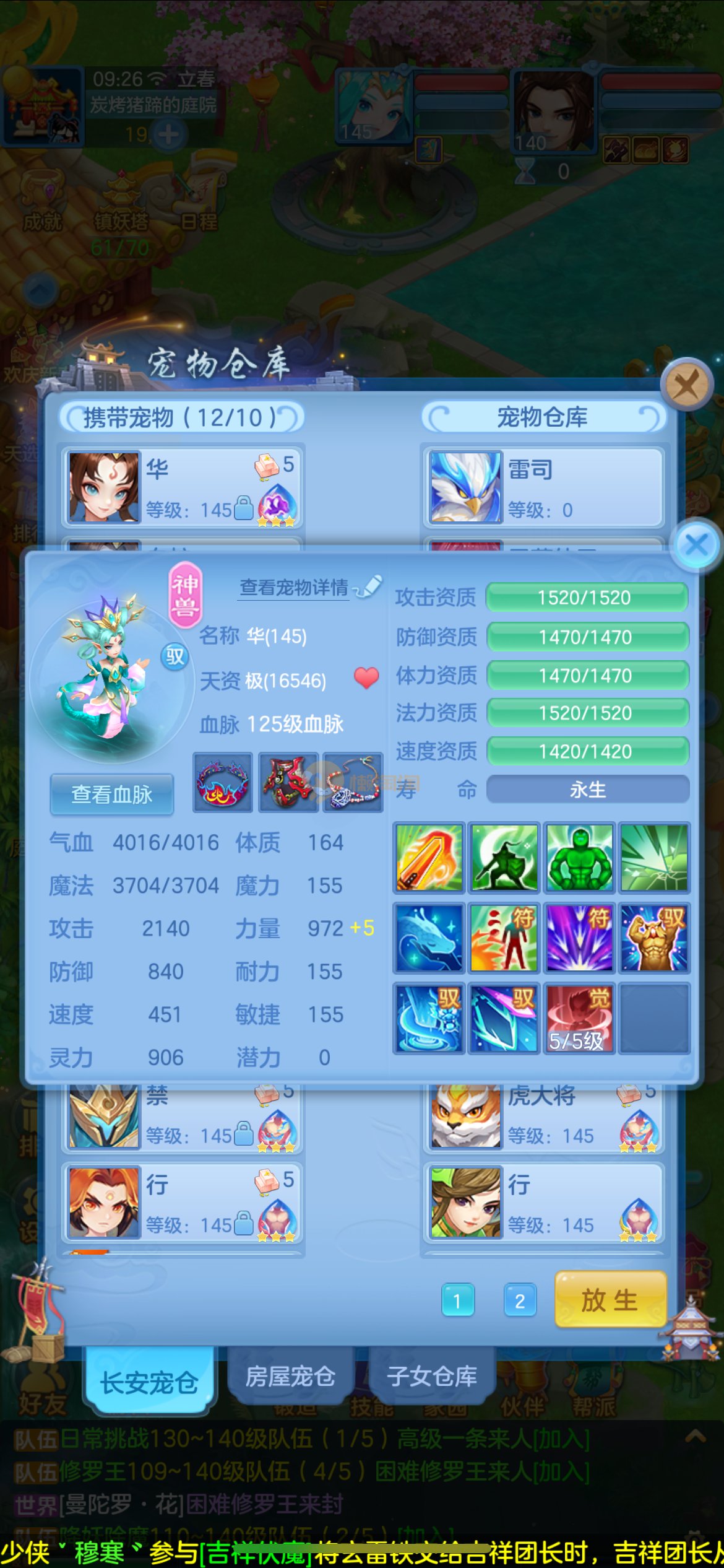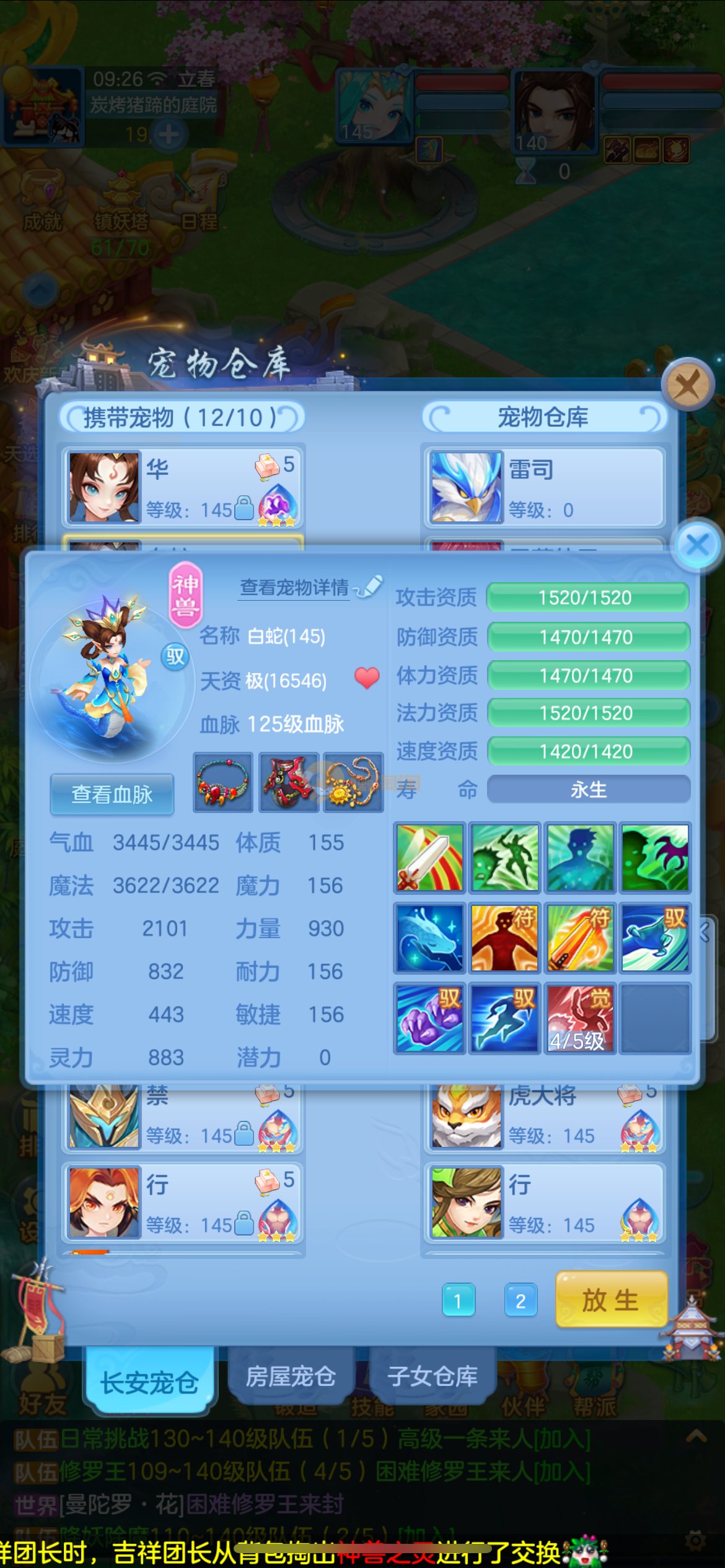 高坐骑愤怒易腰带,3套属性点,六阶御兽,全身易特技,物理辅助双套成品装备,2只内丹五技能蛇,2只高资质五技能公主,高资质孟婆等多个宝宝,炎弓、雷司擎天、镜花天赋,高属性血脉,通杀一切任务,可PK