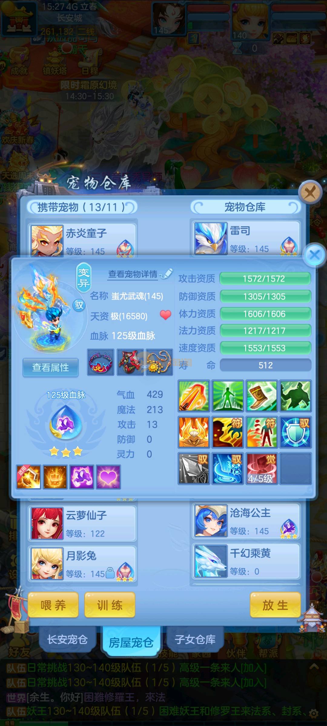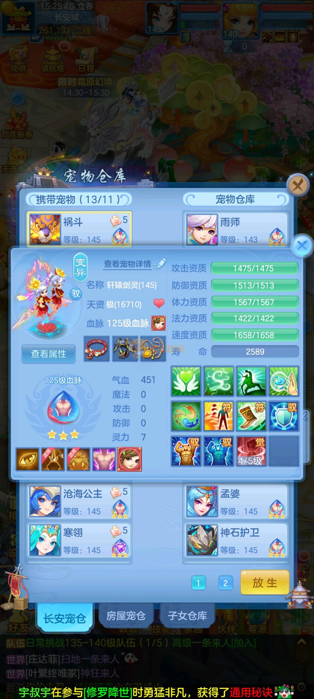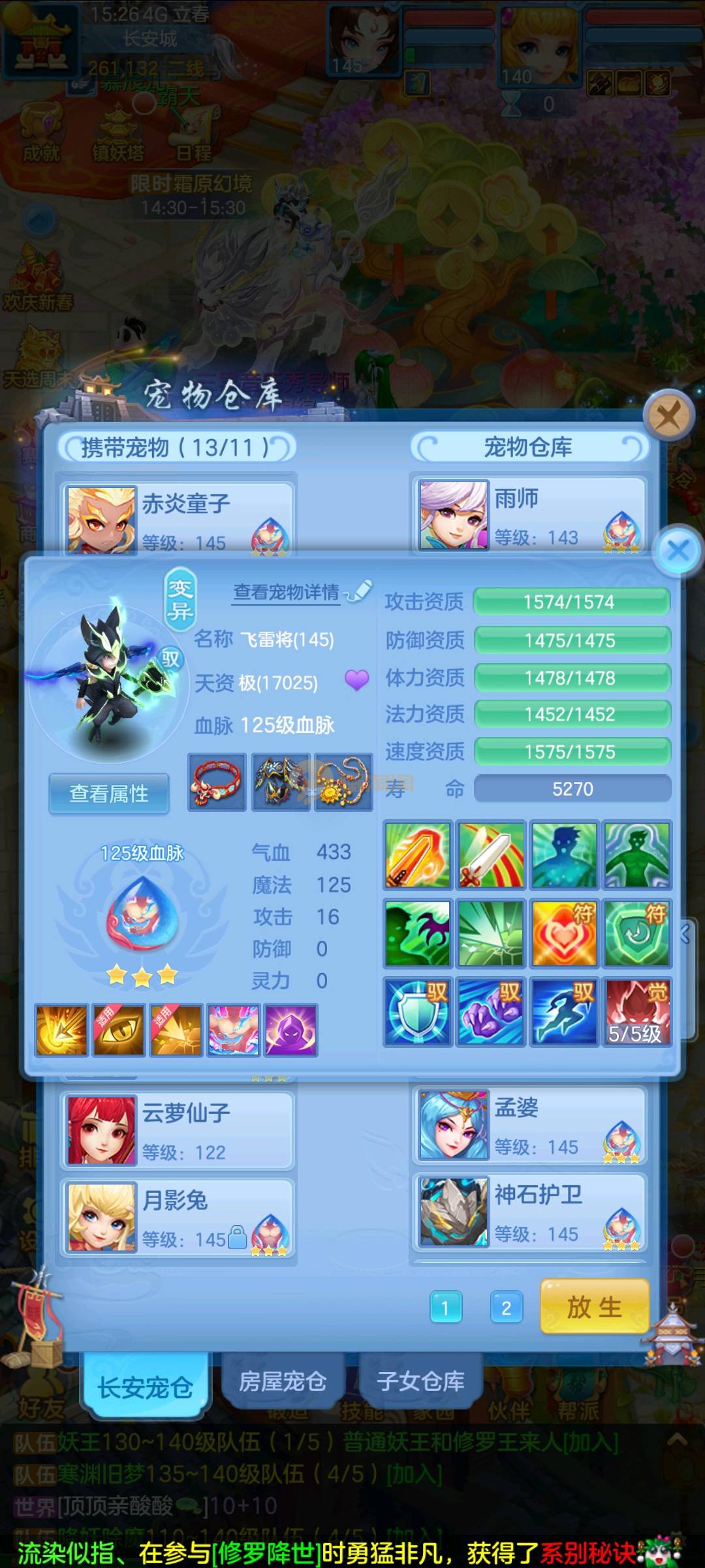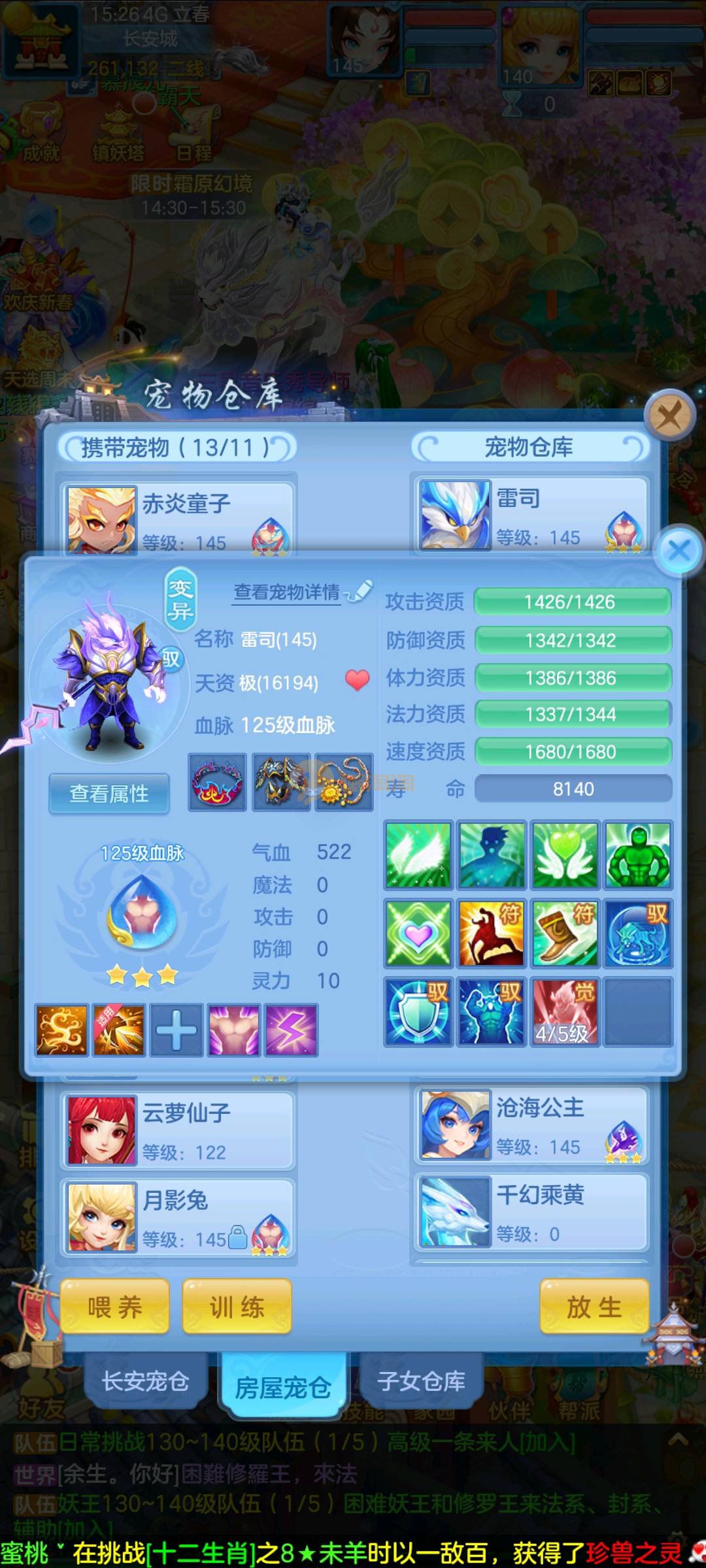 今年勇 140男魔王,三件14.4,不变卡灵力防御双1570+,变卡双1600+ 14个满兽魂宝宝 11专属血脉 5宠物皮肤 无双重,带庄园2980邮箱 1年换绑 验证码找懒懒