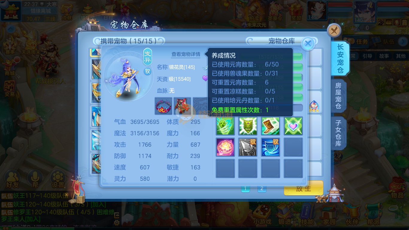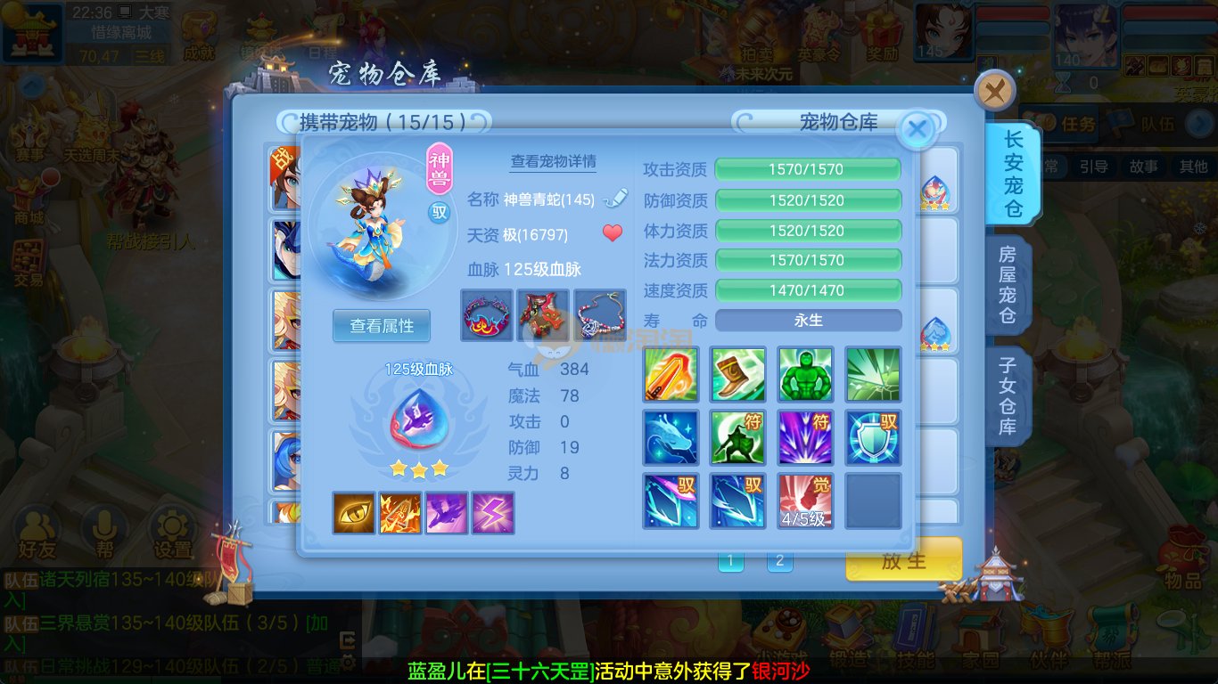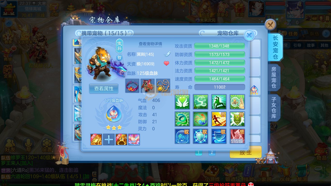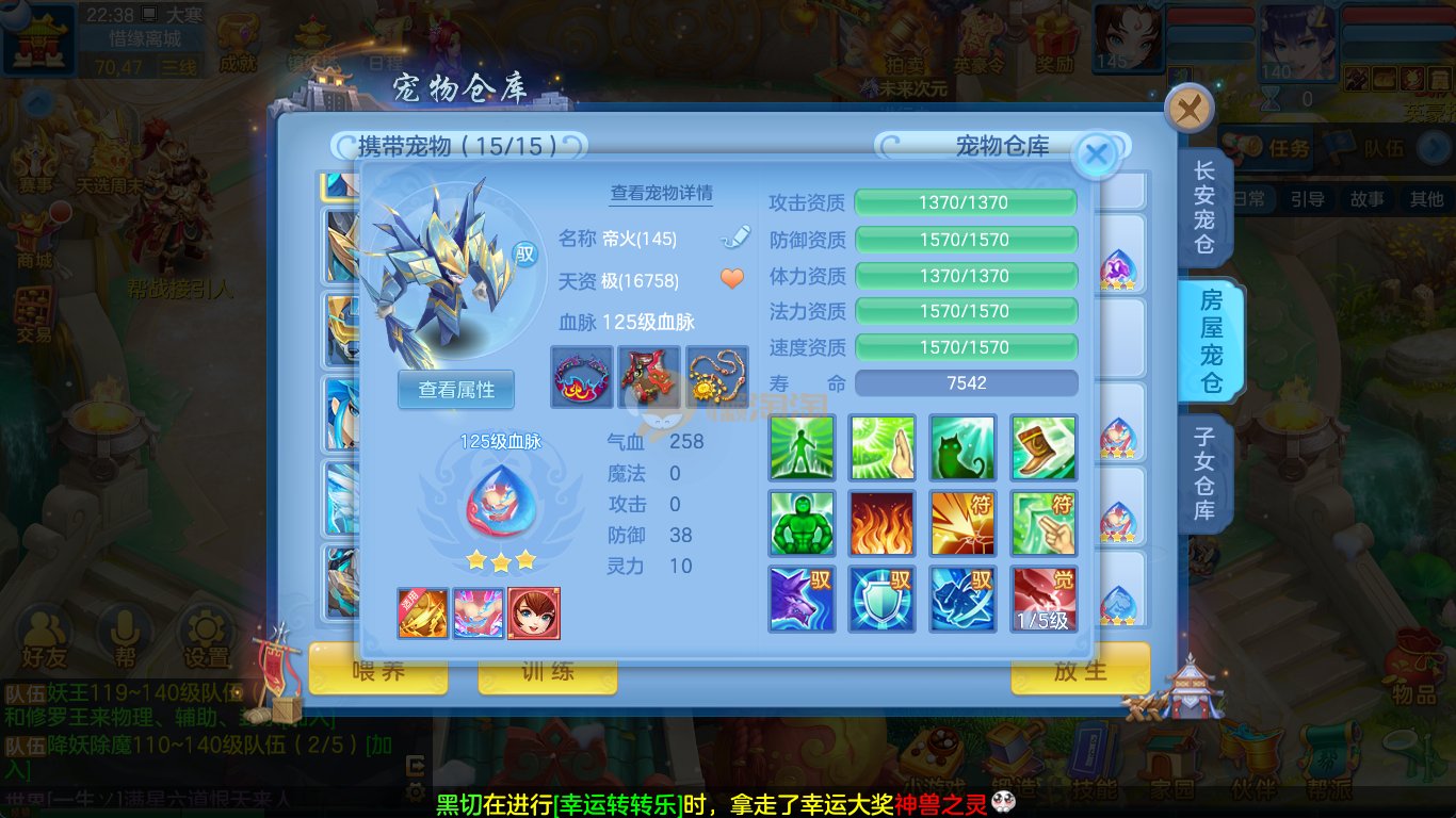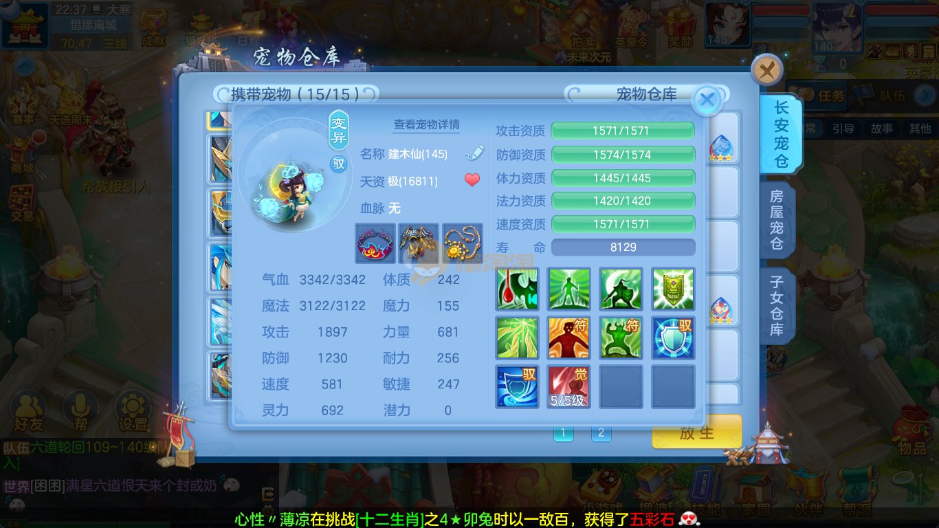 强化仙一龙两蛇一马。特技齐全,宝宝皮肤全,10个满兽魂,辅助特技妙手。13段混12,还有145万银,1884金,坐骑衣橱全,单身海景房,资源满满