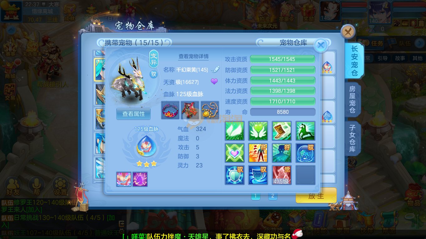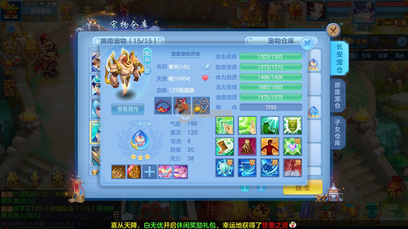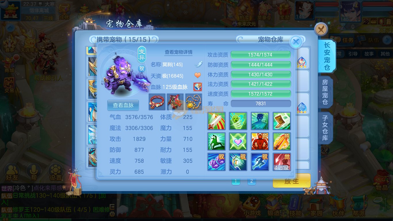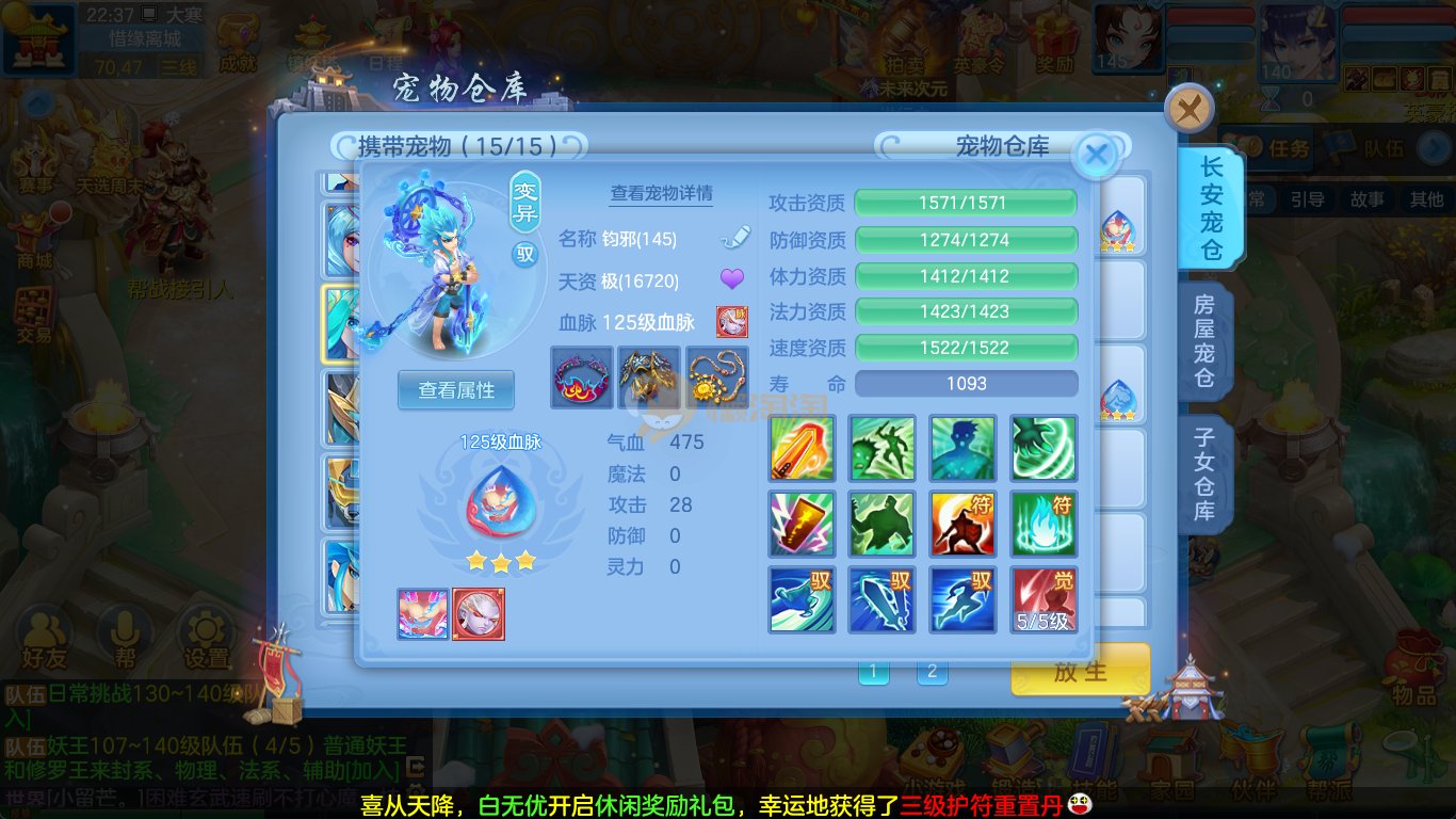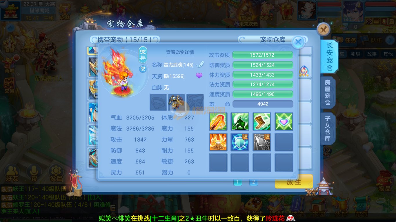 强化仙一龙两蛇一马。特技齐全,宝宝皮肤全,10个满兽魂,辅助特技妙手。13段混12,还有145万银,1884金,坐骑衣橱全,单身海景房,资源满满