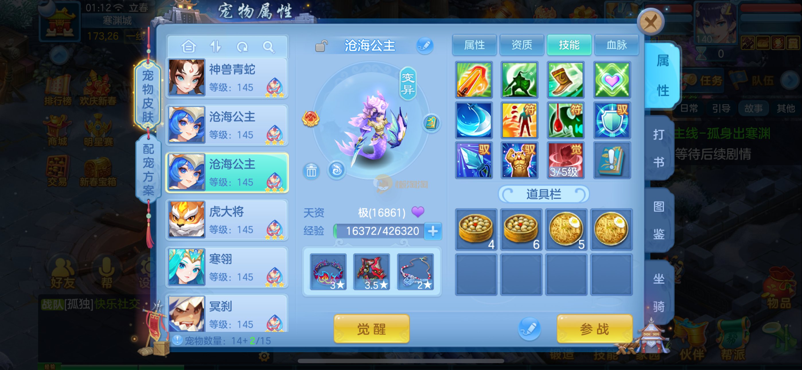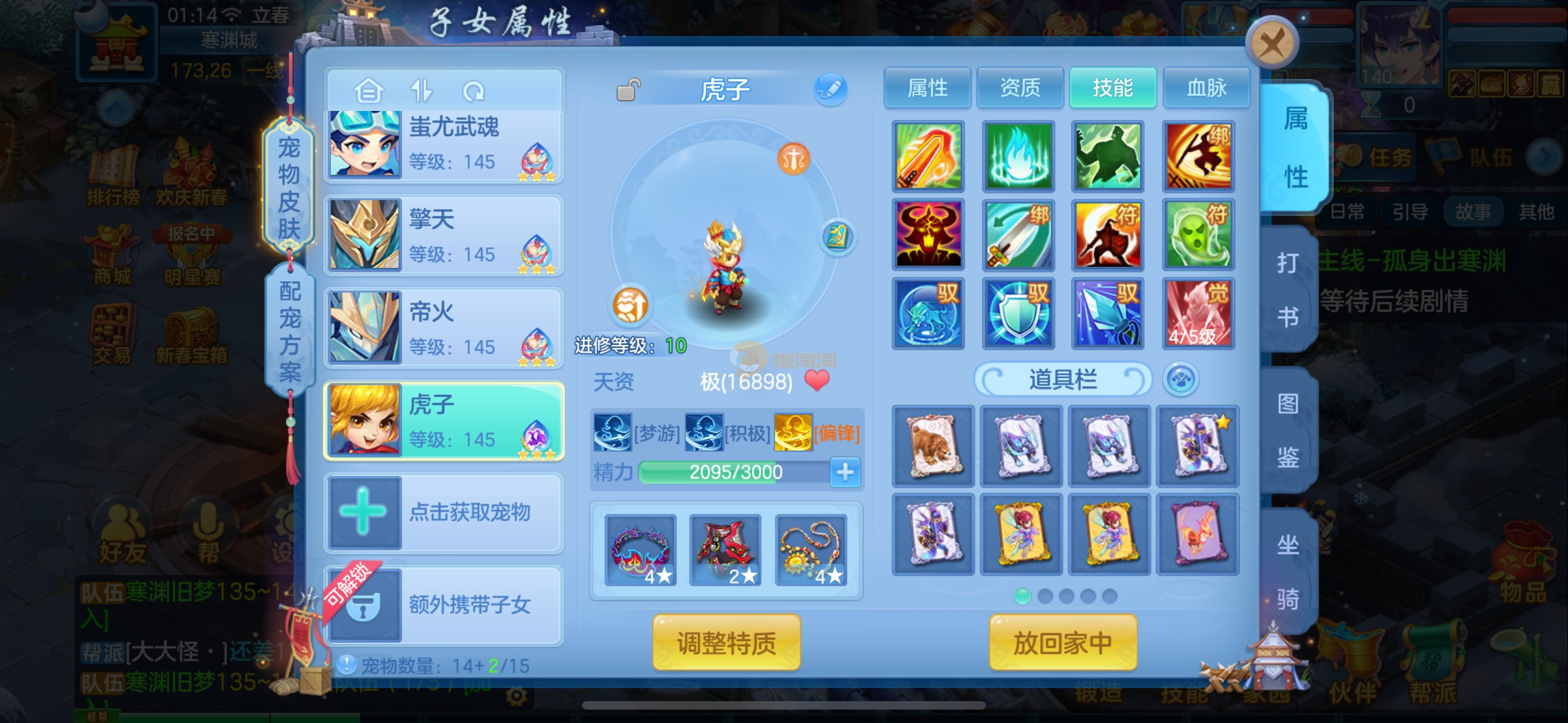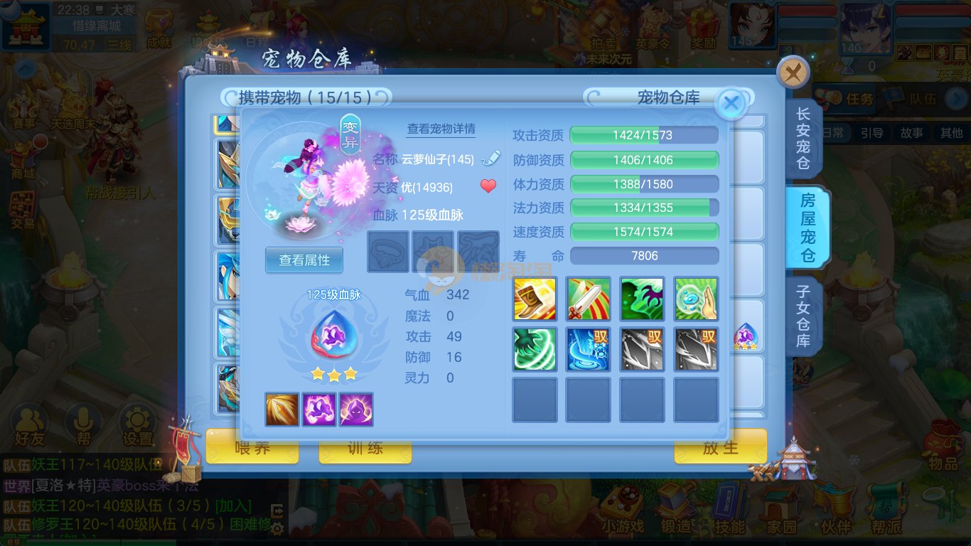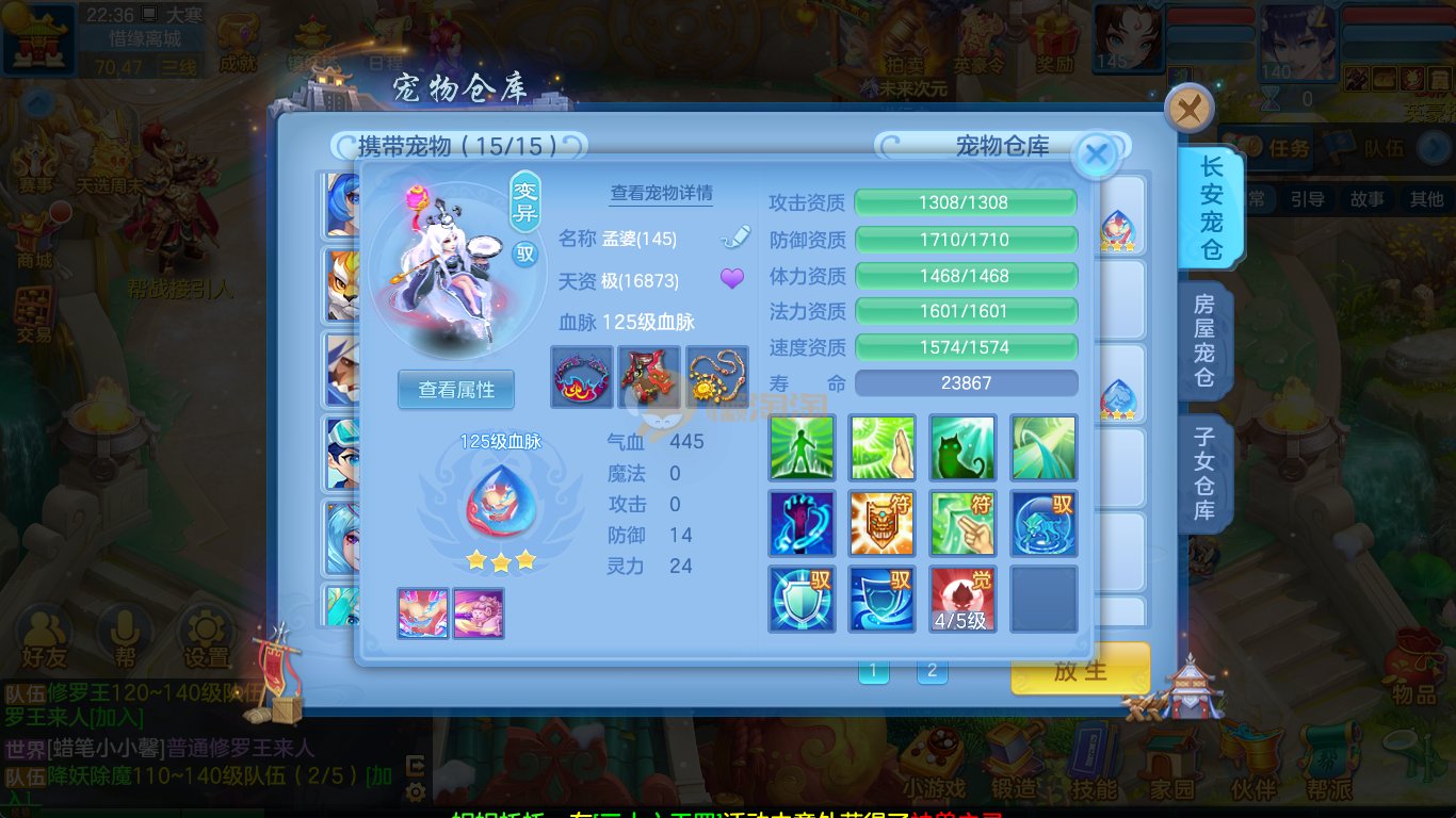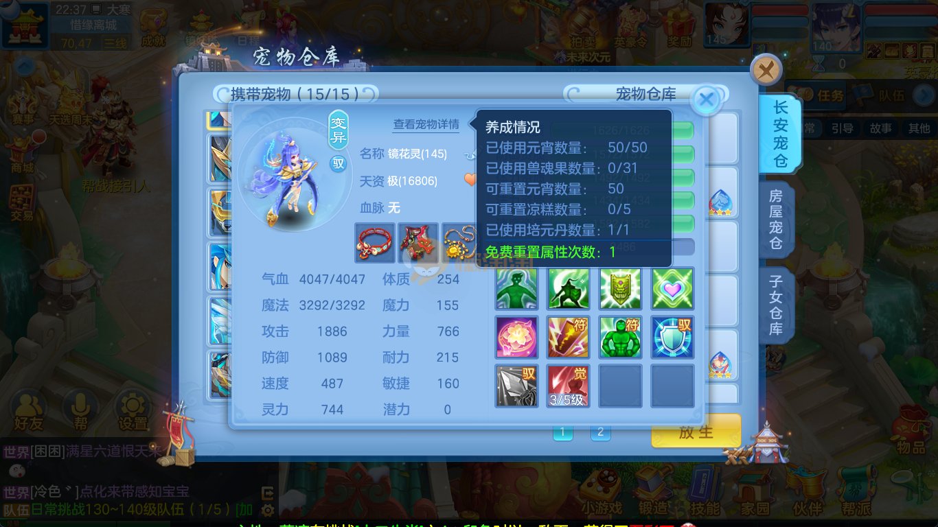 强化仙一龙两蛇一马。特技齐全,宝宝皮肤全,10个满兽魂,辅助特技妙手。13段混12,还有145万银,1884金,坐骑衣橱全,单身海景房,资源满满