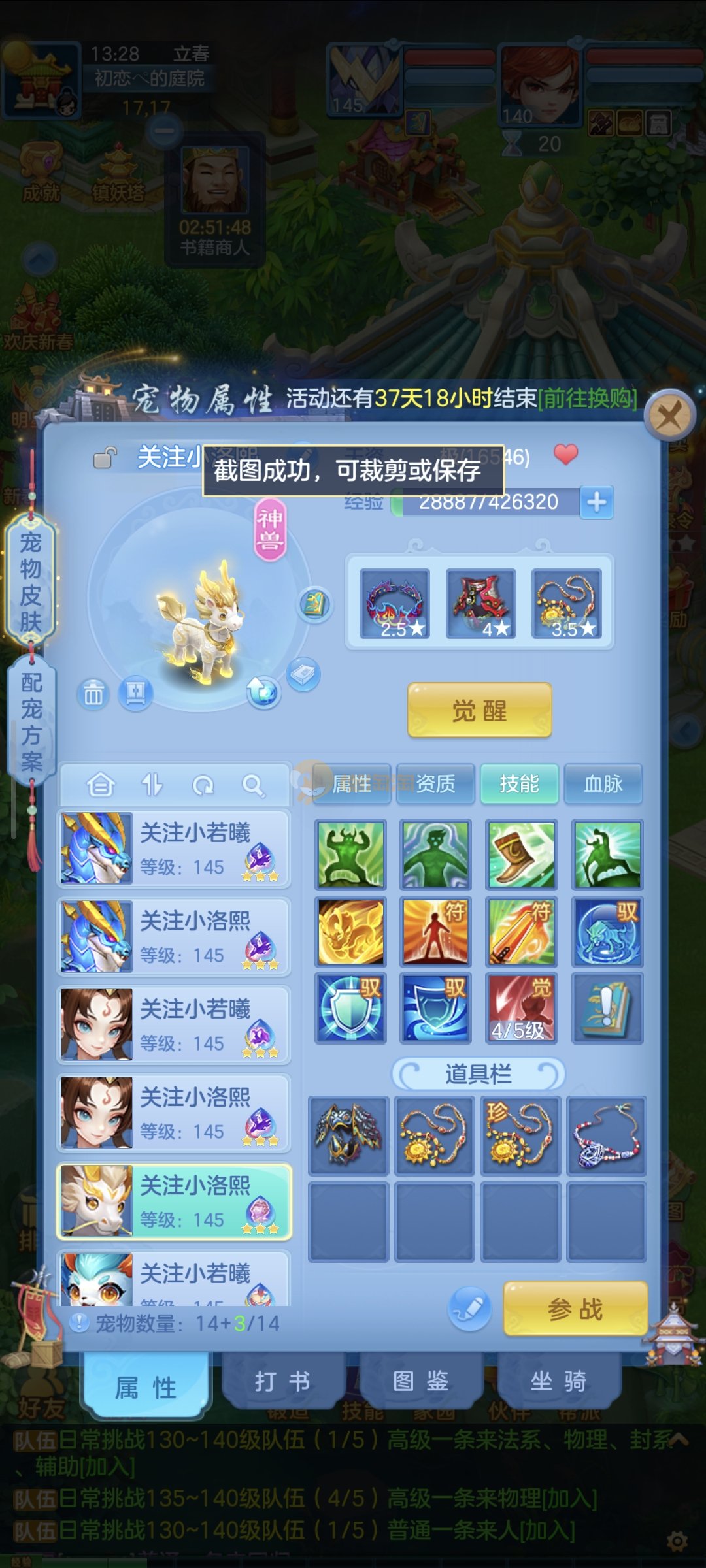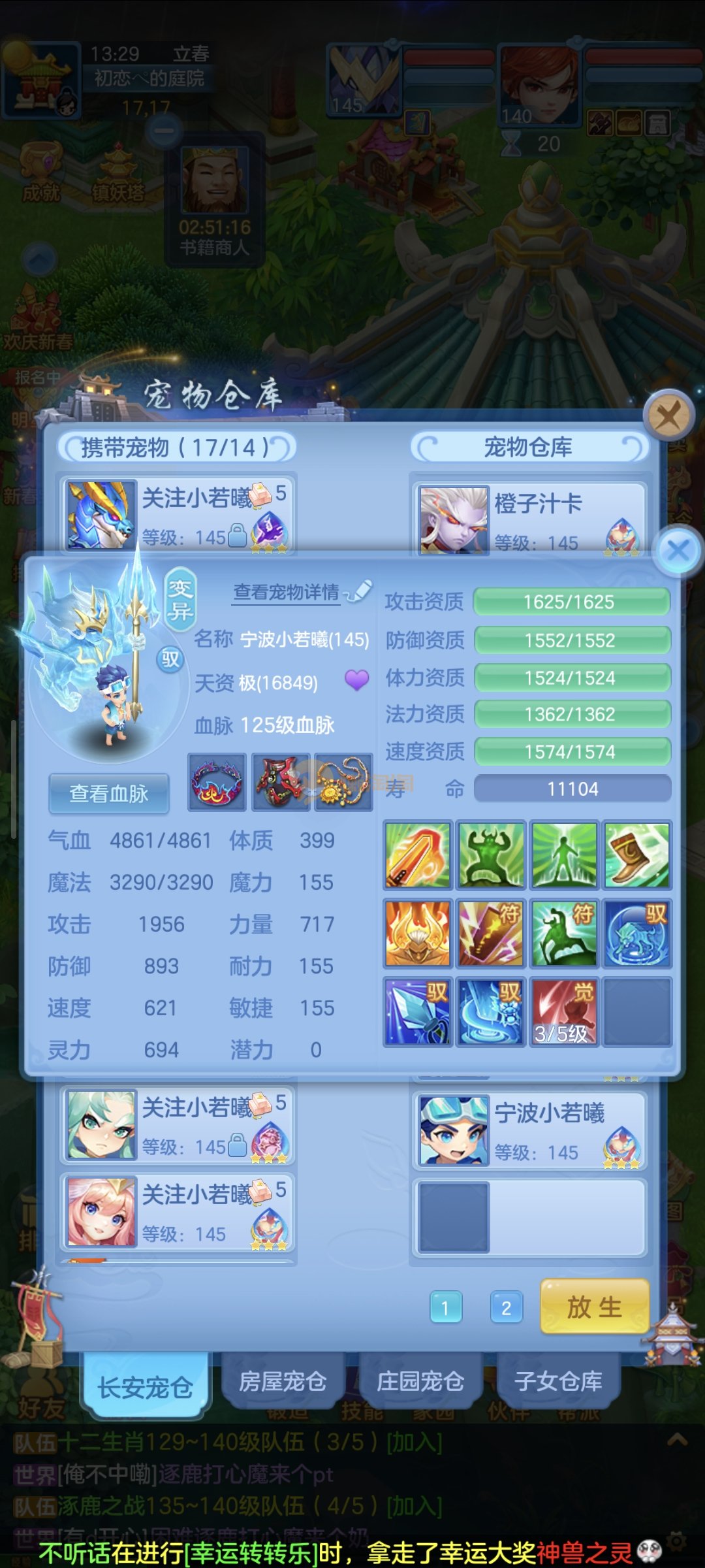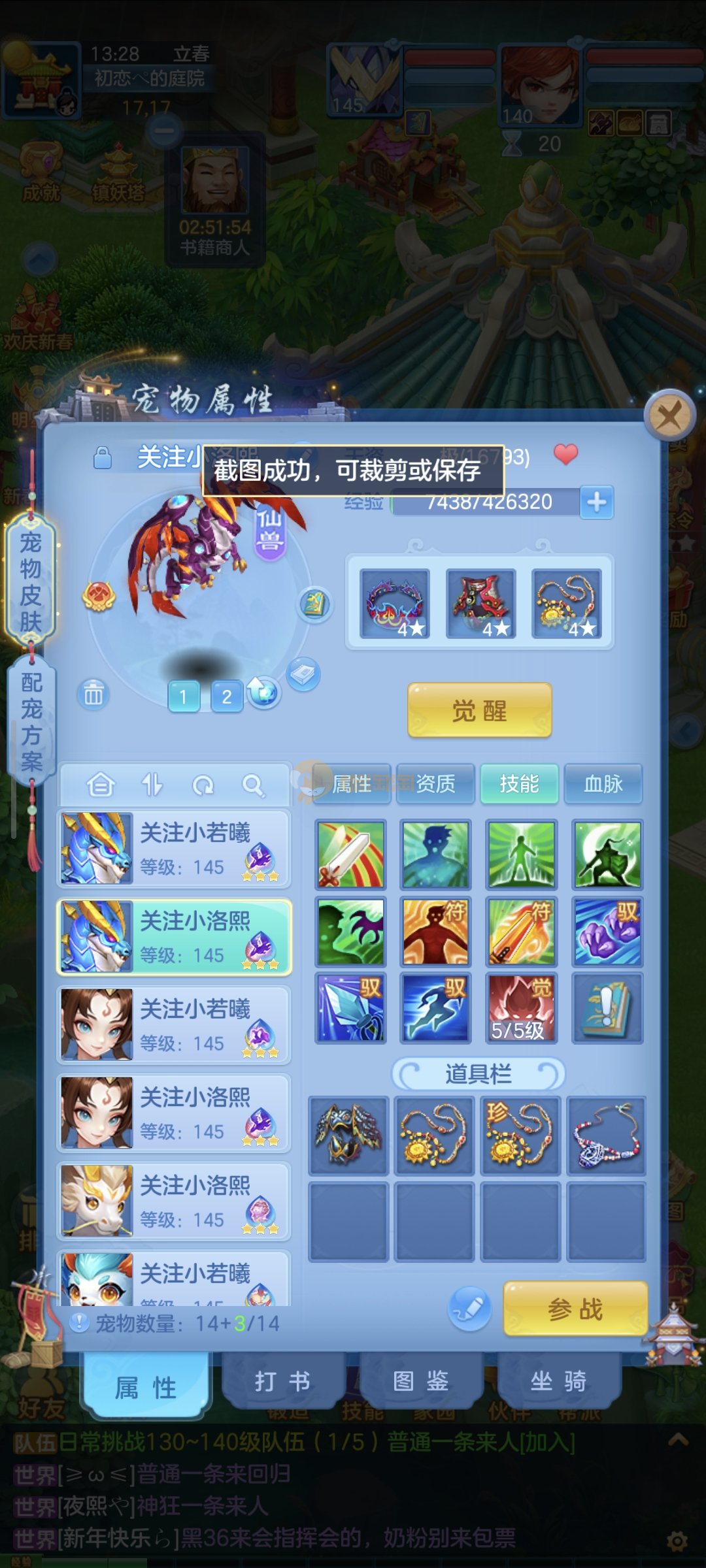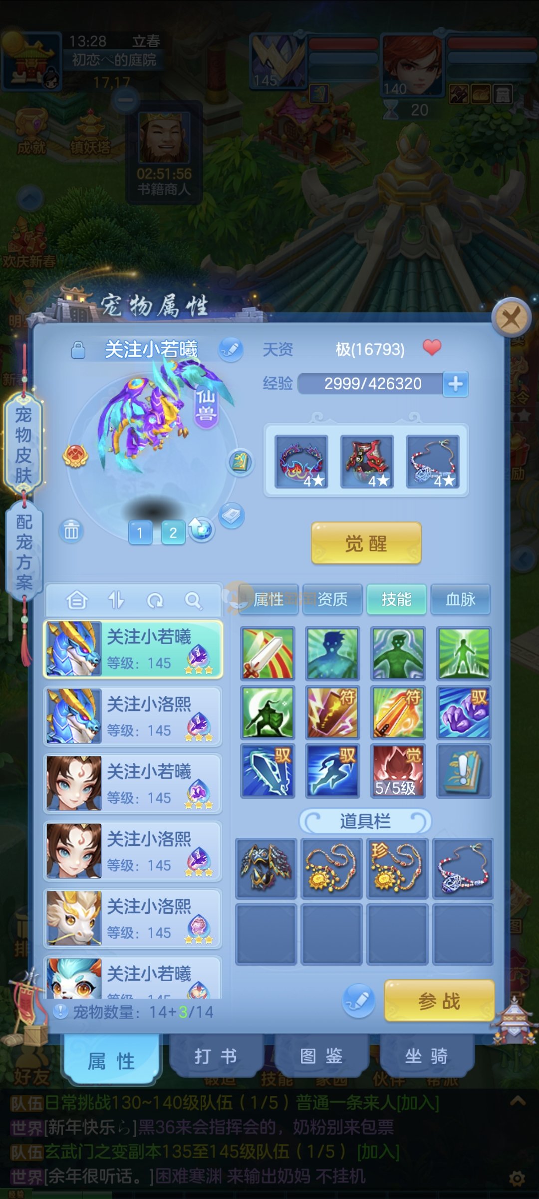 强化仙一龙两蛇一马。特技齐全,宝宝皮肤全,10个满兽魂,辅助特技妙手。13段混12,还有145万银,1884金,坐骑衣橱全,单身海景房,资源满满