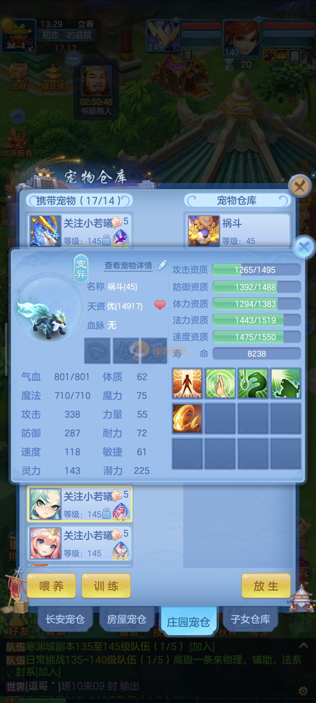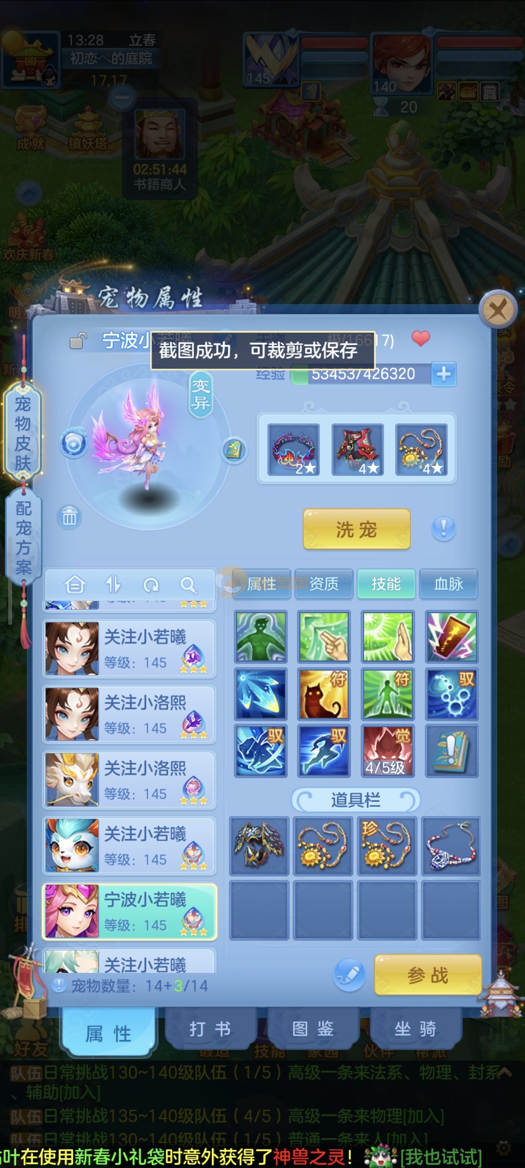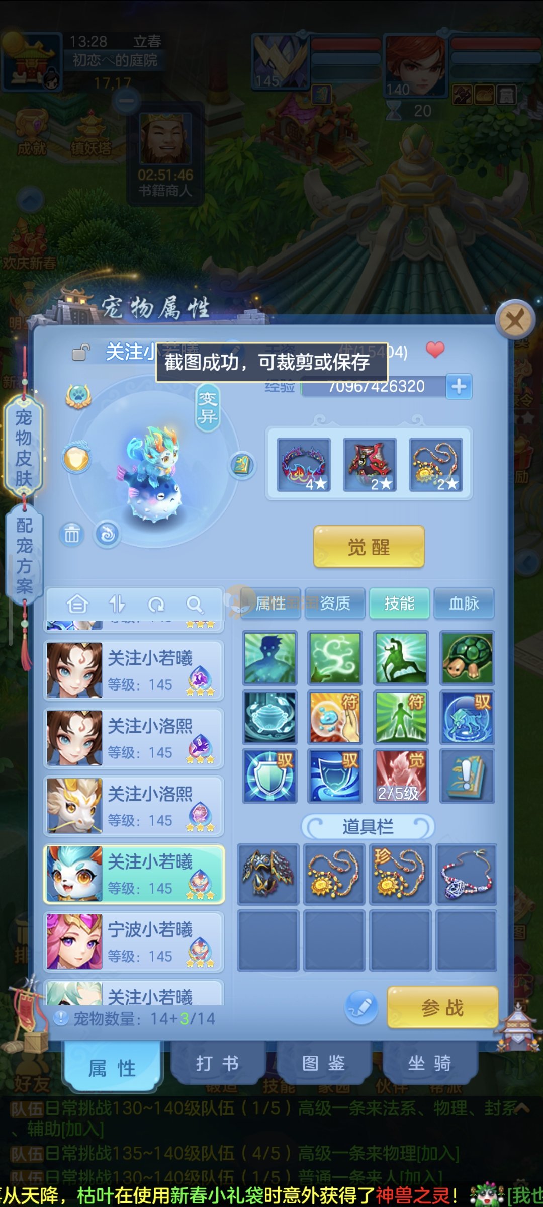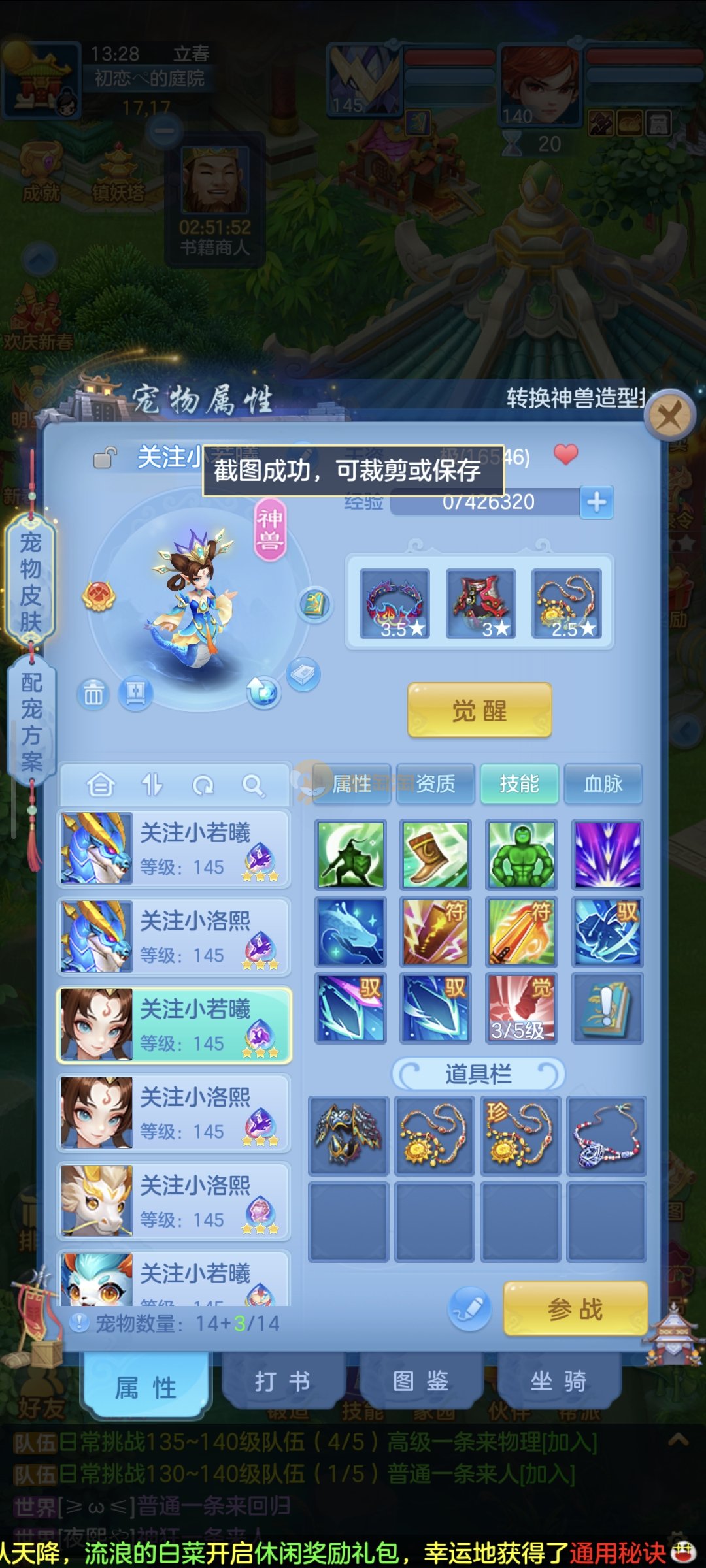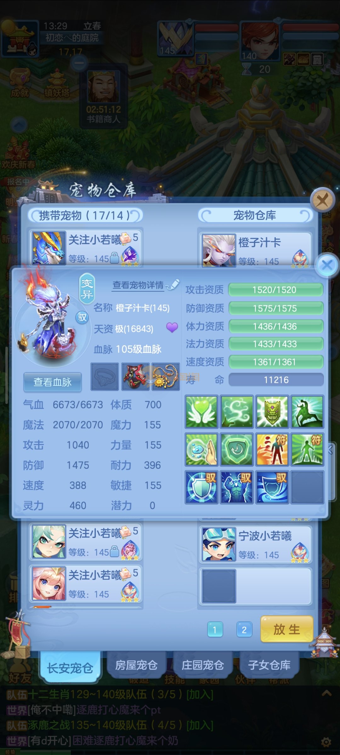 强化仙一龙两蛇一马。特技齐全,宝宝皮肤全,10个满兽魂,辅助特技妙手。13段混12,还有145万银,1884金,坐骑衣橱全,单身海景房,资源满满