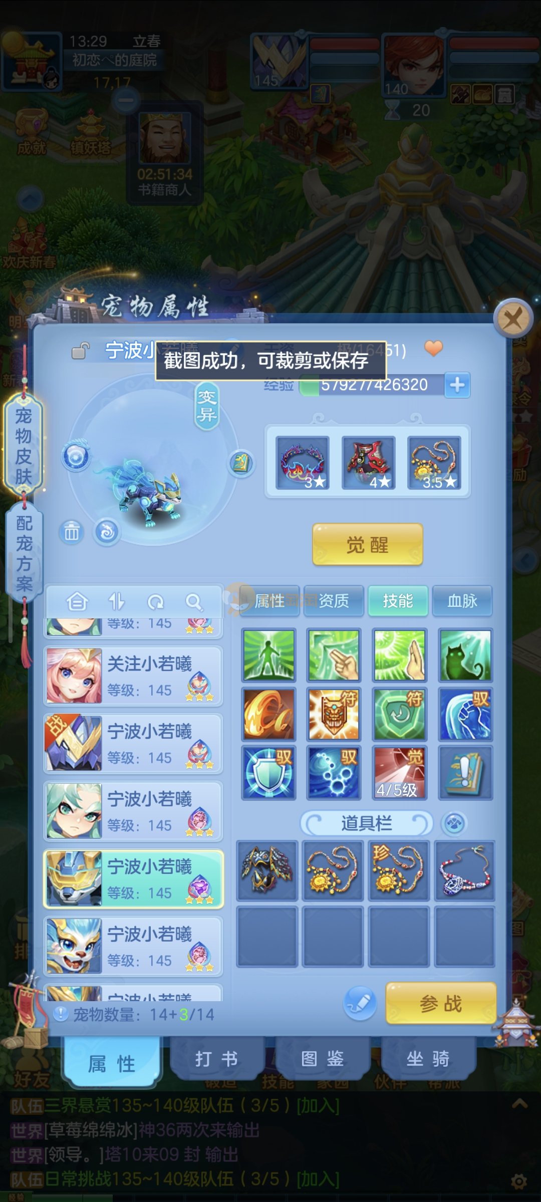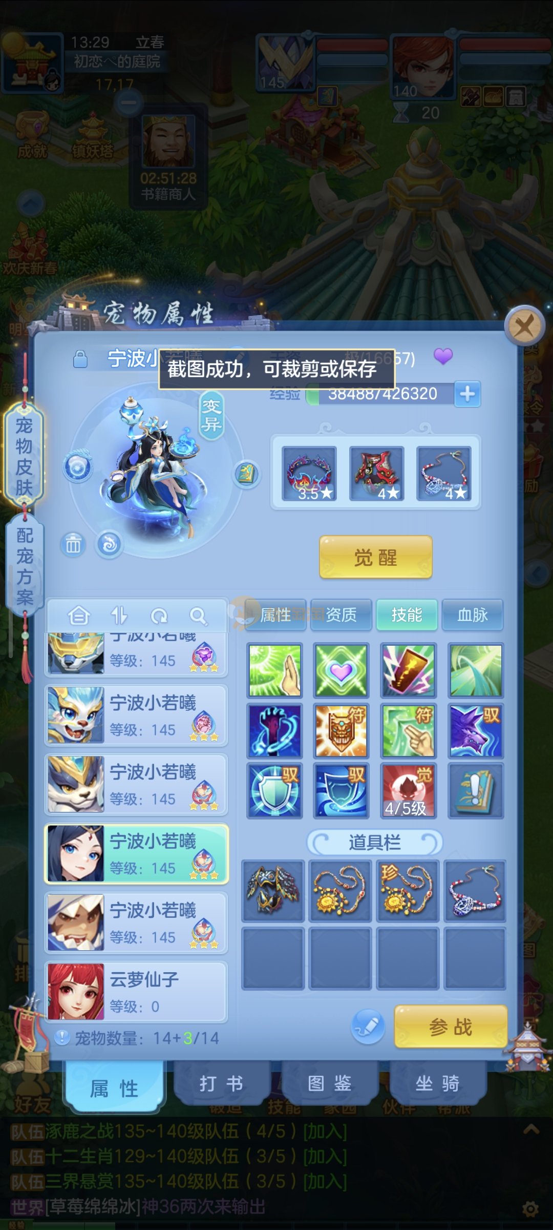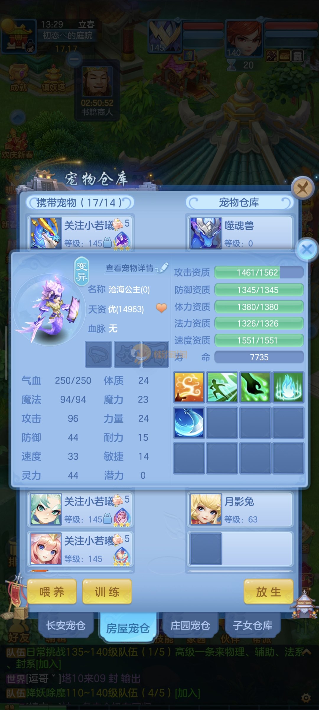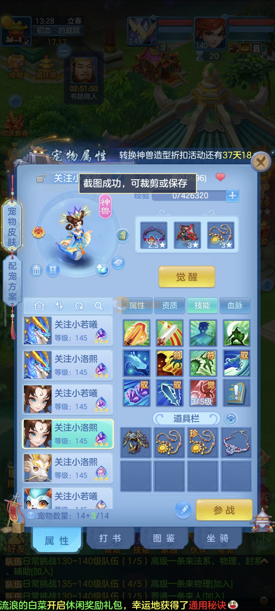 强化仙一龙两蛇一马。特技齐全,宝宝皮肤全,10个满兽魂,辅助特技妙手。13段混12,还有145万银,1884金,坐骑衣橱全,单身海景房,资源满满