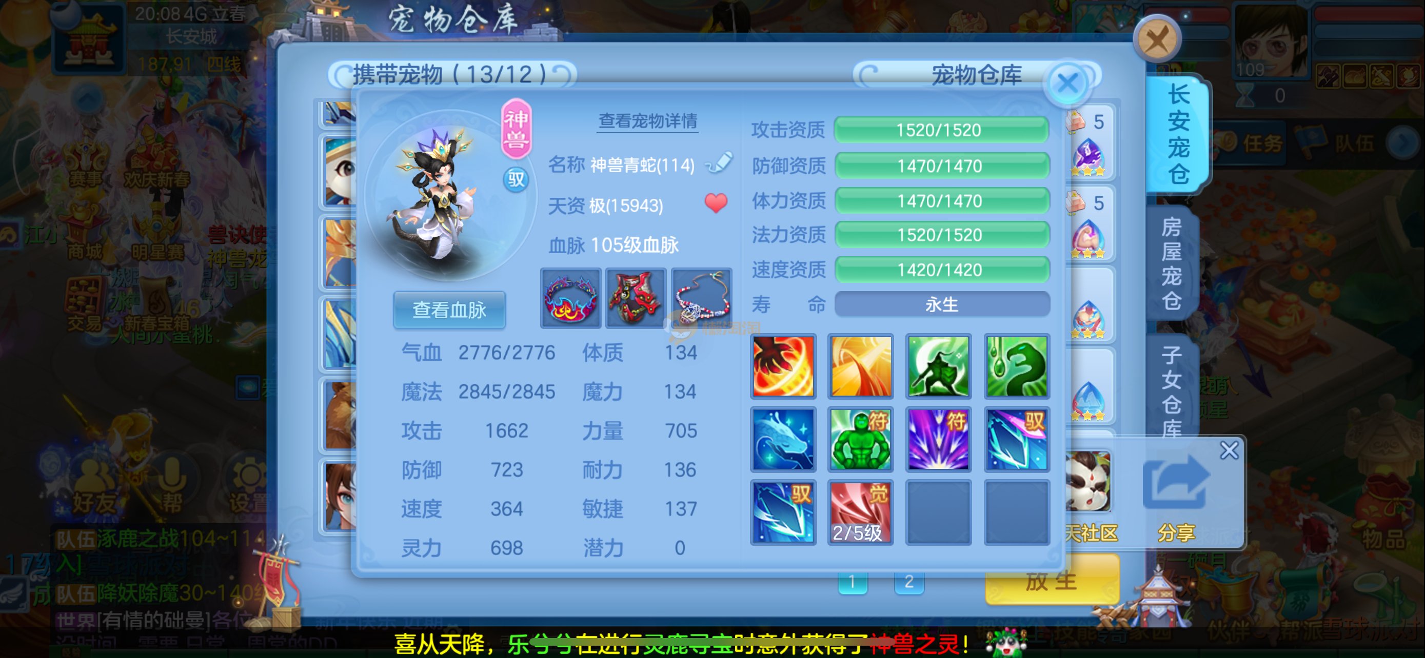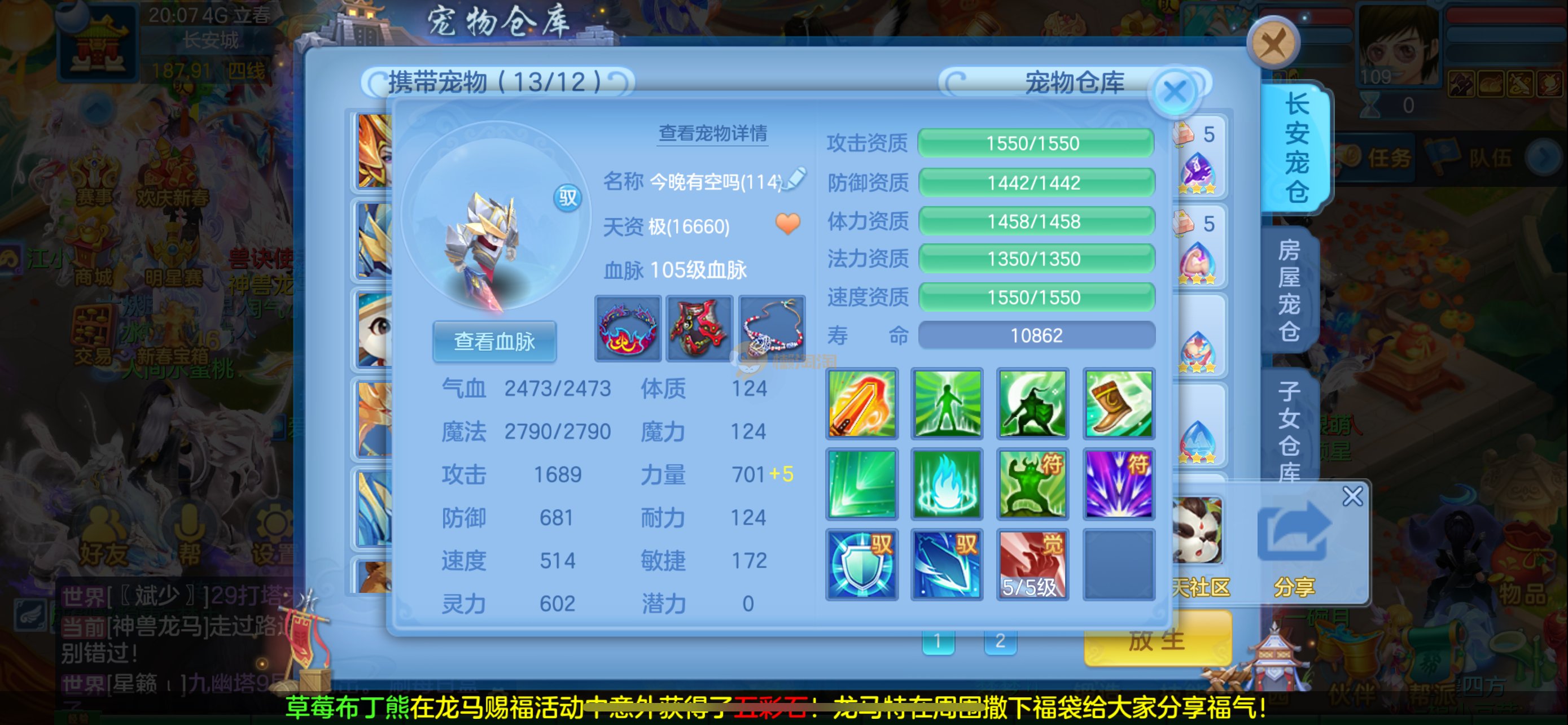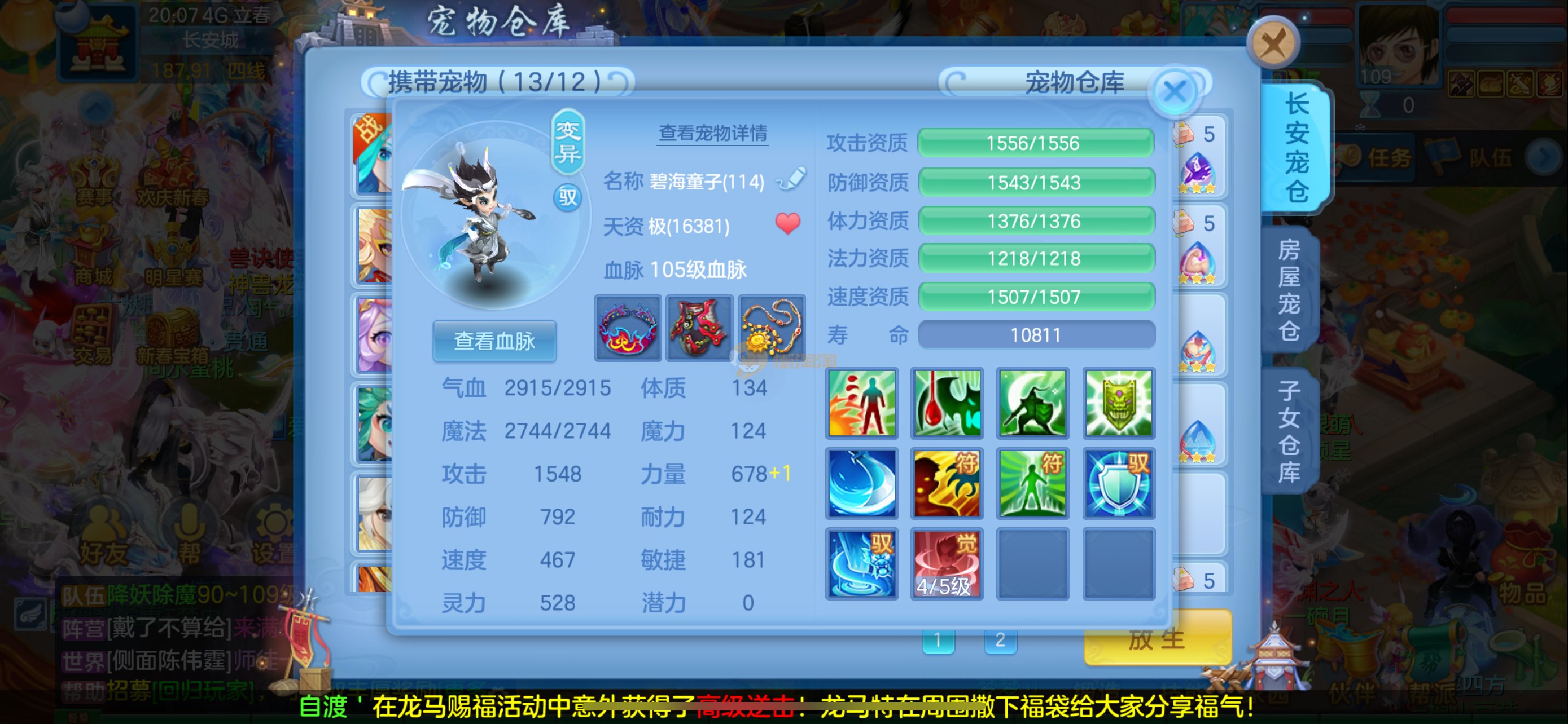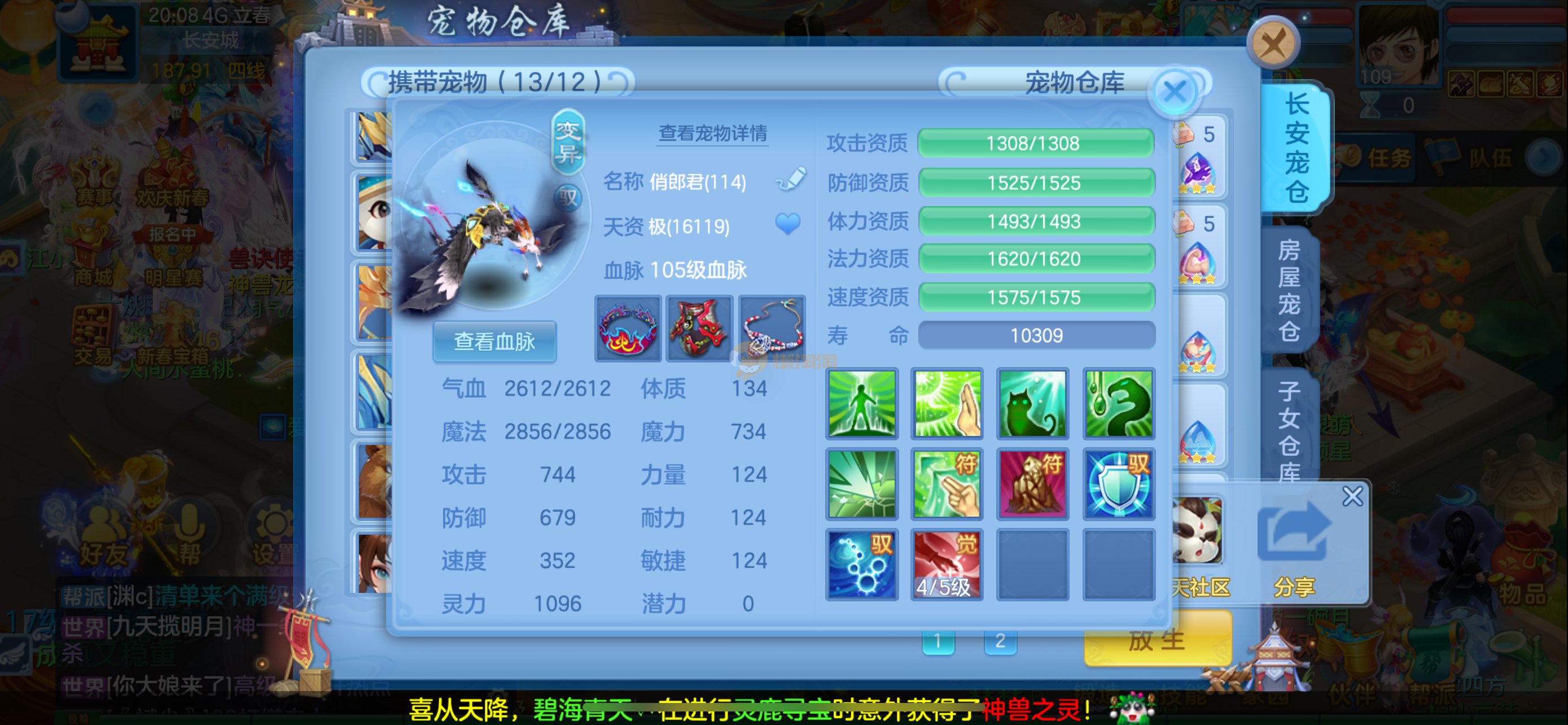 强化仙一龙两蛇一马。特技齐全,宝宝皮肤全,10个满兽魂,辅助特技妙手。13段混12,还有145万银,1884金,坐骑衣橱全,单身海景房,资源满满