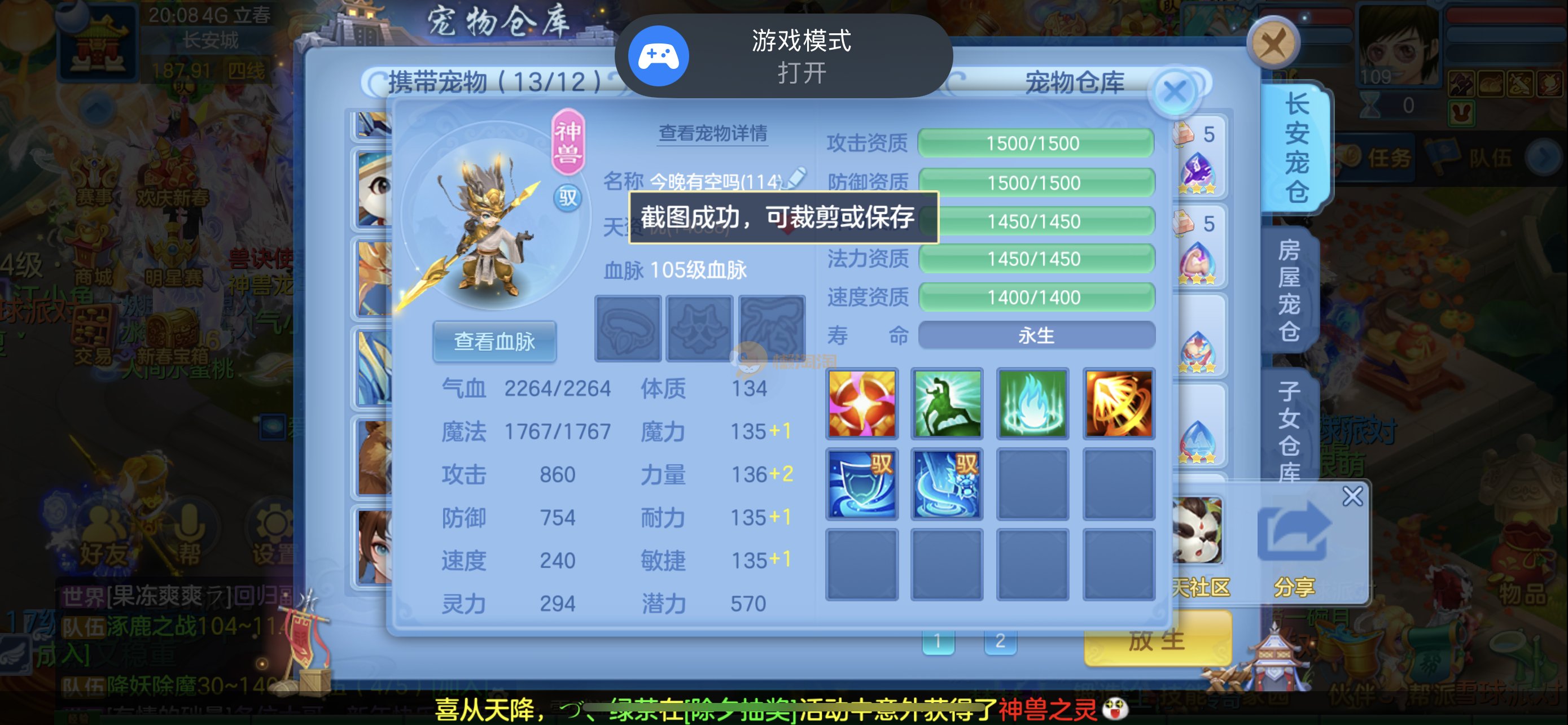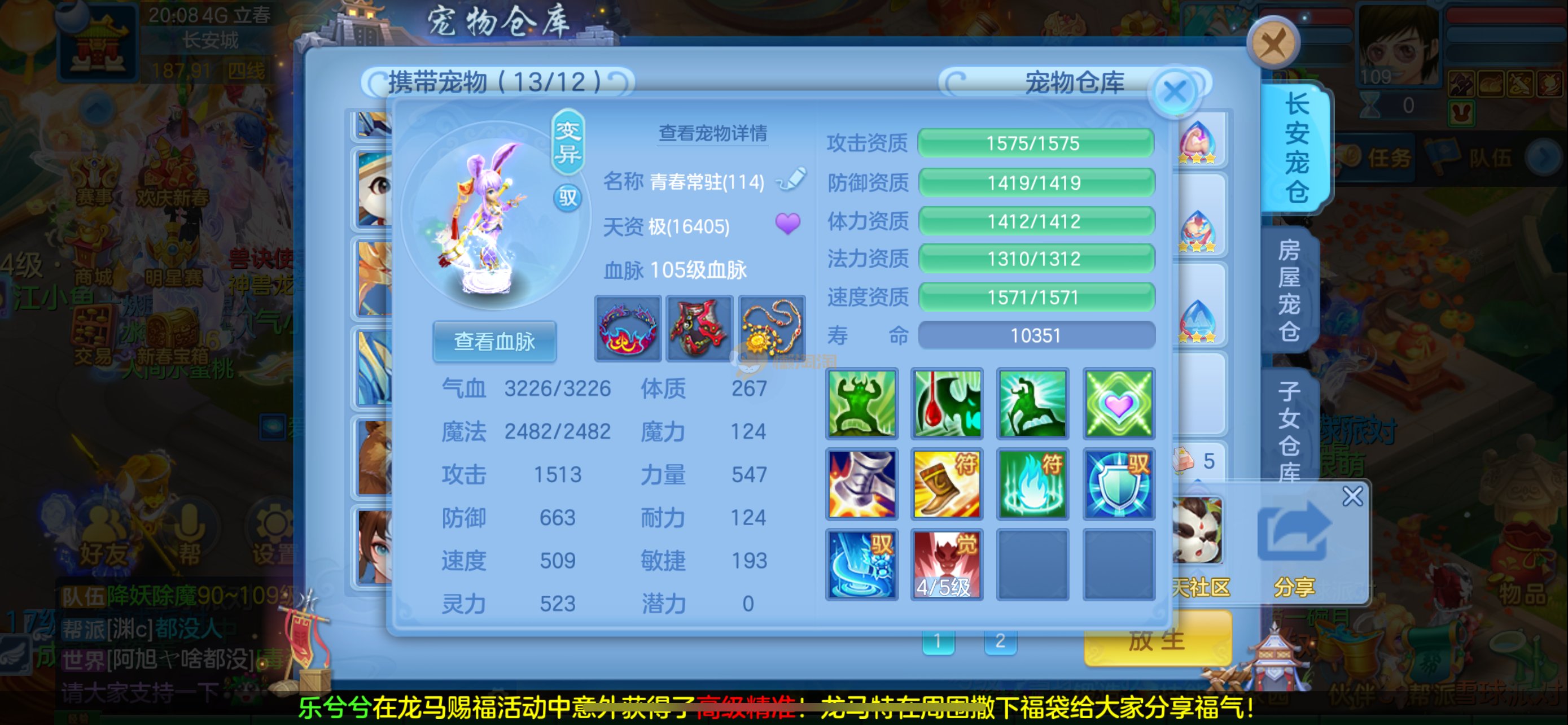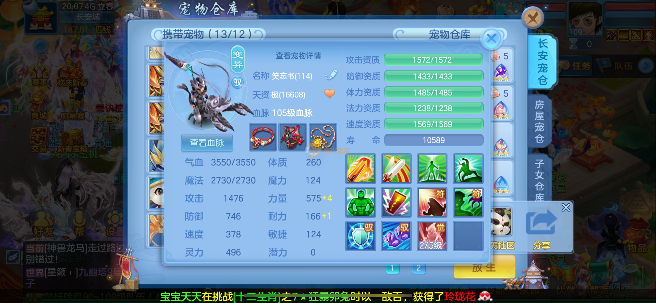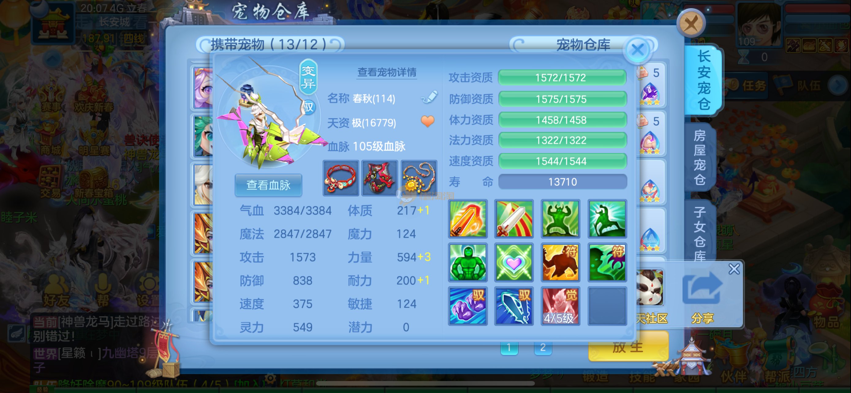 强化仙一龙两蛇一马。特技齐全,宝宝皮肤全,10个满兽魂,辅助特技妙手。13段混12,还有145万银,1884金,坐骑衣橱全,单身海景房,资源满满