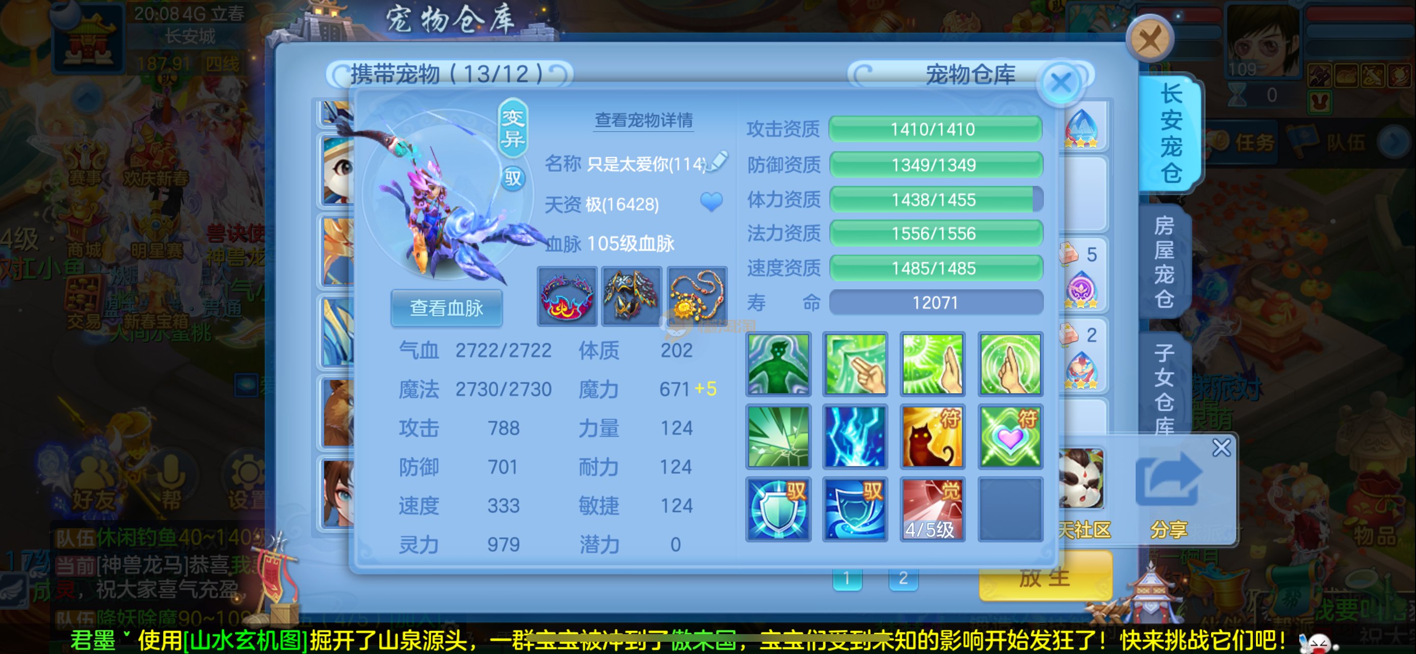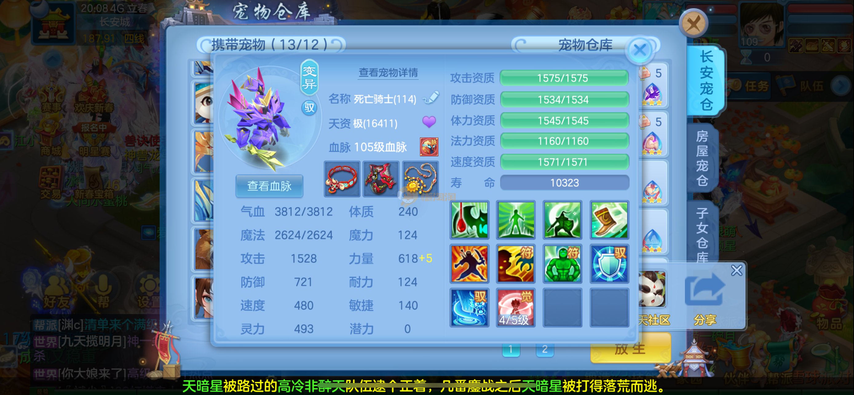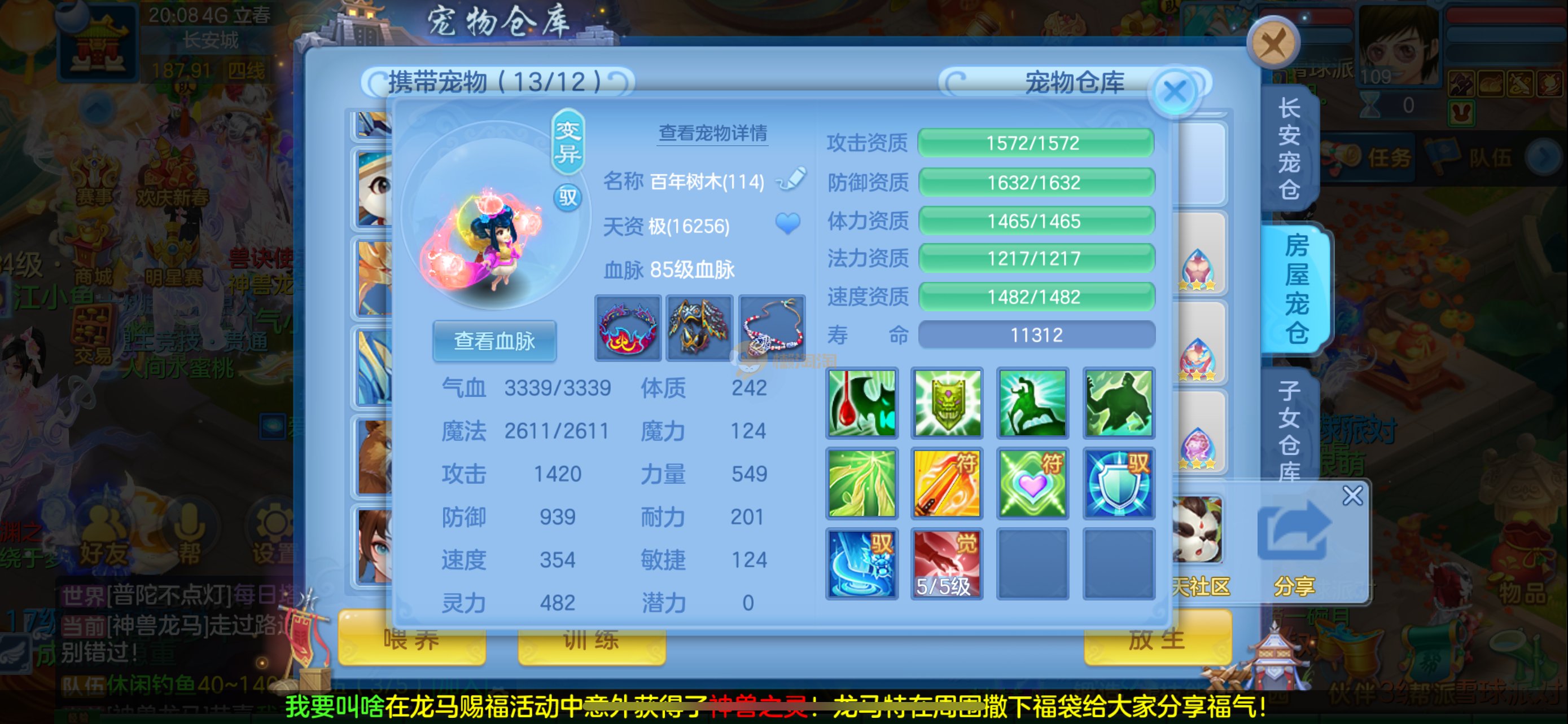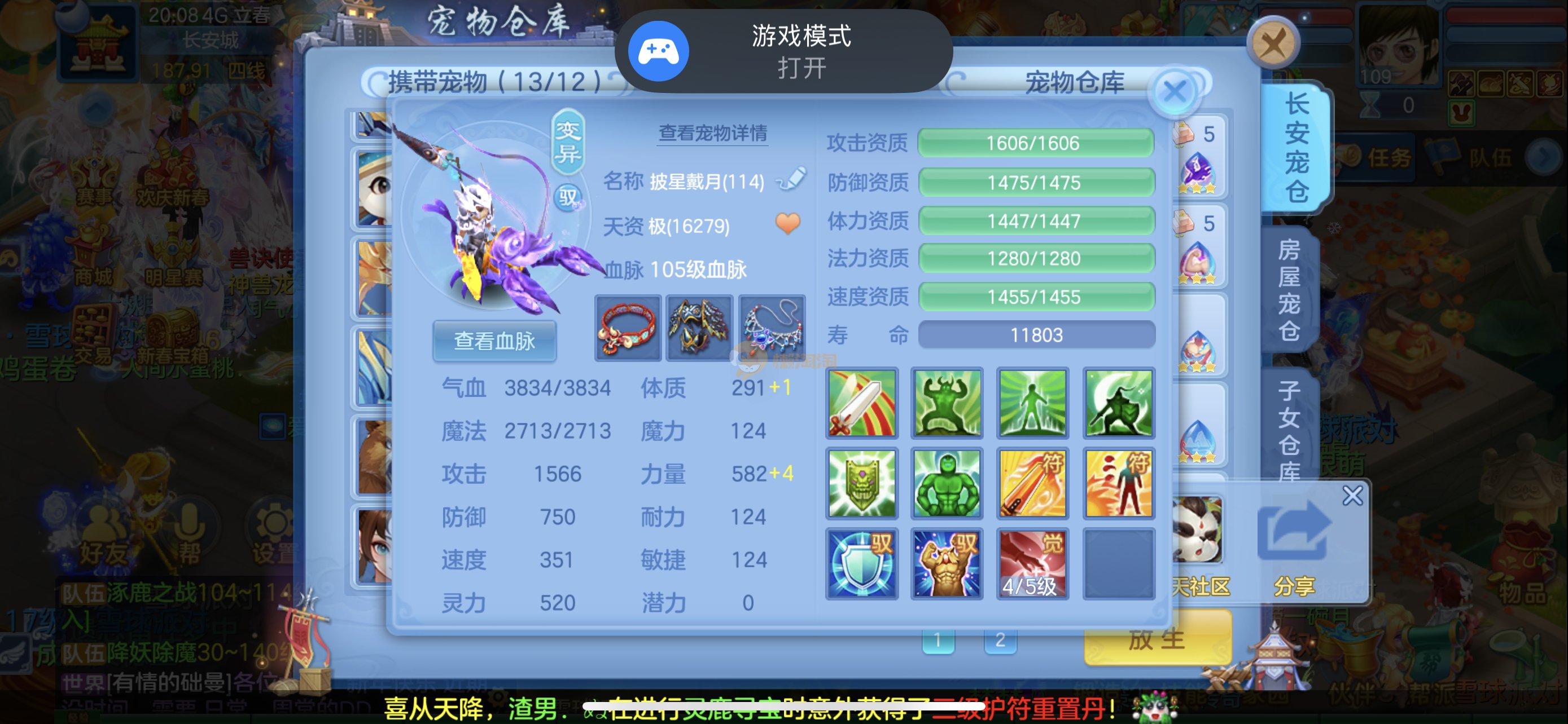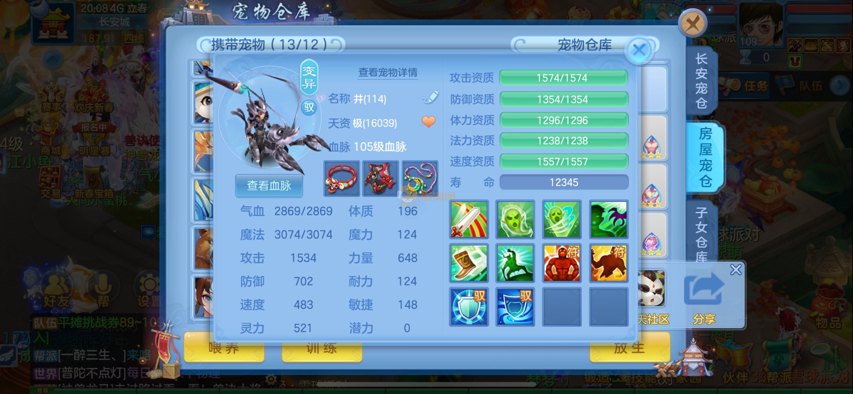 强化仙一龙两蛇一马。特技齐全,宝宝皮肤全,10个满兽魂,辅助特技妙手。13段混12,还有145万银,1884金,坐骑衣橱全,单身海景房,资源满满