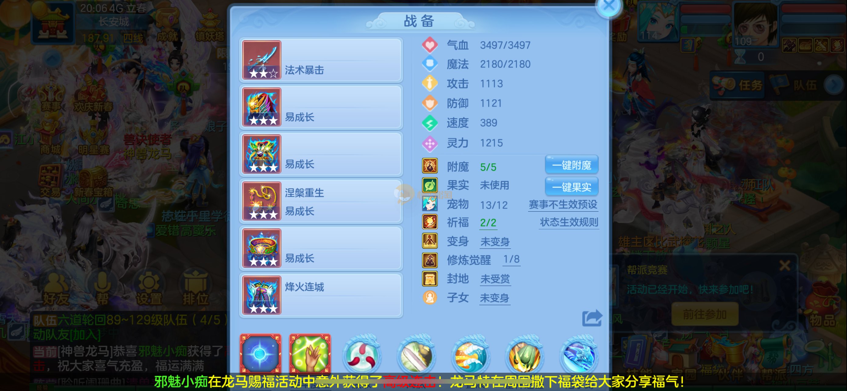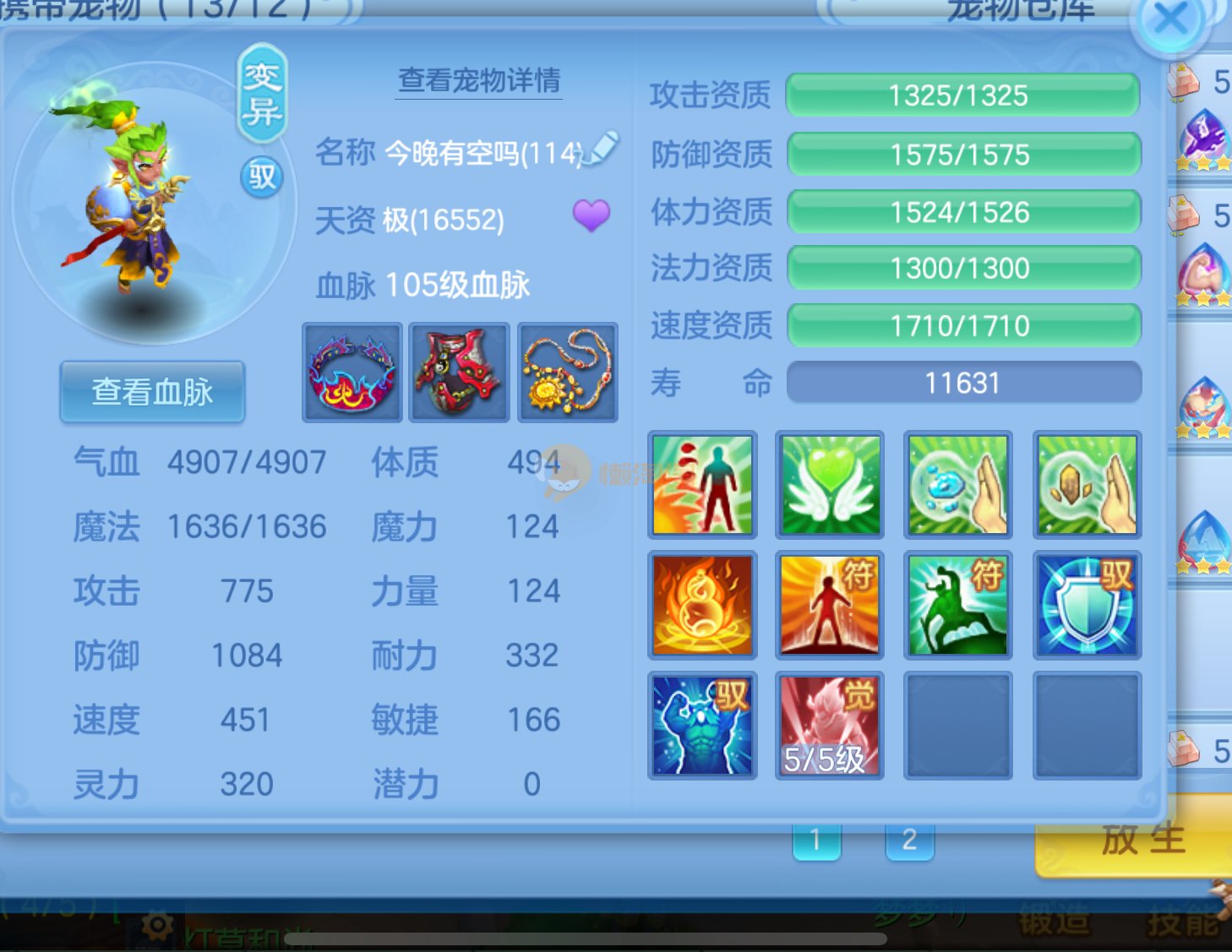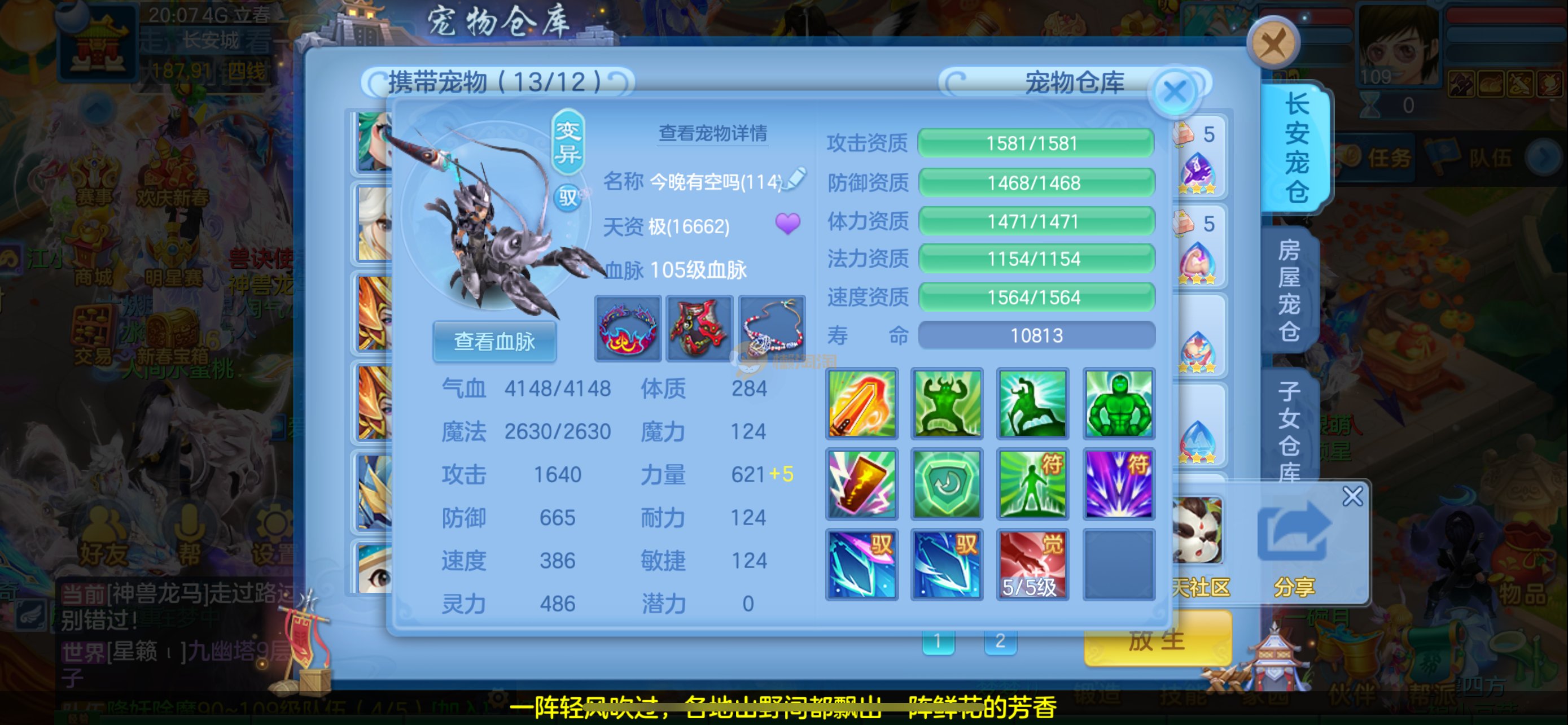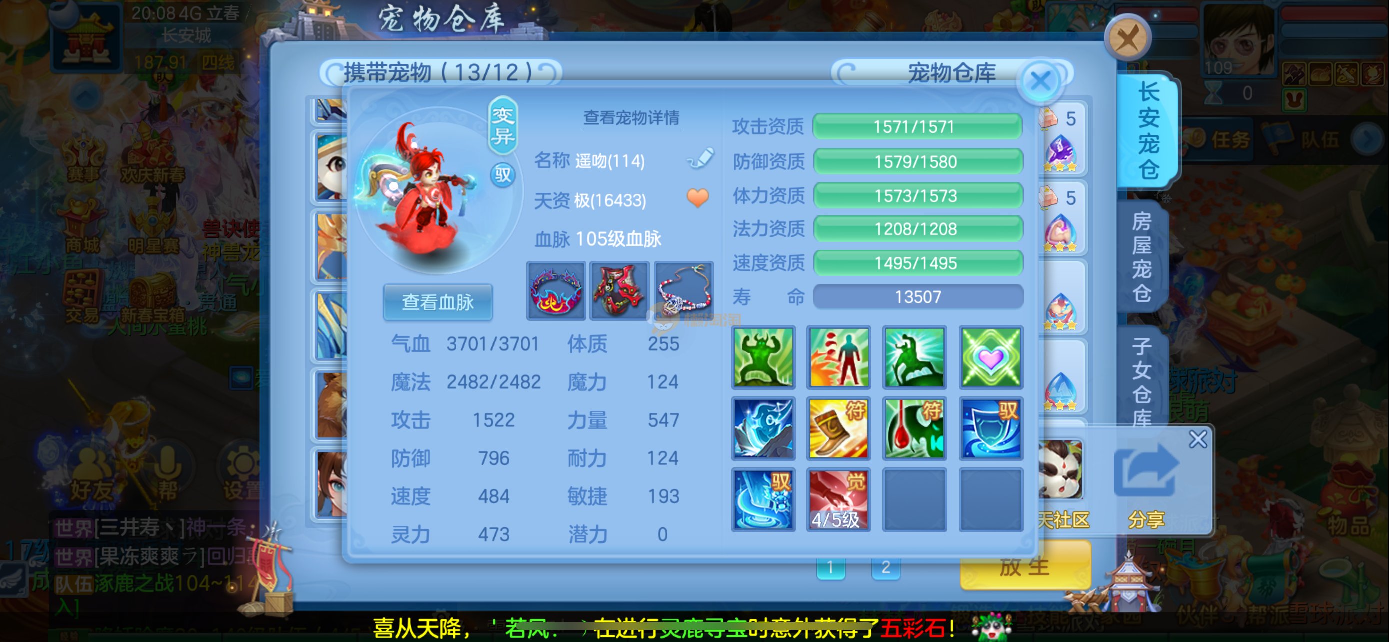 强化仙一龙两蛇一马。特技齐全,宝宝皮肤全,10个满兽魂,辅助特技妙手。13段混12,还有145万银,1884金,坐骑衣橱全,单身海景房,资源满满