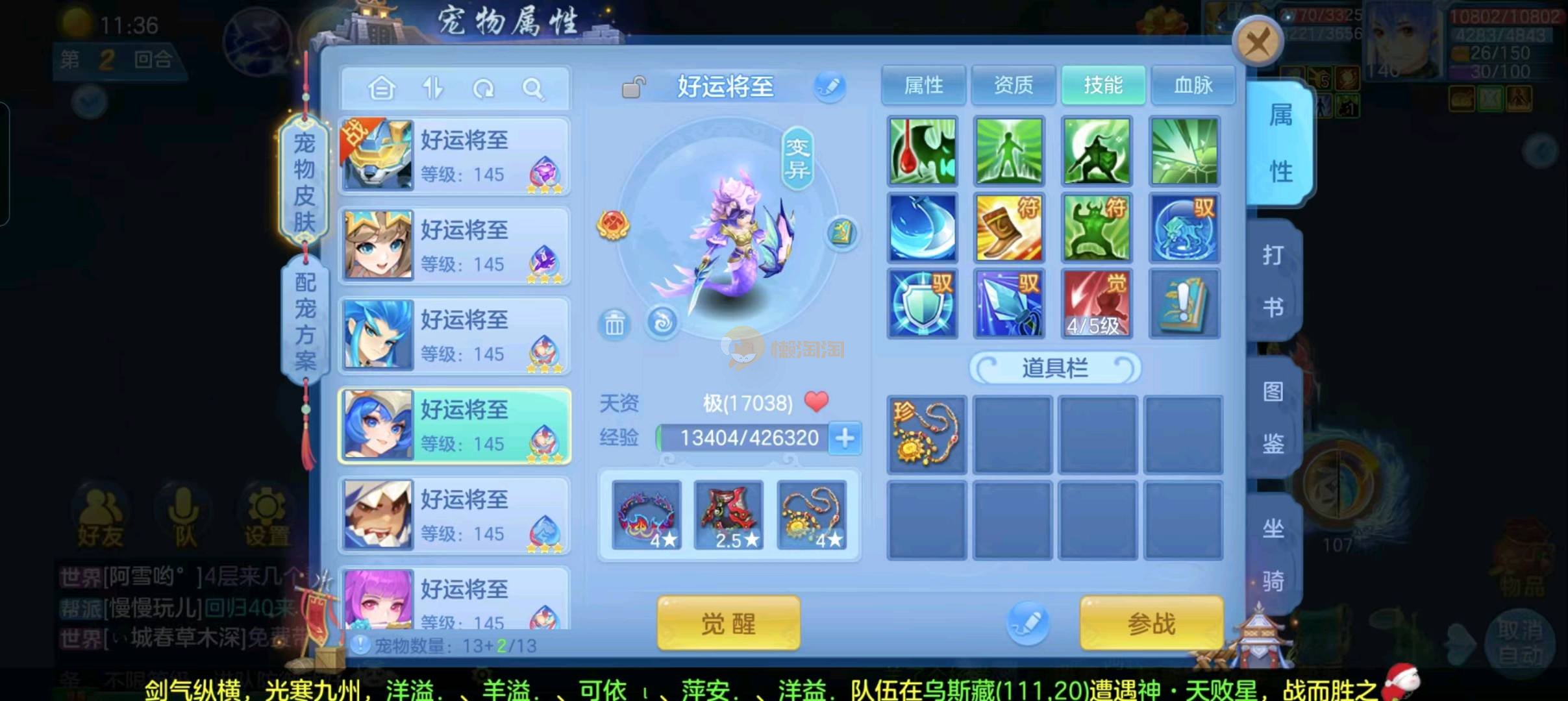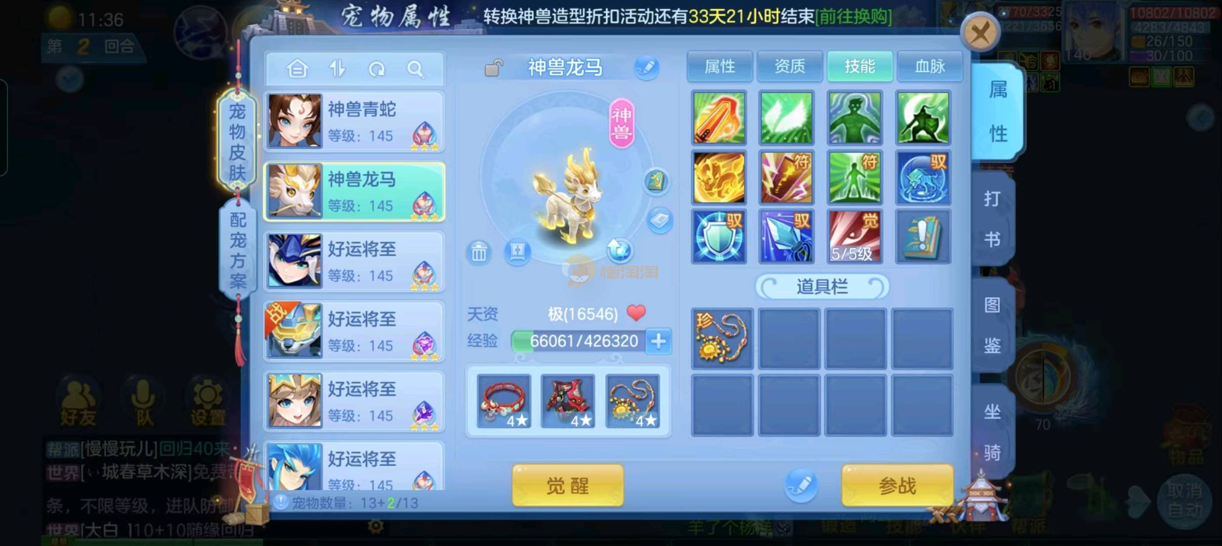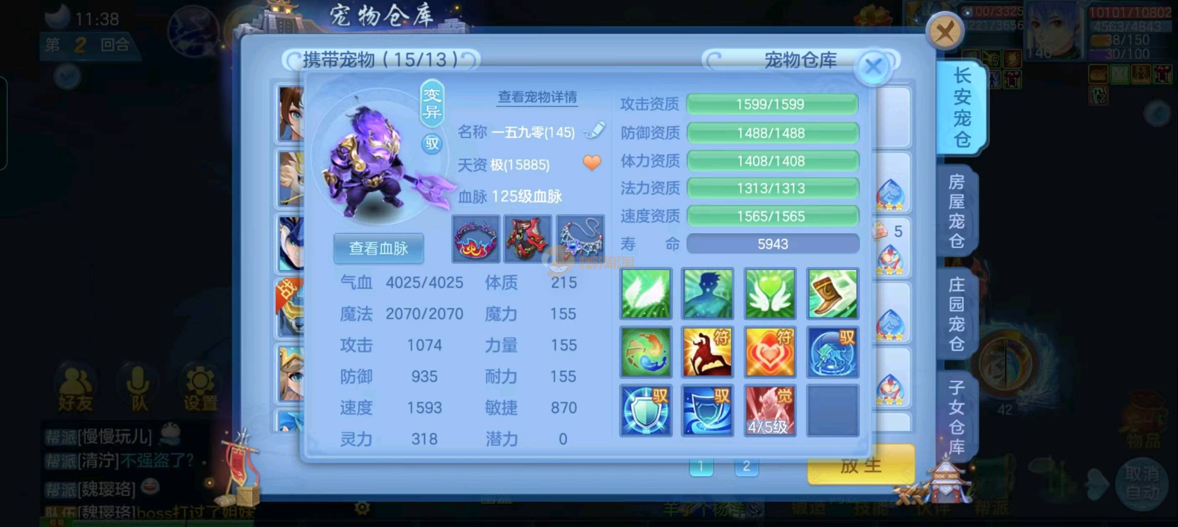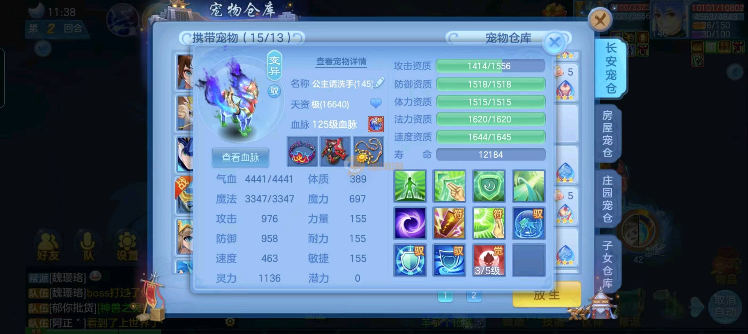 强化仙一龙两蛇一马。特技齐全,宝宝皮肤全,10个满兽魂,辅助特技妙手。13段混12,还有145万银,1884金,坐骑衣橱全,单身海景房,资源满满
