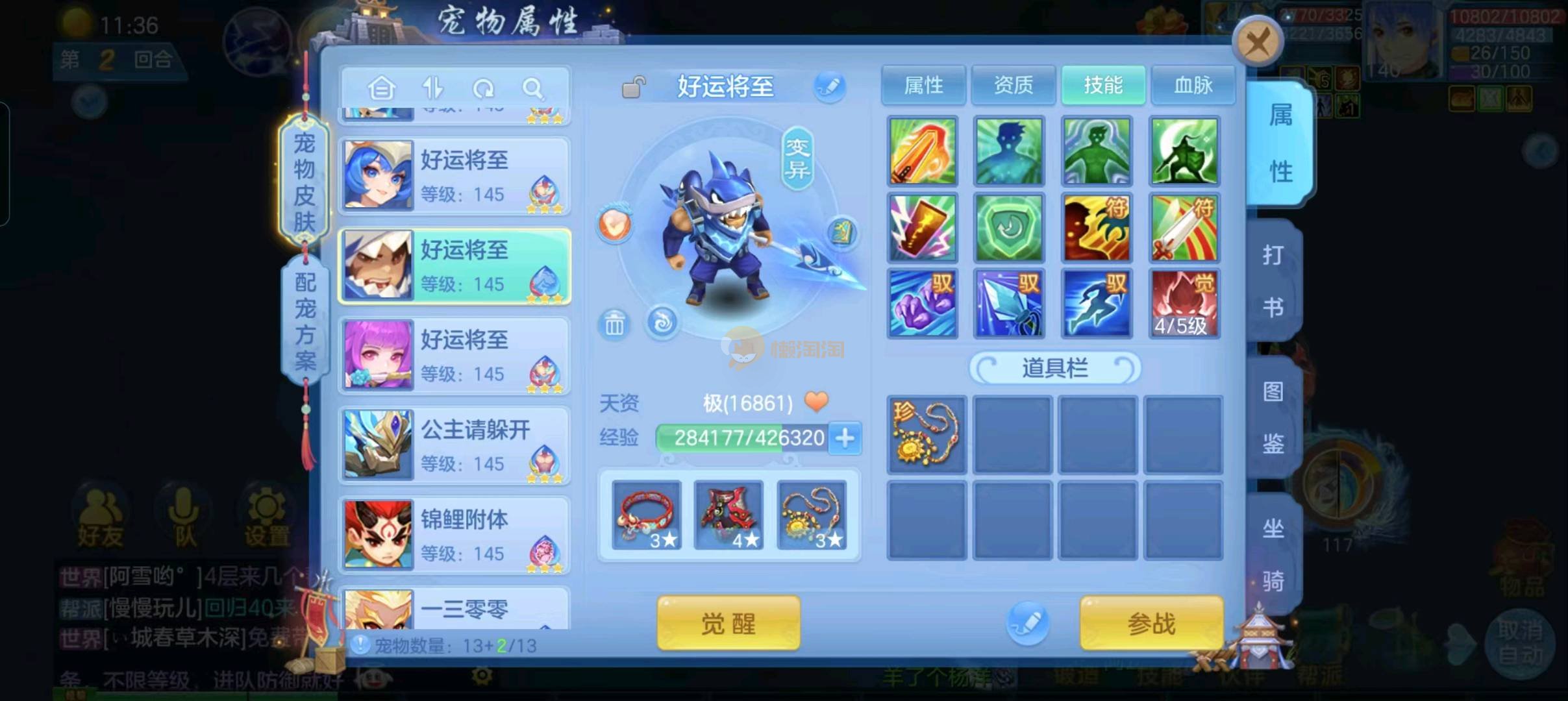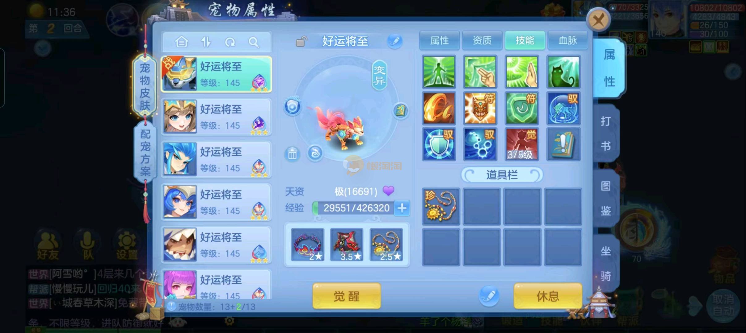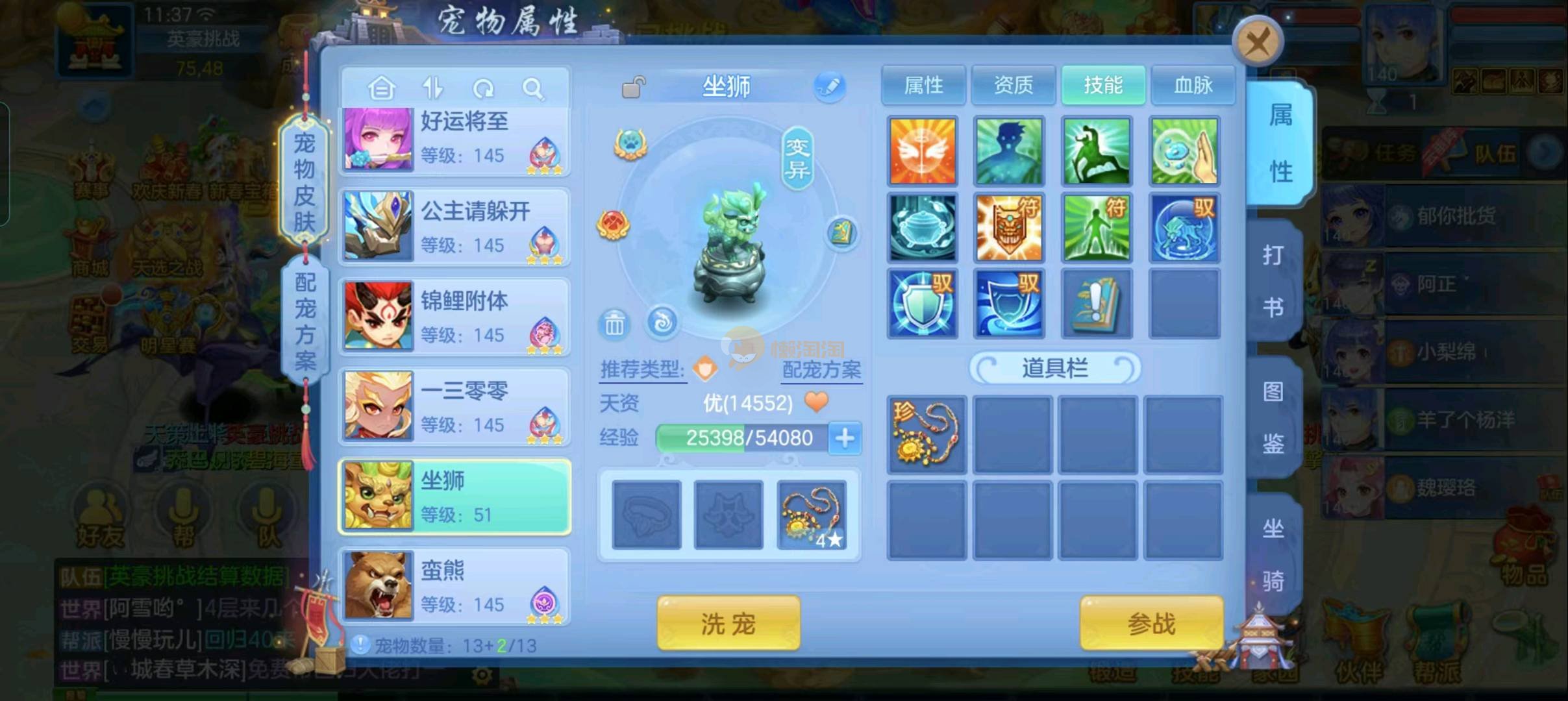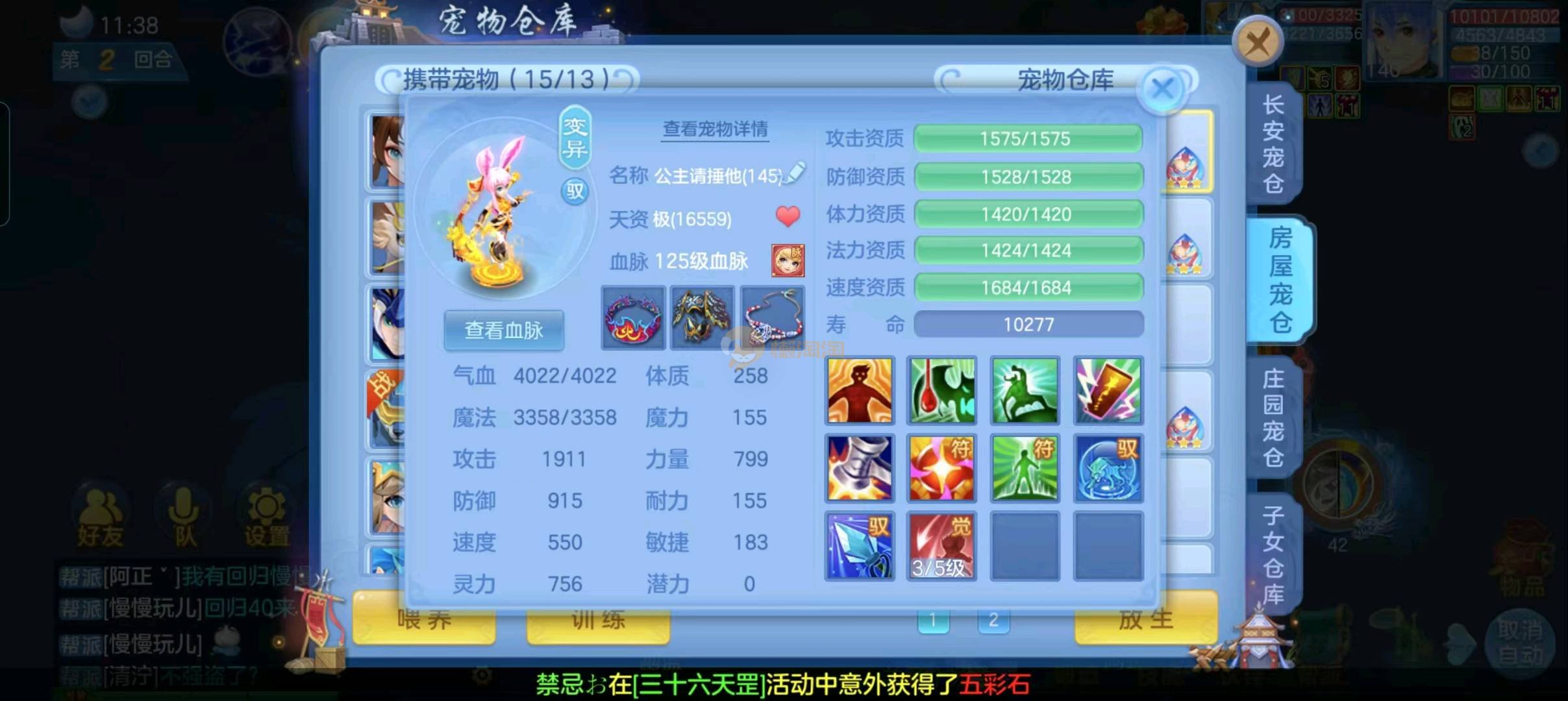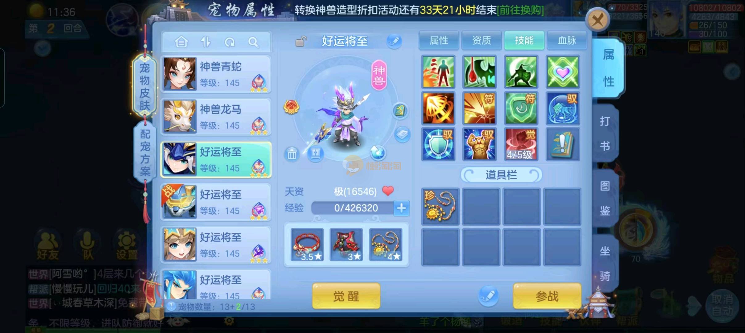 强化仙一龙两蛇一马。特技齐全,宝宝皮肤全,10个满兽魂,辅助特技妙手。13段混12,还有145万银,1884金,坐骑衣橱全,单身海景房,资源满满