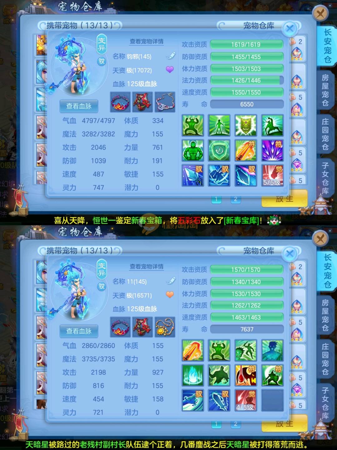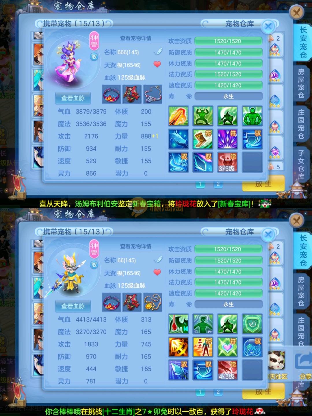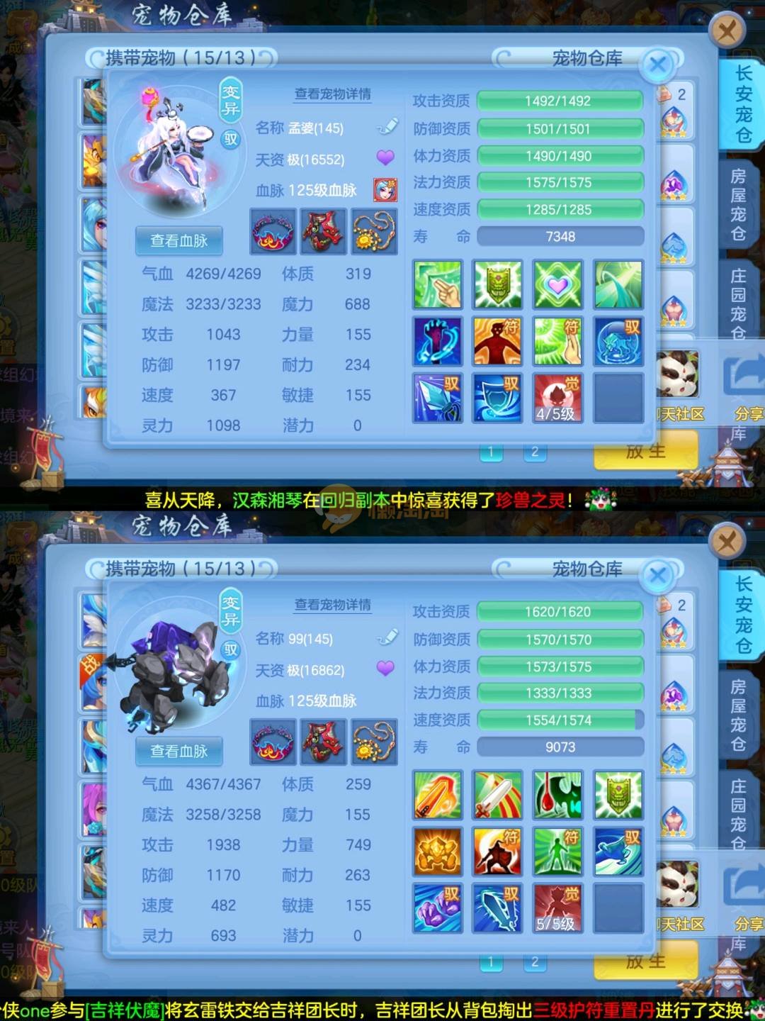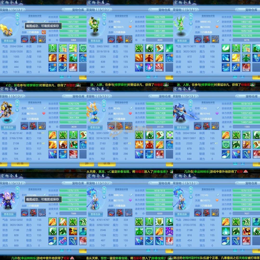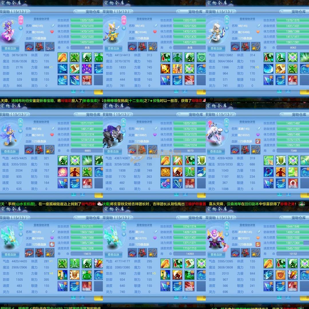 强化仙一龙两蛇一马。特技齐全,宝宝皮肤全,10个满兽魂,辅助特技妙手。13段混12,还有145万银,1884金,坐骑衣橱全,单身海景房,资源满满