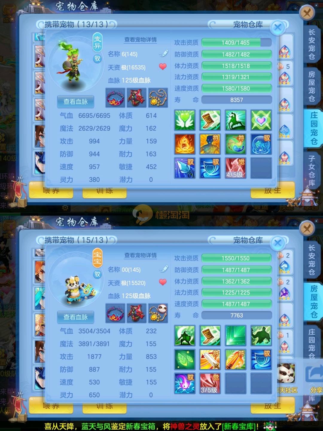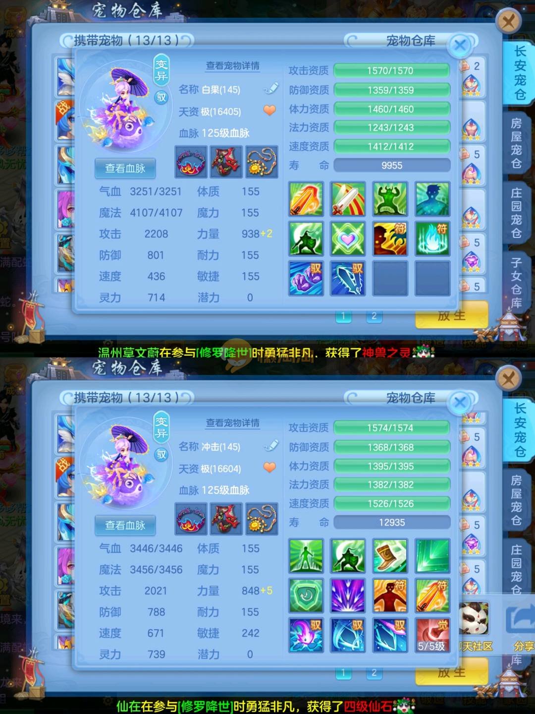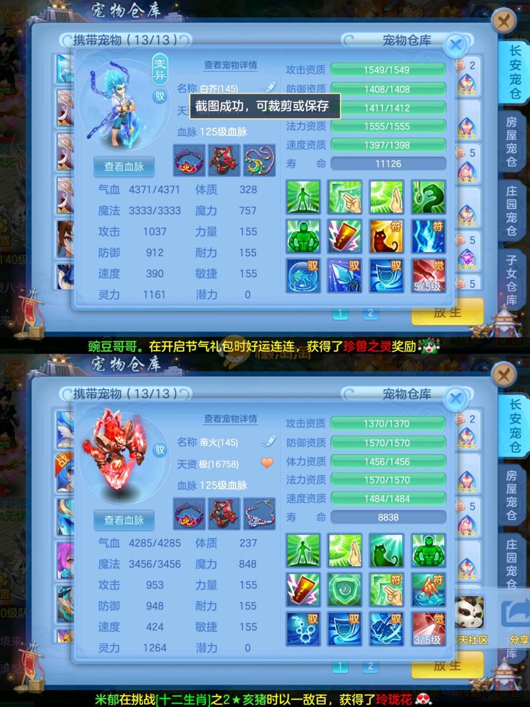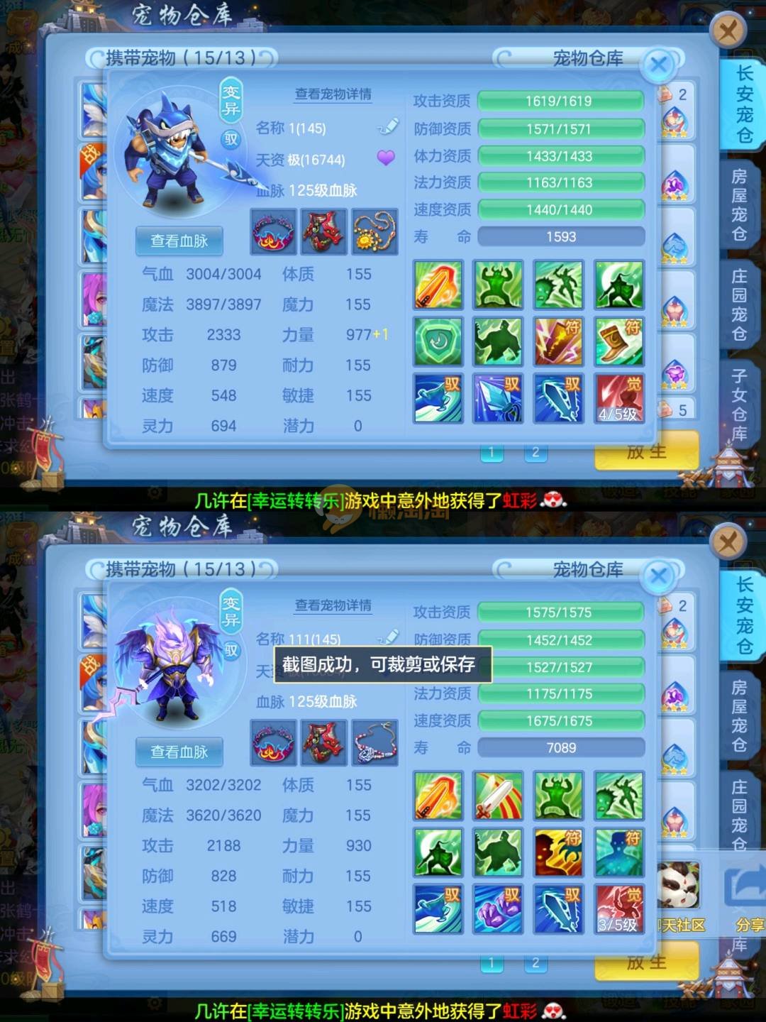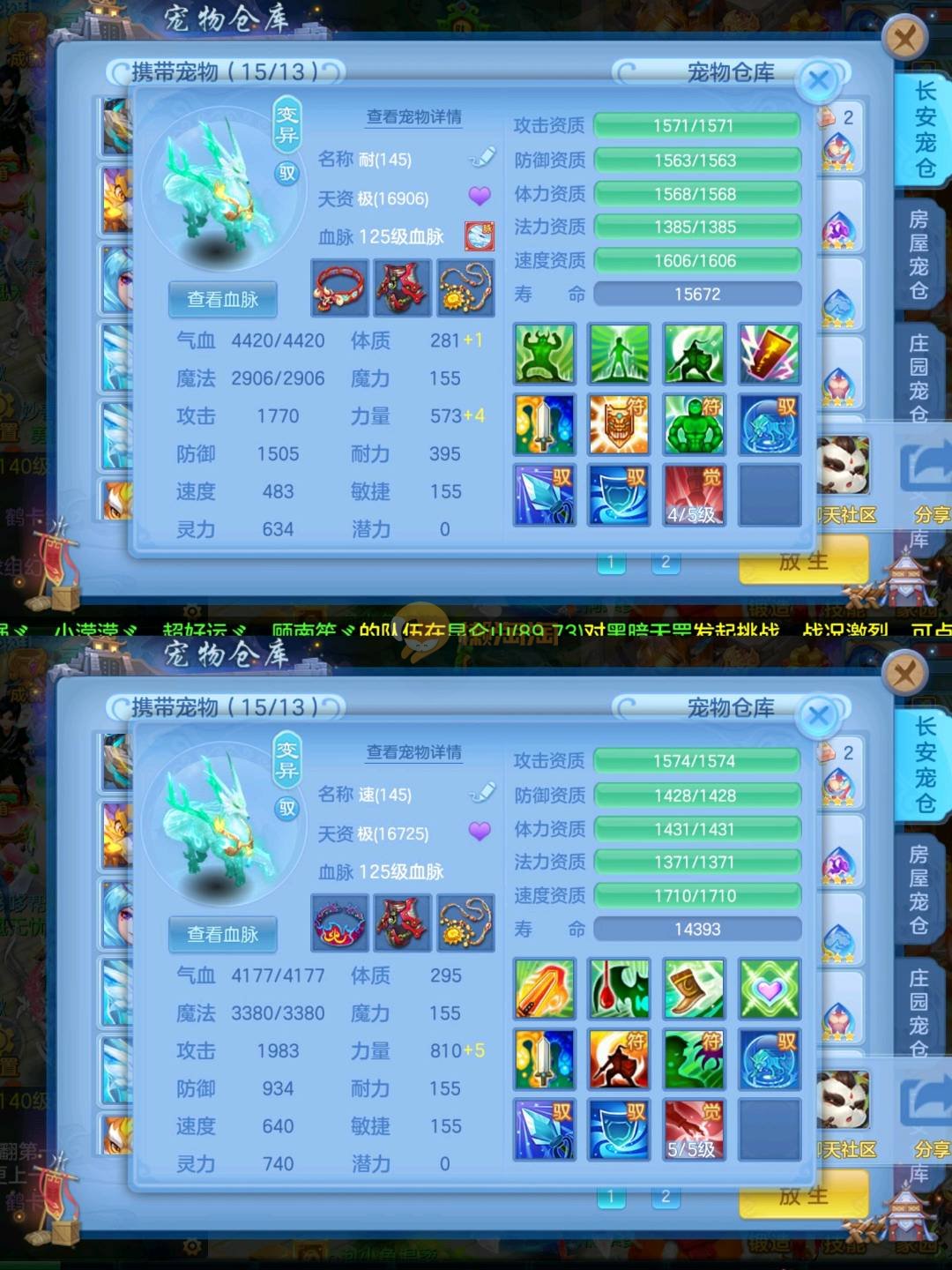 强化仙一龙两蛇一马。特技齐全,宝宝皮肤全,10个满兽魂,辅助特技妙手。13段混12,还有145万银,1884金,坐骑衣橱全,单身海景房,资源满满