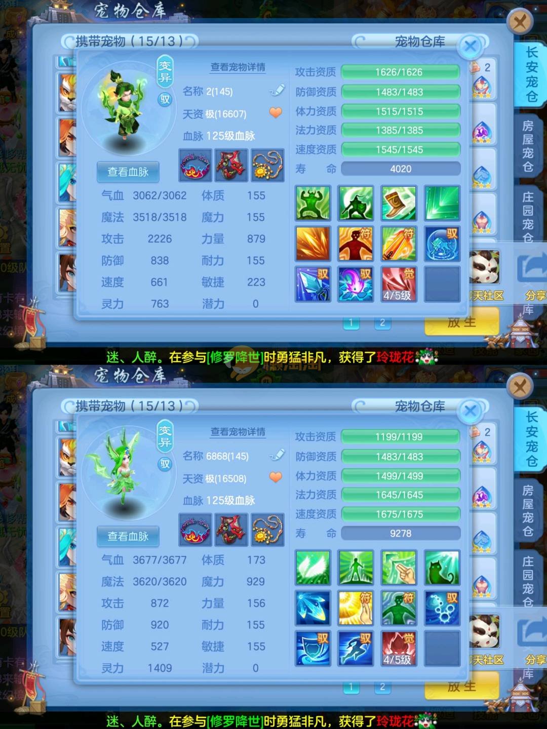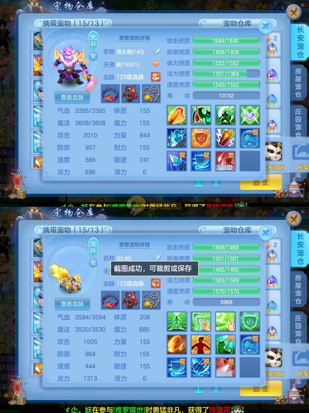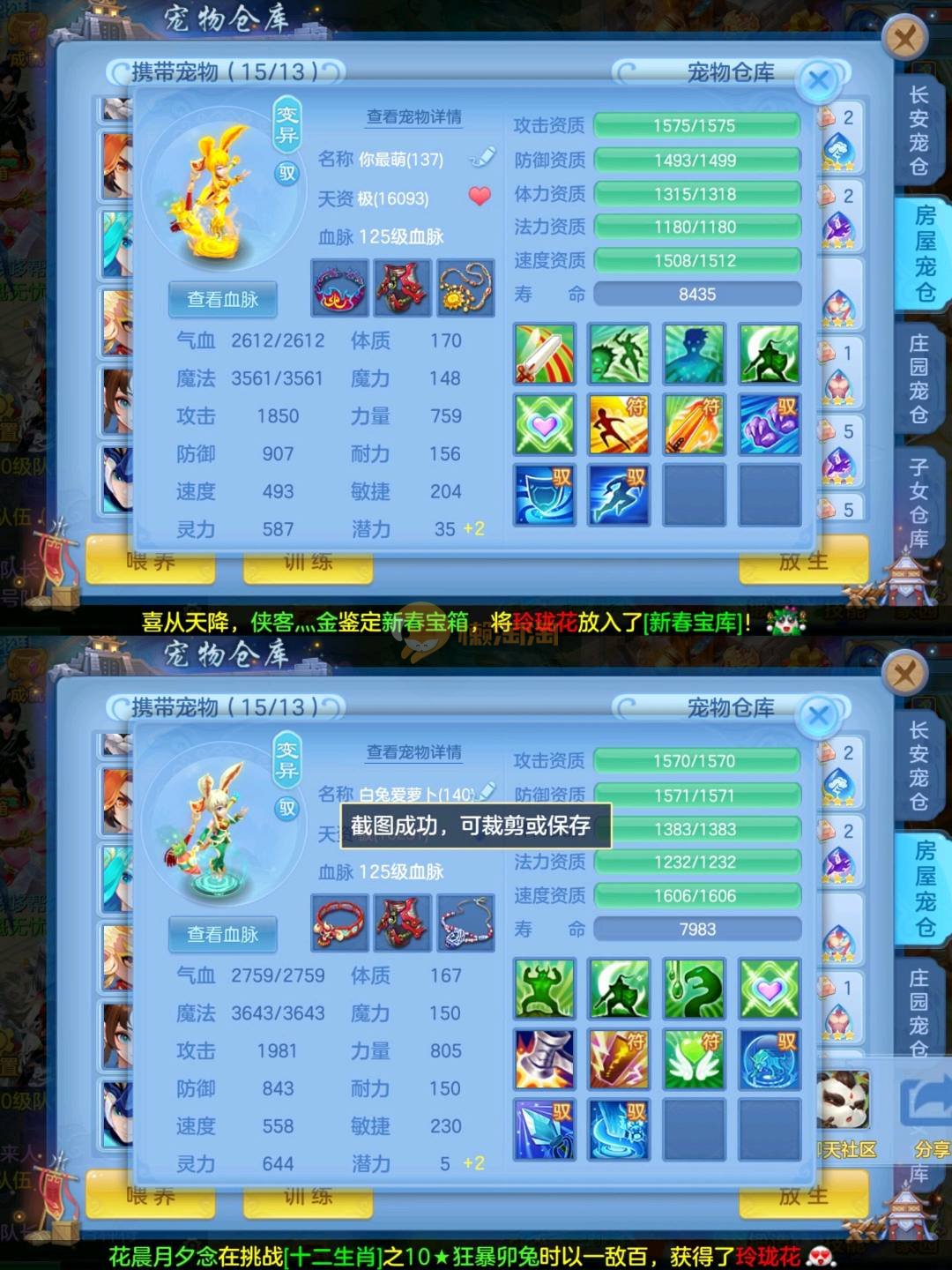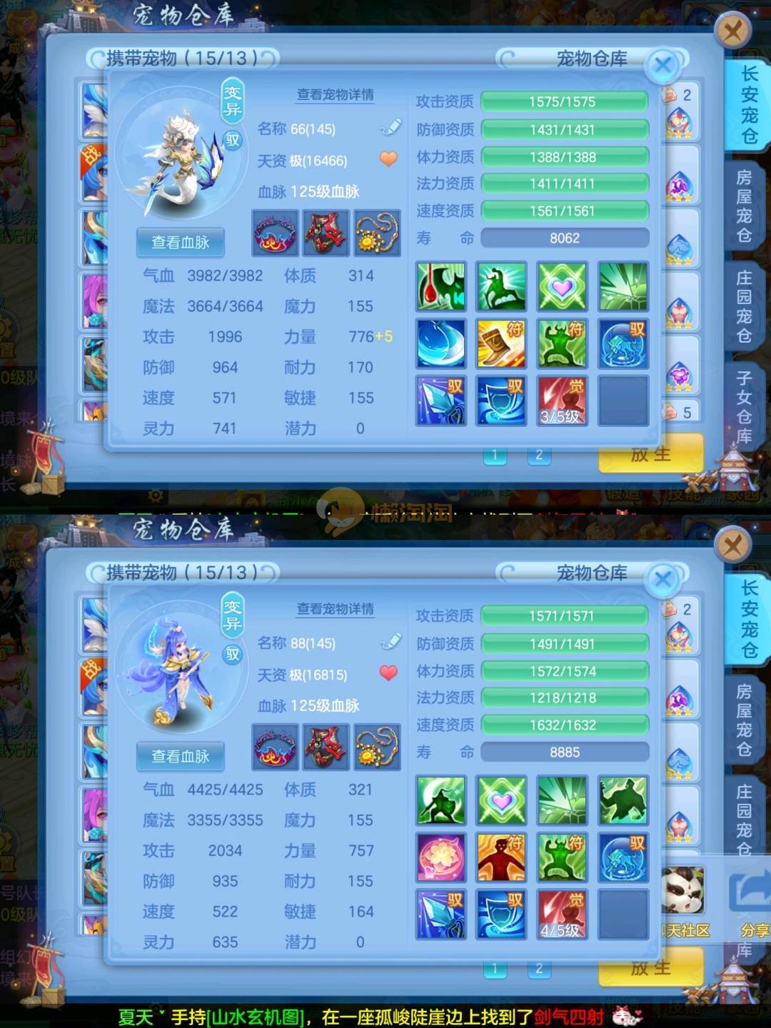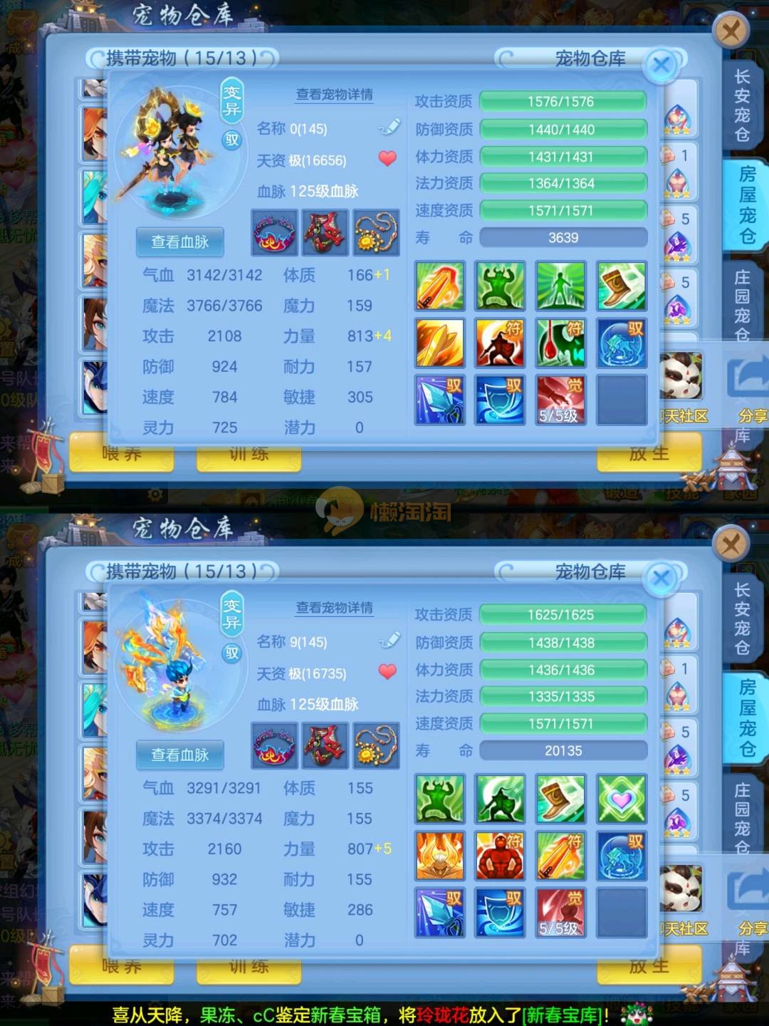 强化仙一龙两蛇一马。特技齐全,宝宝皮肤全,10个满兽魂,辅助特技妙手。13段混12,还有145万银,1884金,坐骑衣橱全,单身海景房,资源满满