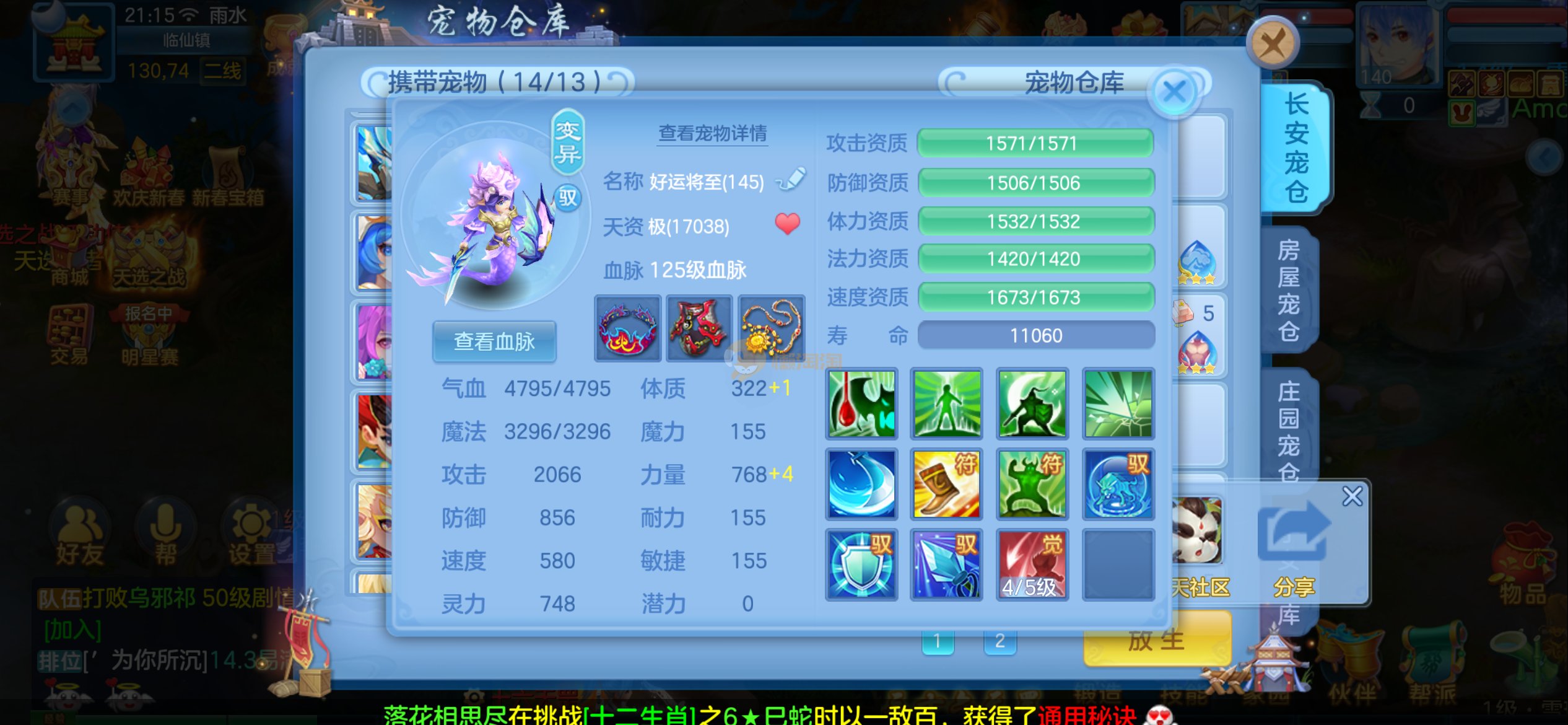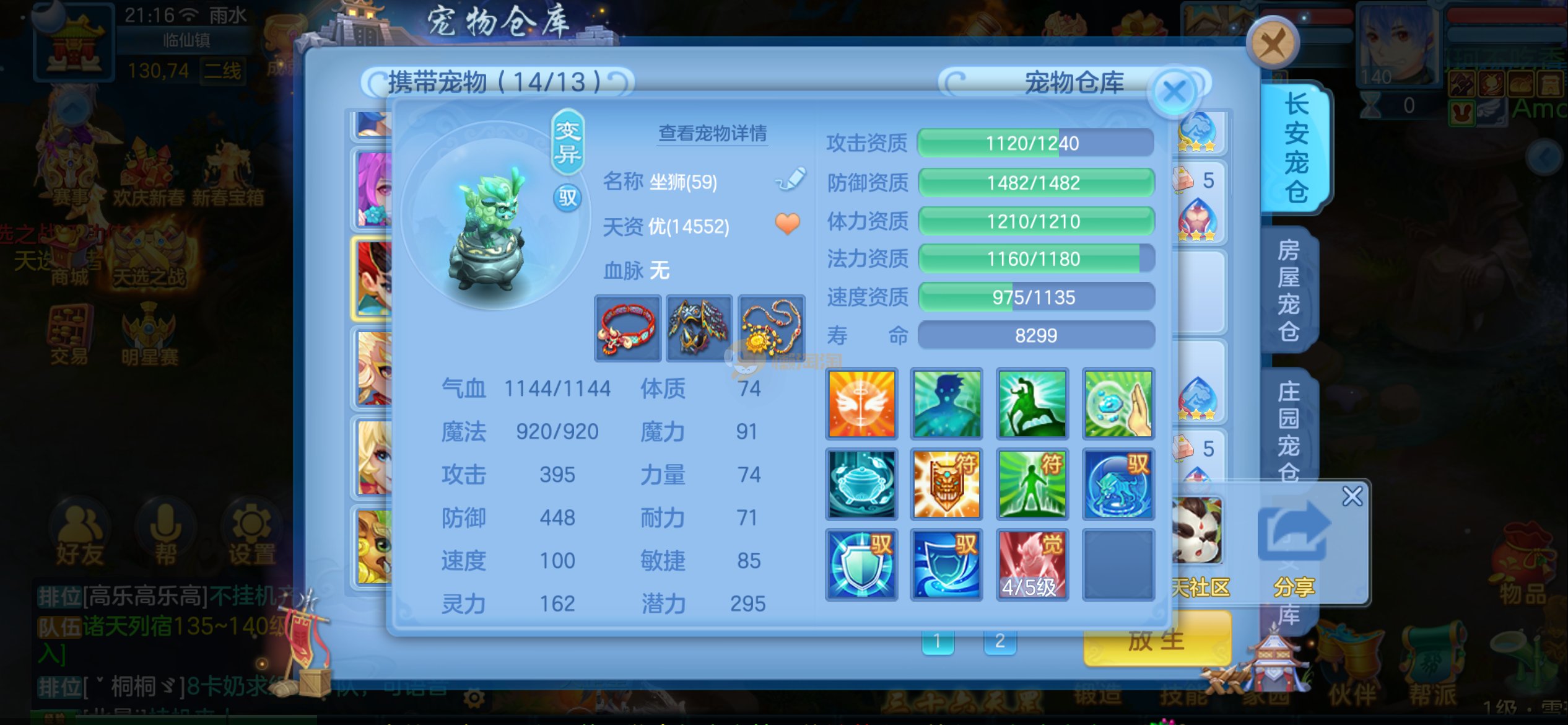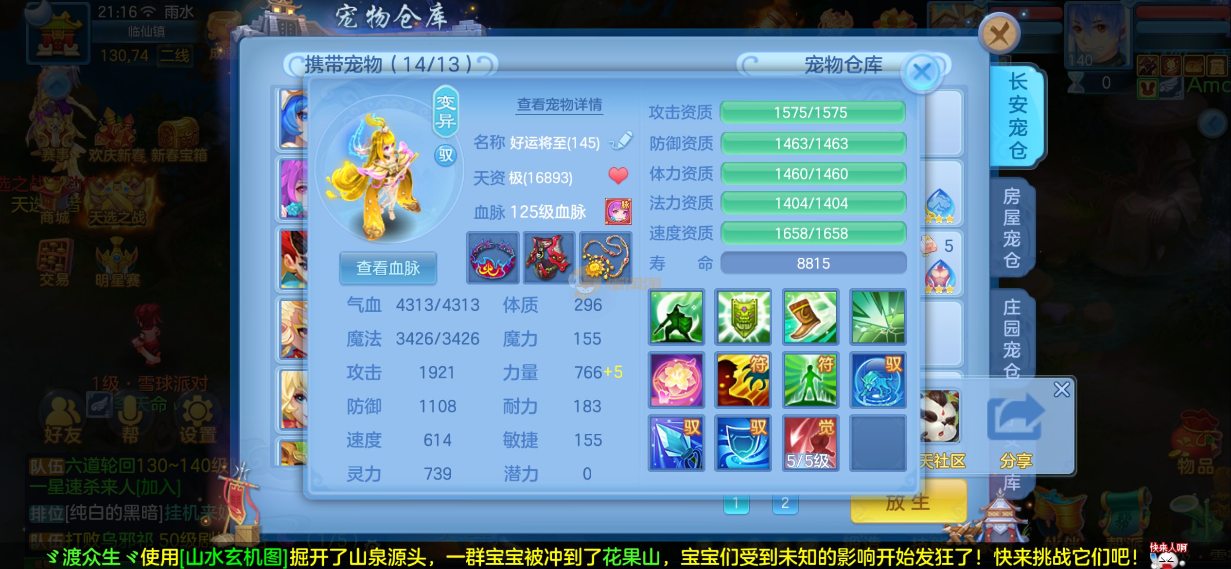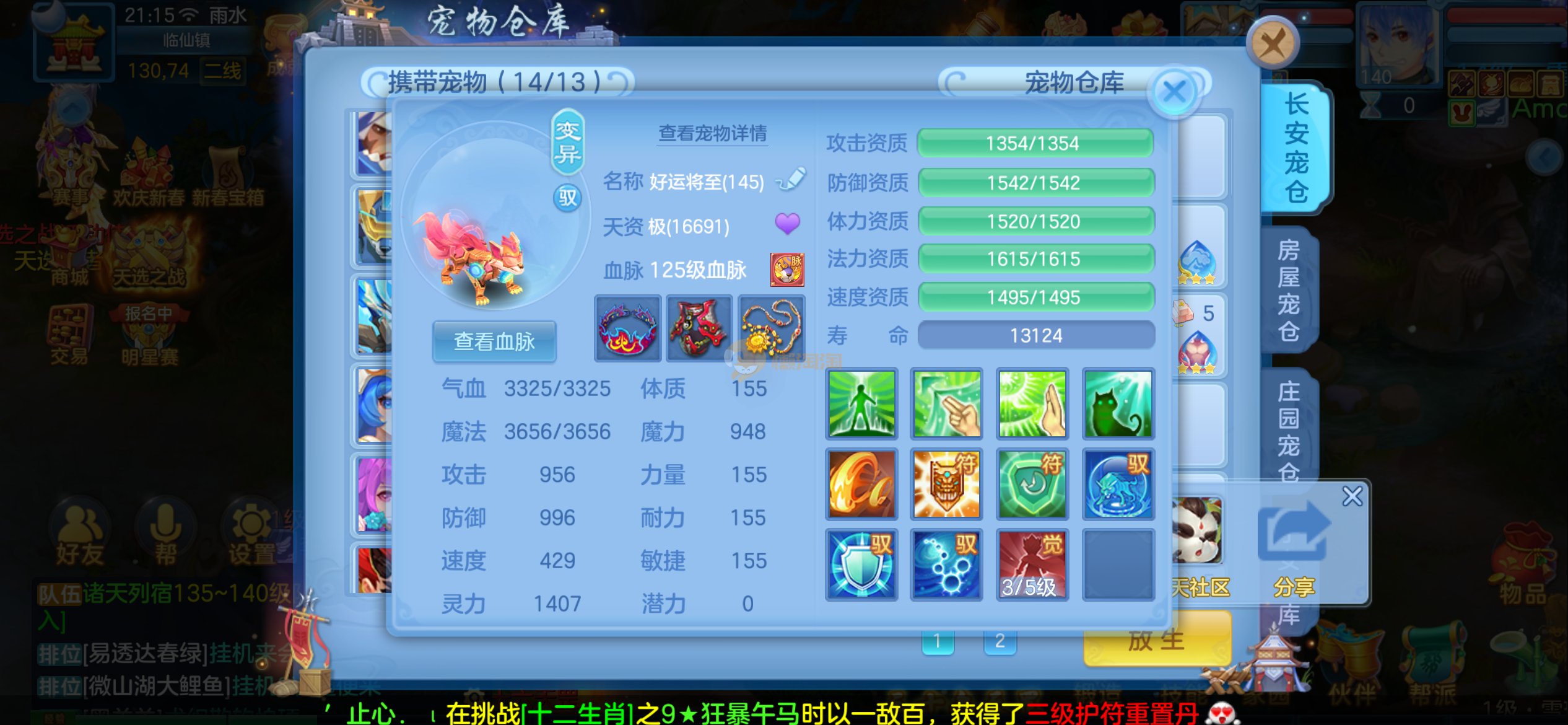 强化仙一龙两蛇一马。特技齐全,宝宝皮肤全,10个满兽魂,辅助特技妙手。13段混12,还有145万银,1884金,坐骑衣橱全,单身海景房,资源满满