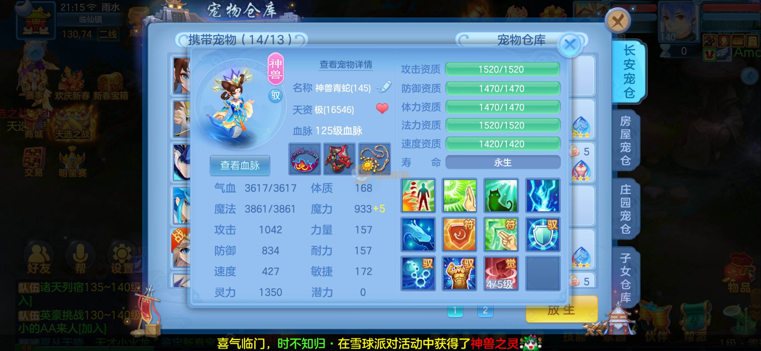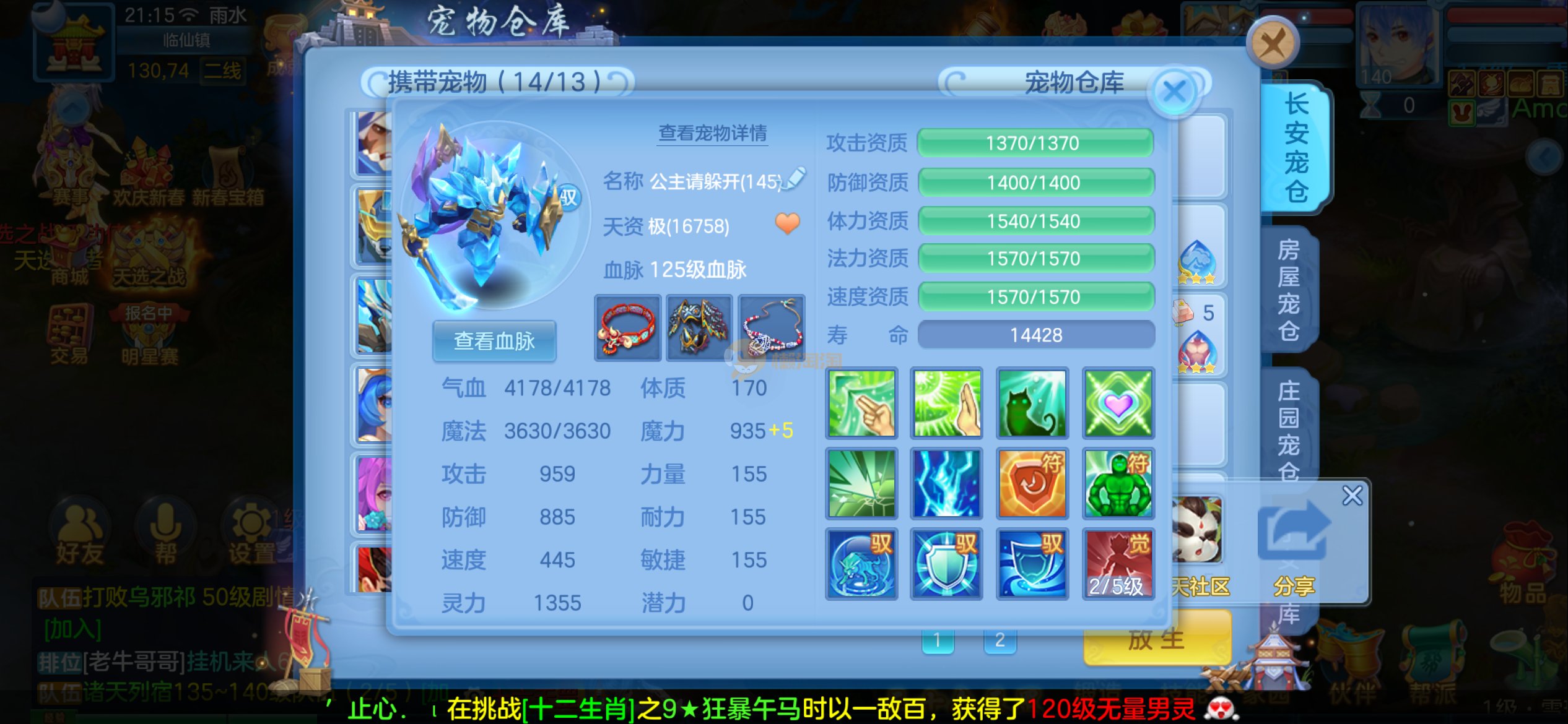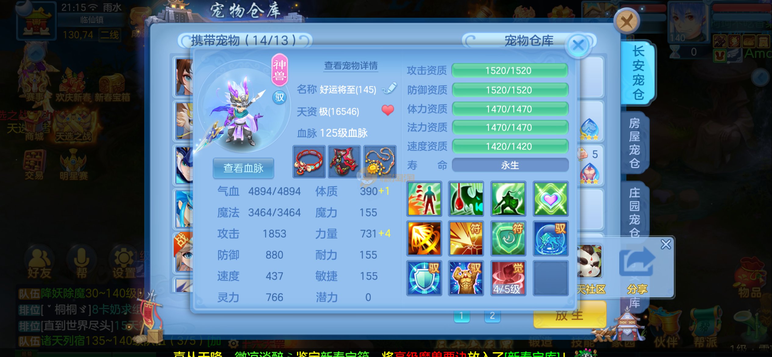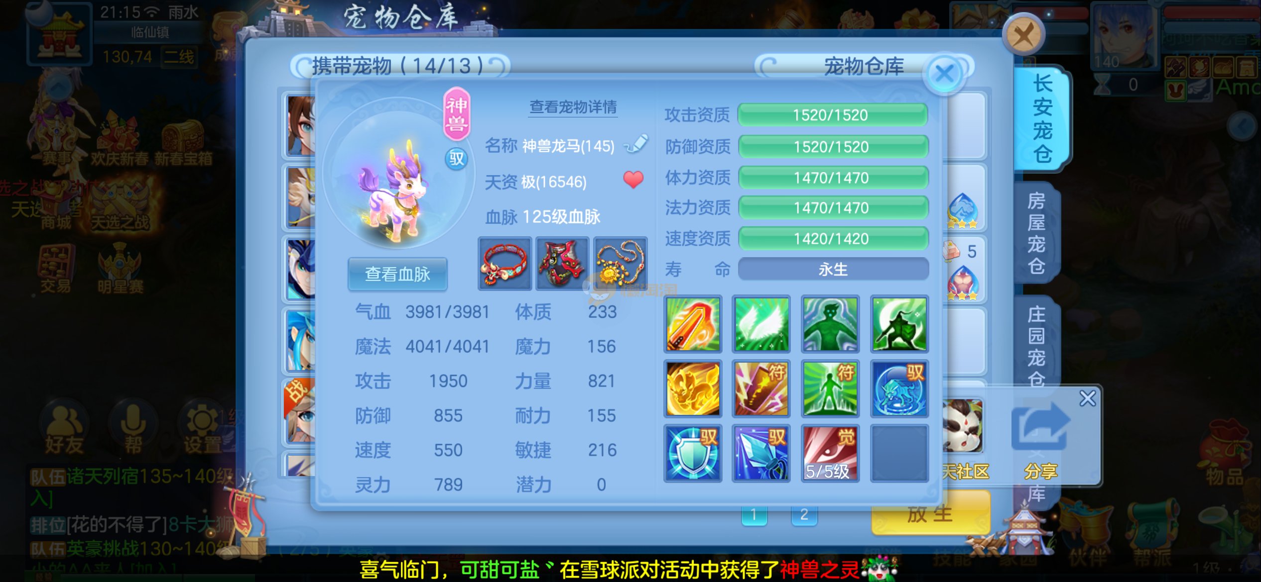 强化仙一龙两蛇一马。特技齐全,宝宝皮肤全,10个满兽魂,辅助特技妙手。13段混12,还有145万银,1884金,坐骑衣橱全,单身海景房,资源满满