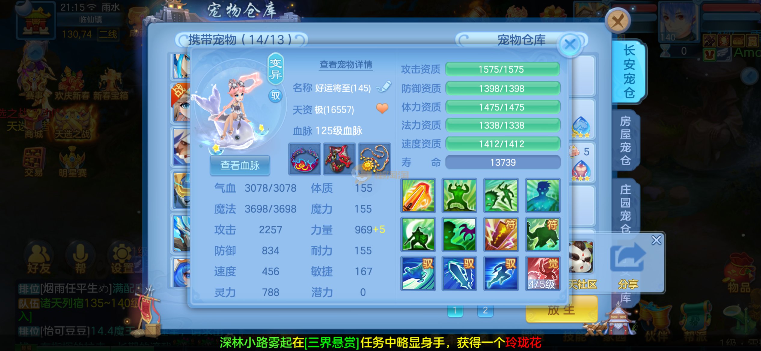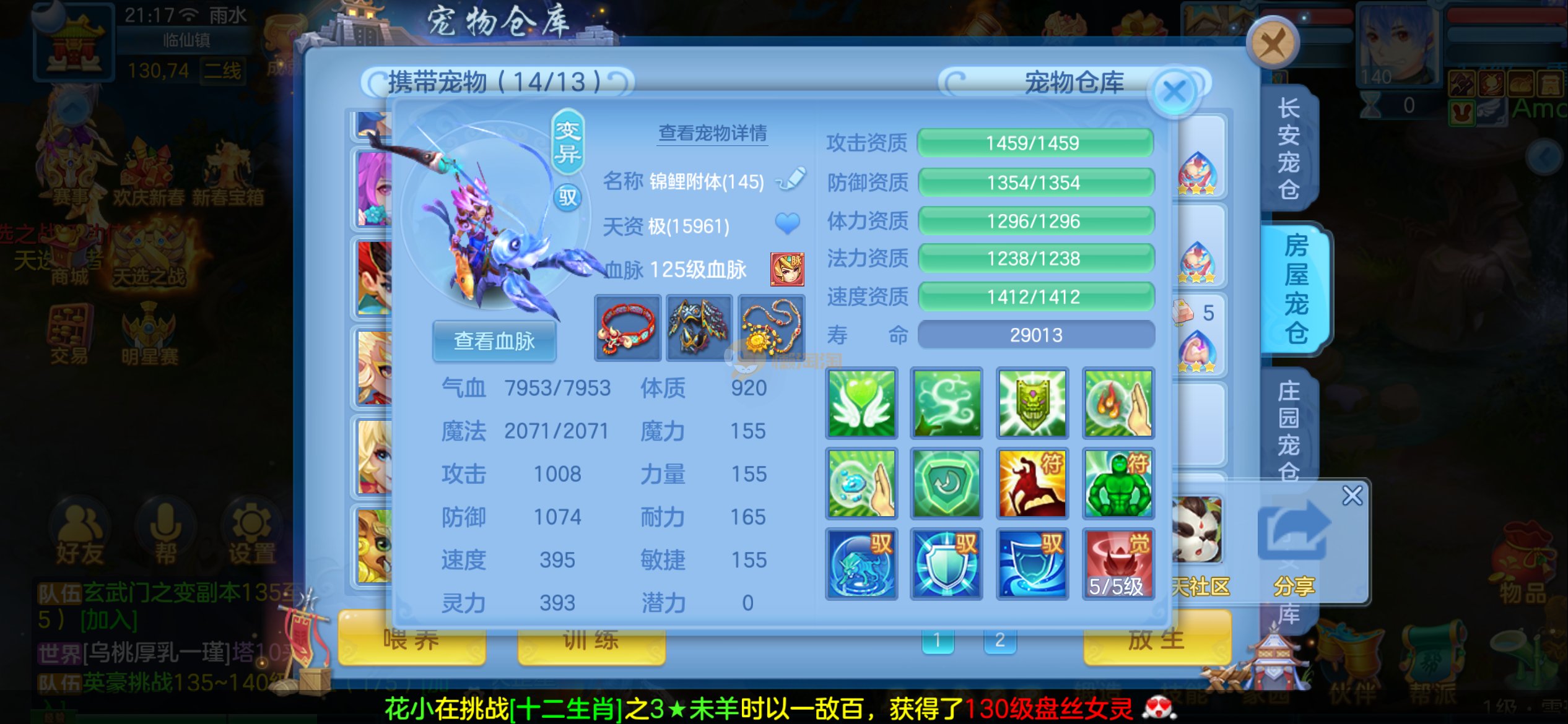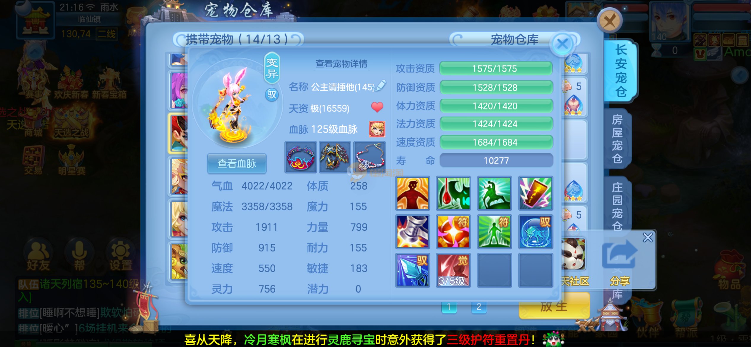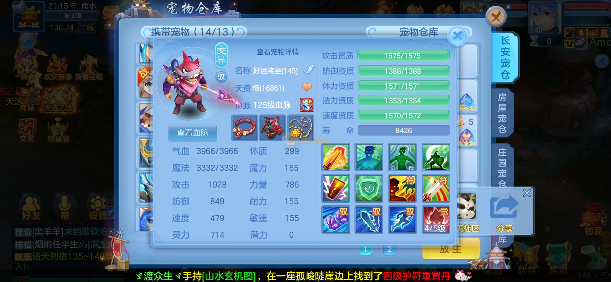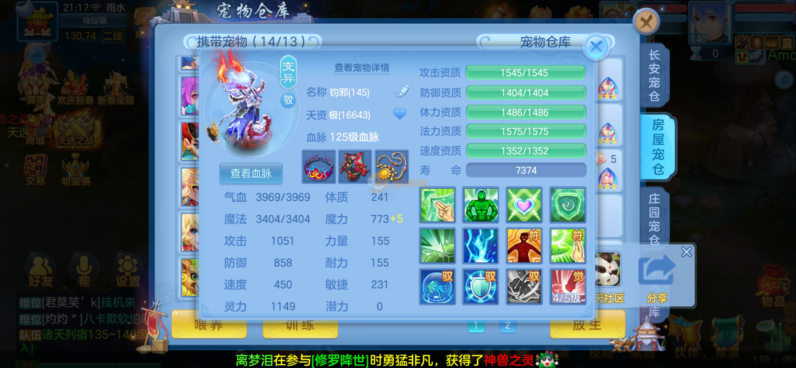 强化仙一龙两蛇一马。特技齐全,宝宝皮肤全,10个满兽魂,辅助特技妙手。13段混12,还有145万银,1884金,坐骑衣橱全,单身海景房,资源满满