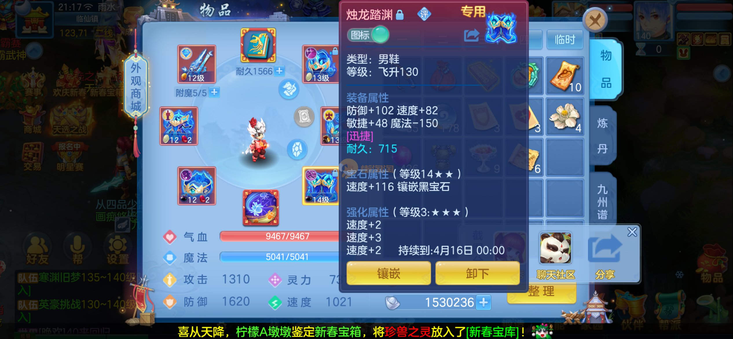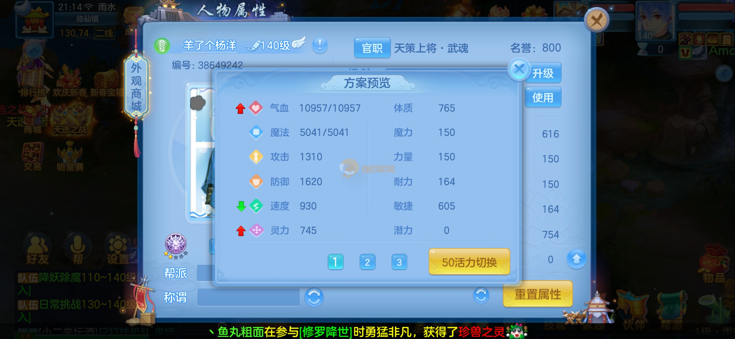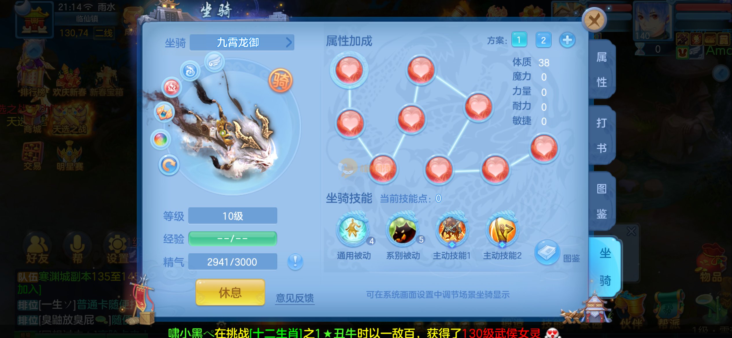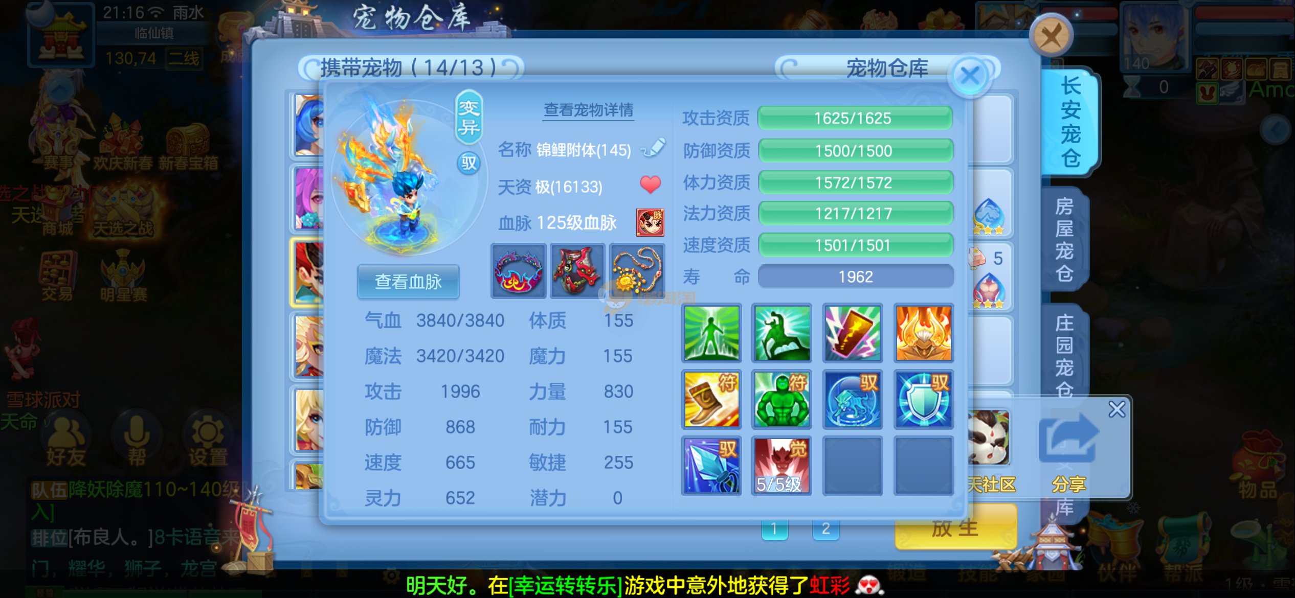 强化仙一龙两蛇一马。特技齐全,宝宝皮肤全,10个满兽魂,辅助特技妙手。13段混12,还有145万银,1884金,坐骑衣橱全,单身海景房,资源满满