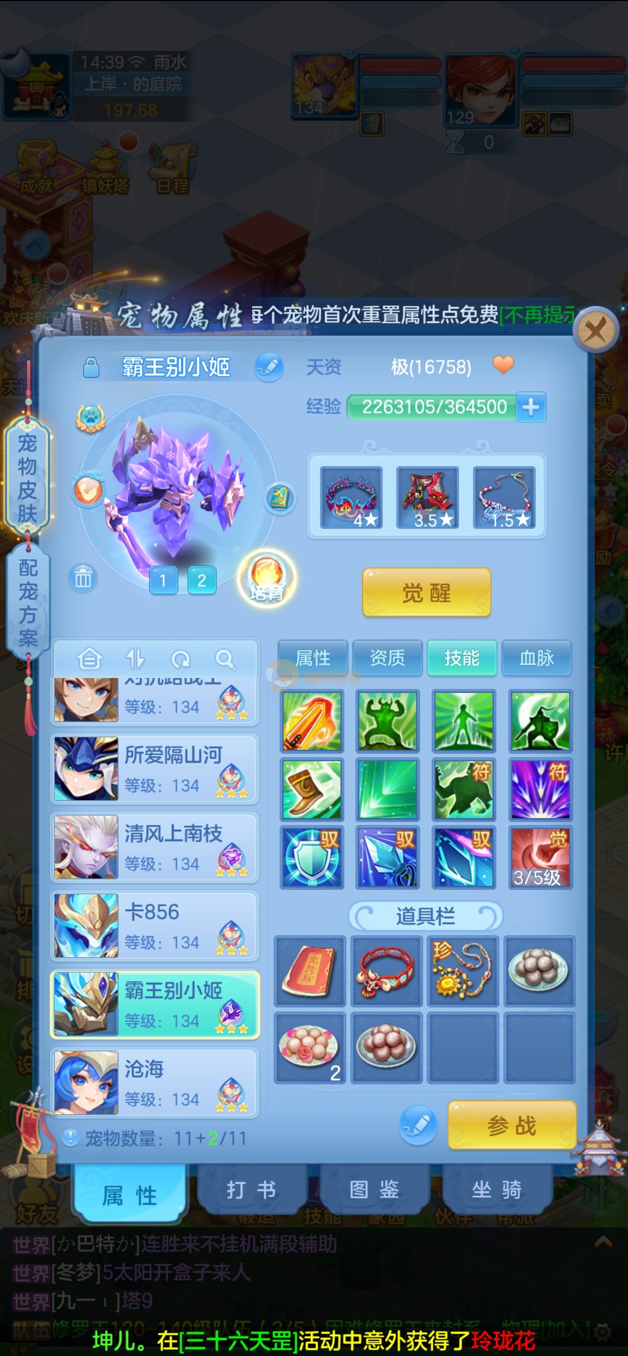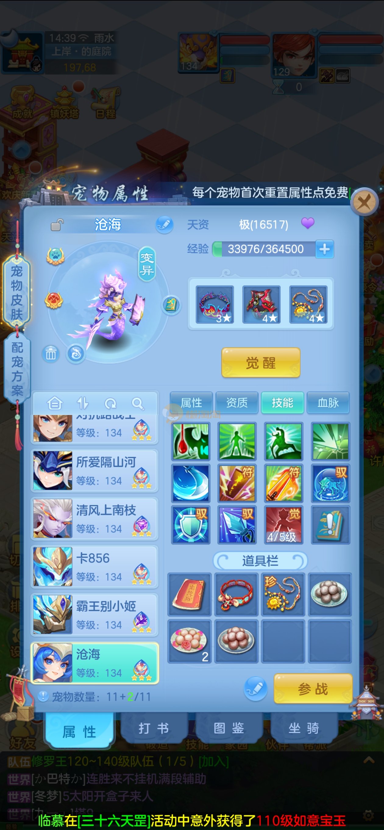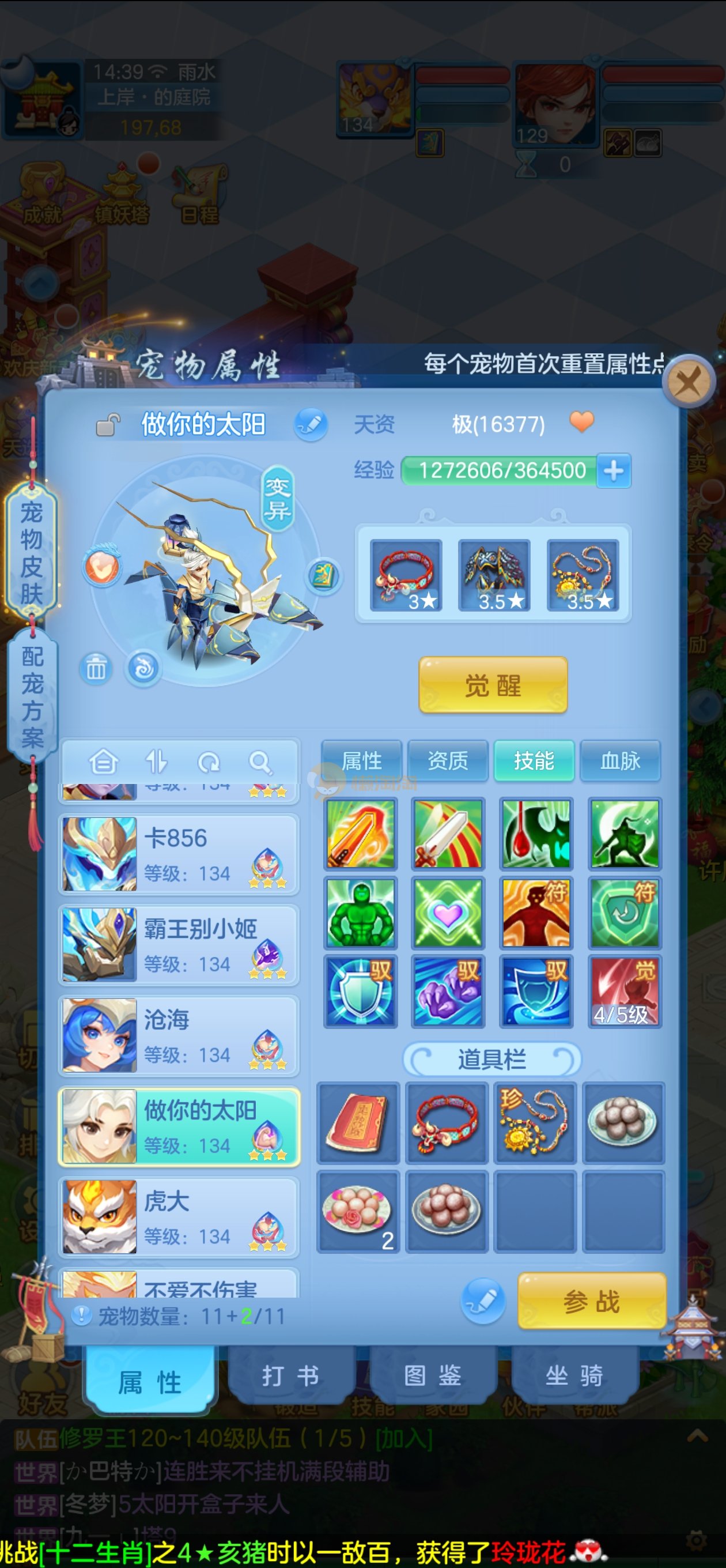 强化仙一龙两蛇一马。特技齐全,宝宝皮肤全,10个满兽魂,辅助特技妙手。13段混12,还有145万银,1884金,坐骑衣橱全,单身海景房,资源满满