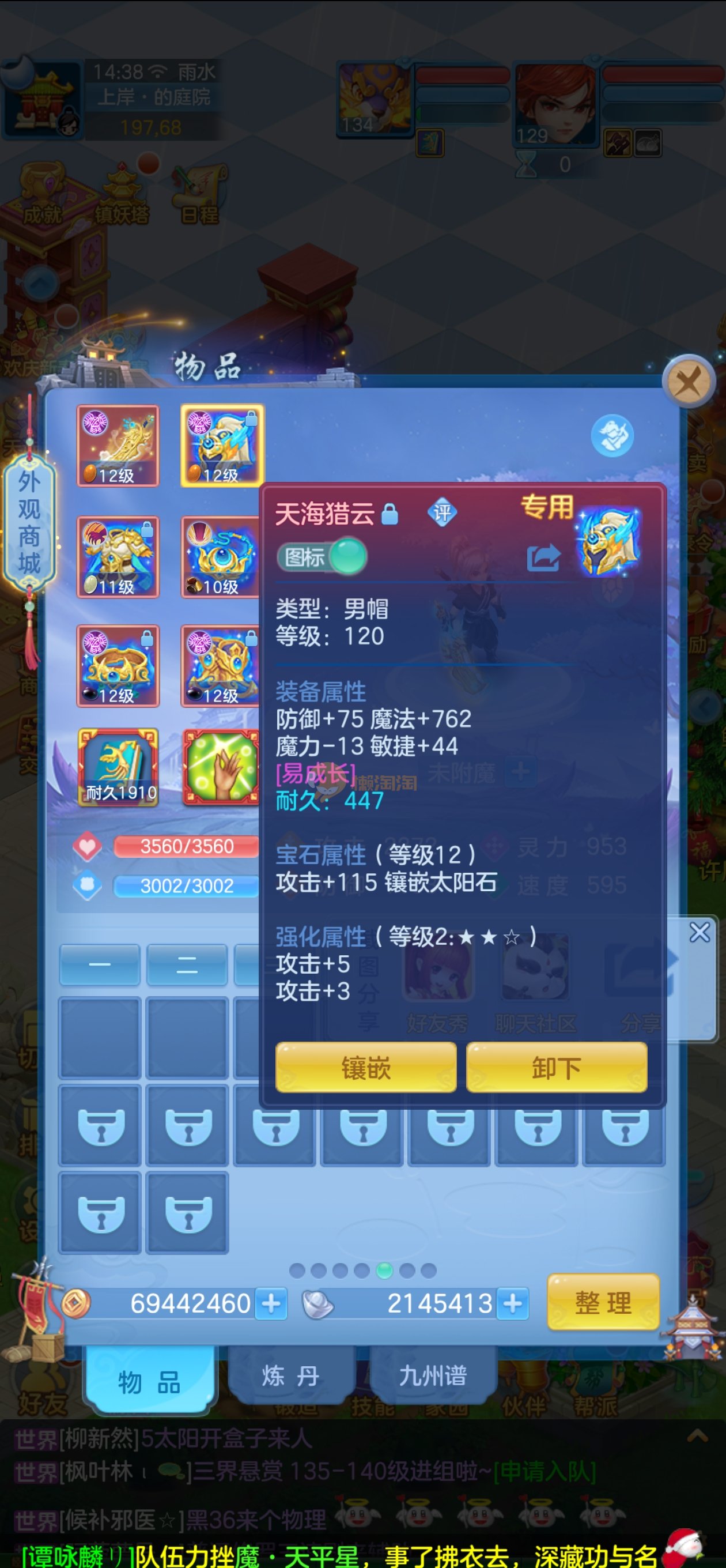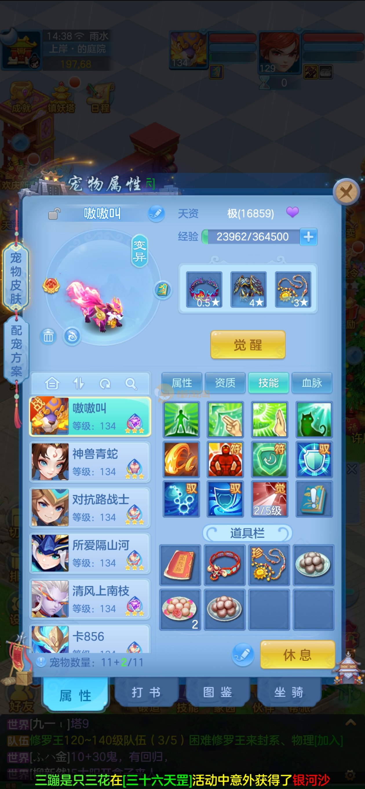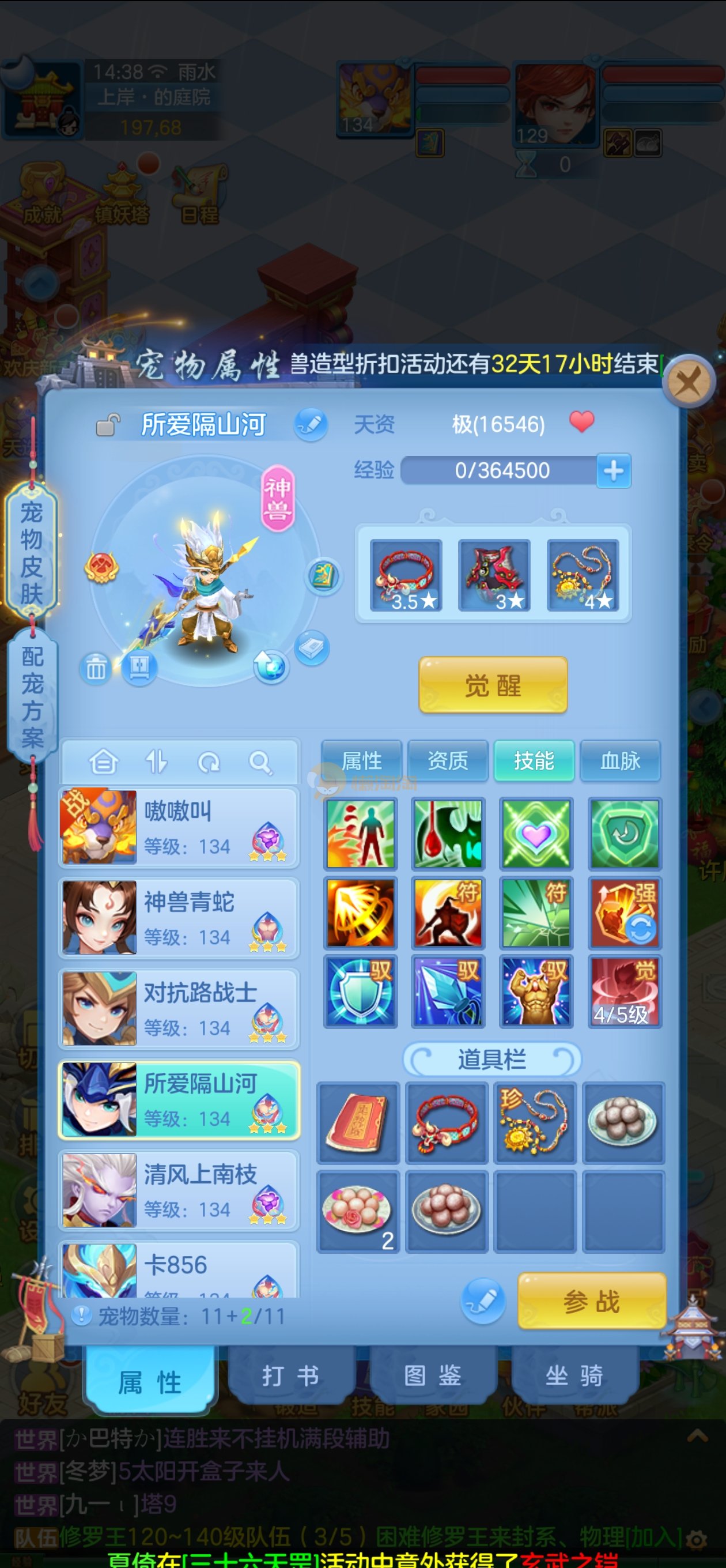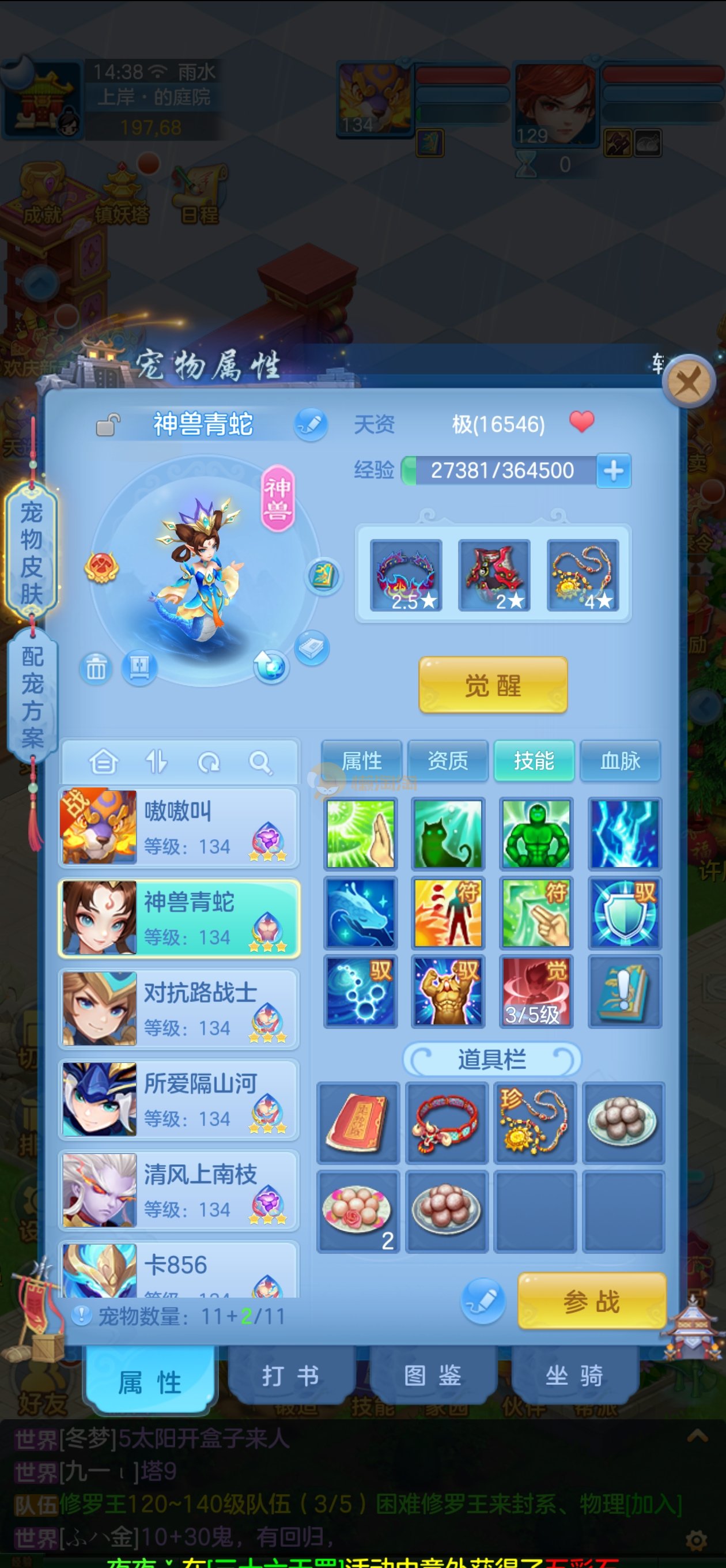 强化仙一龙两蛇一马。特技齐全,宝宝皮肤全,10个满兽魂,辅助特技妙手。13段混12,还有145万银,1884金,坐骑衣橱全,单身海景房,资源满满