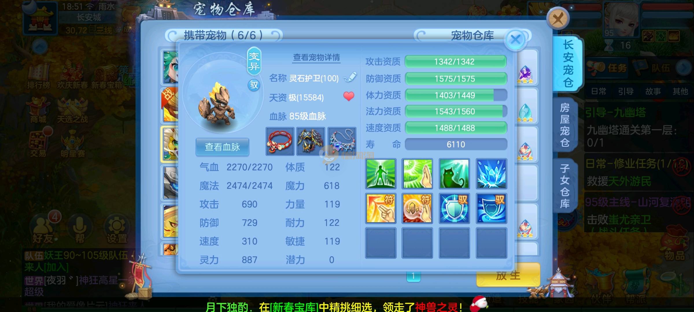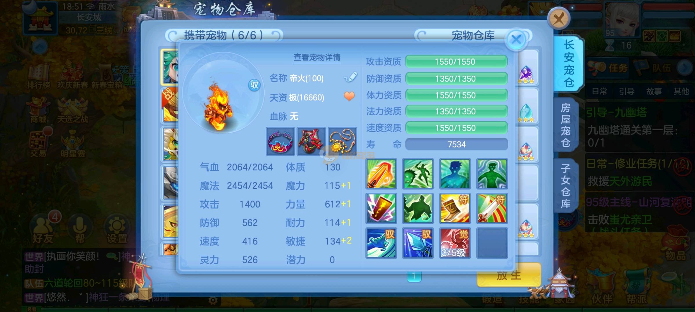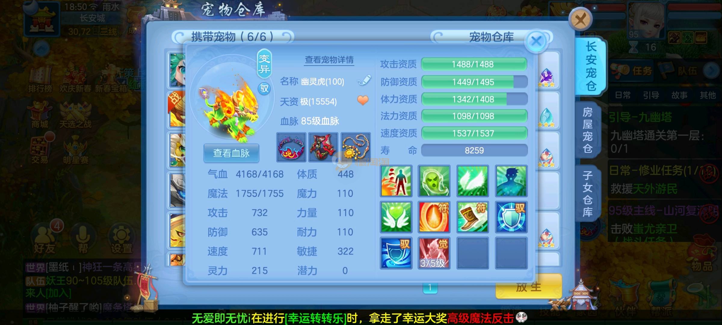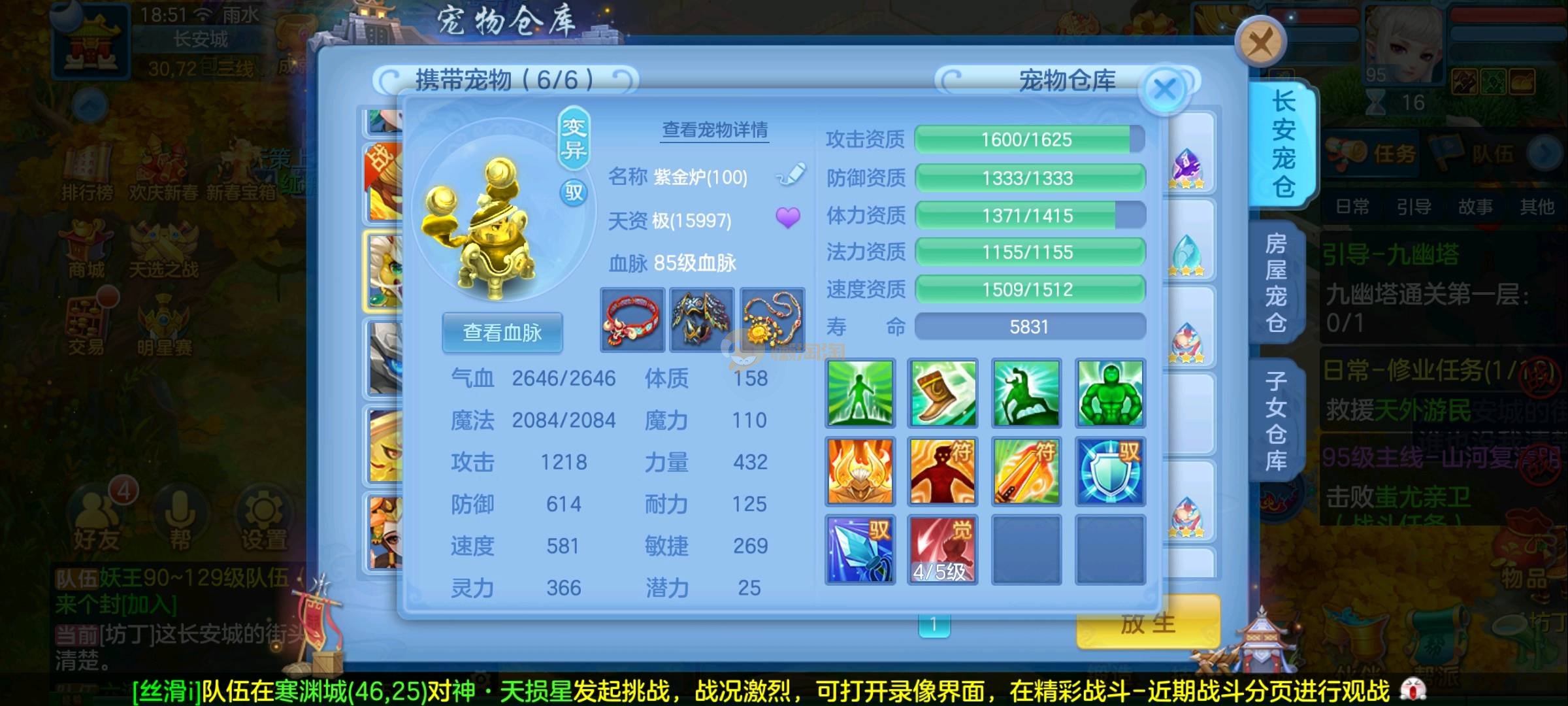 强化仙一龙两蛇一马。特技齐全,宝宝皮肤全,10个满兽魂,辅助特技妙手。13段混12,还有145万银,1884金,坐骑衣橱全,单身海景房,资源满满