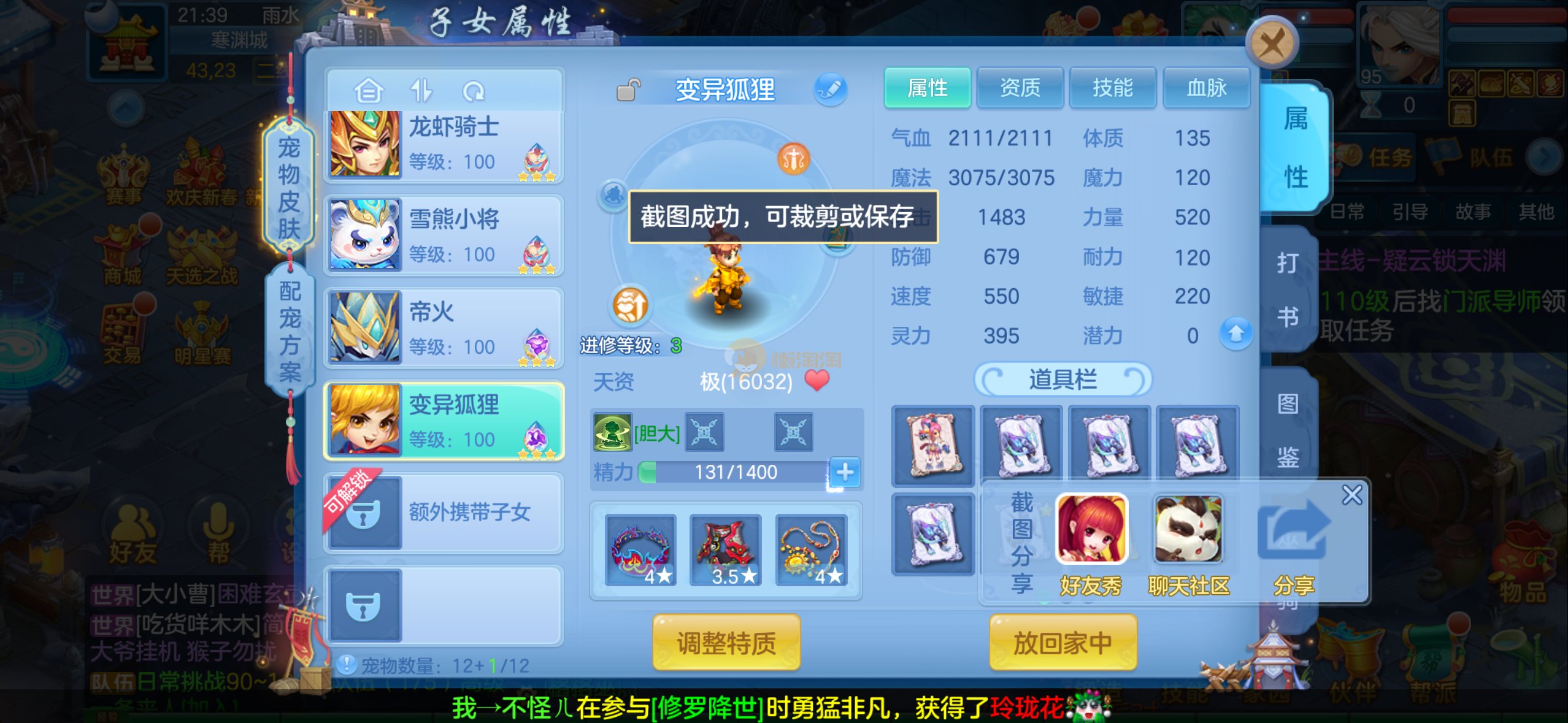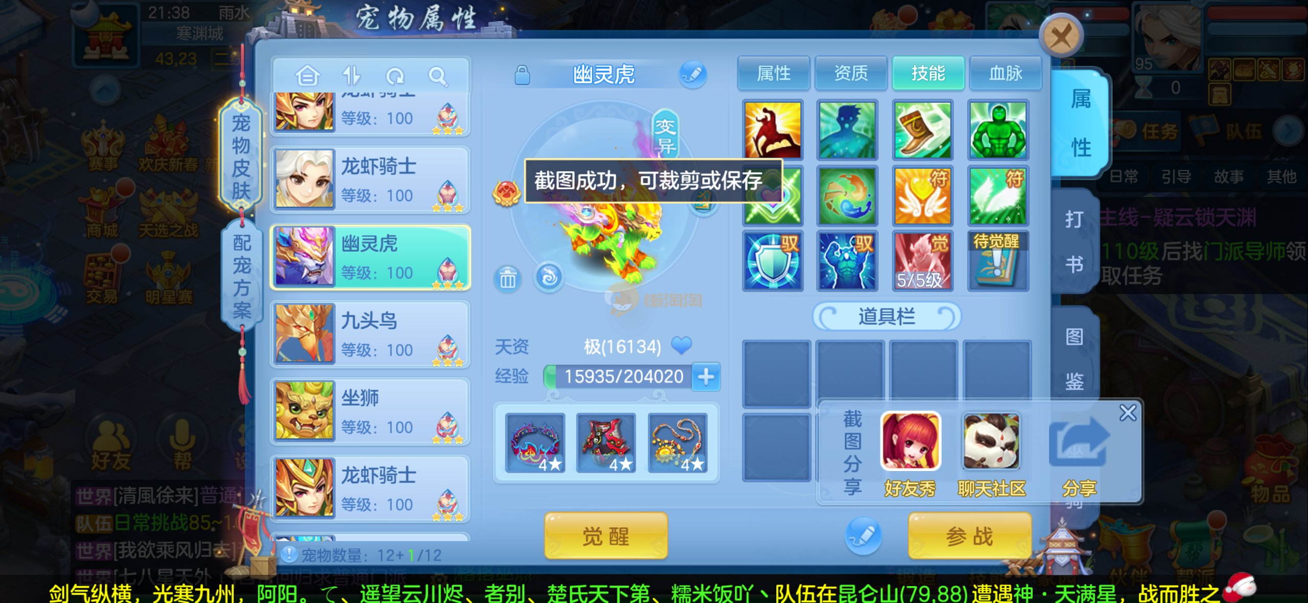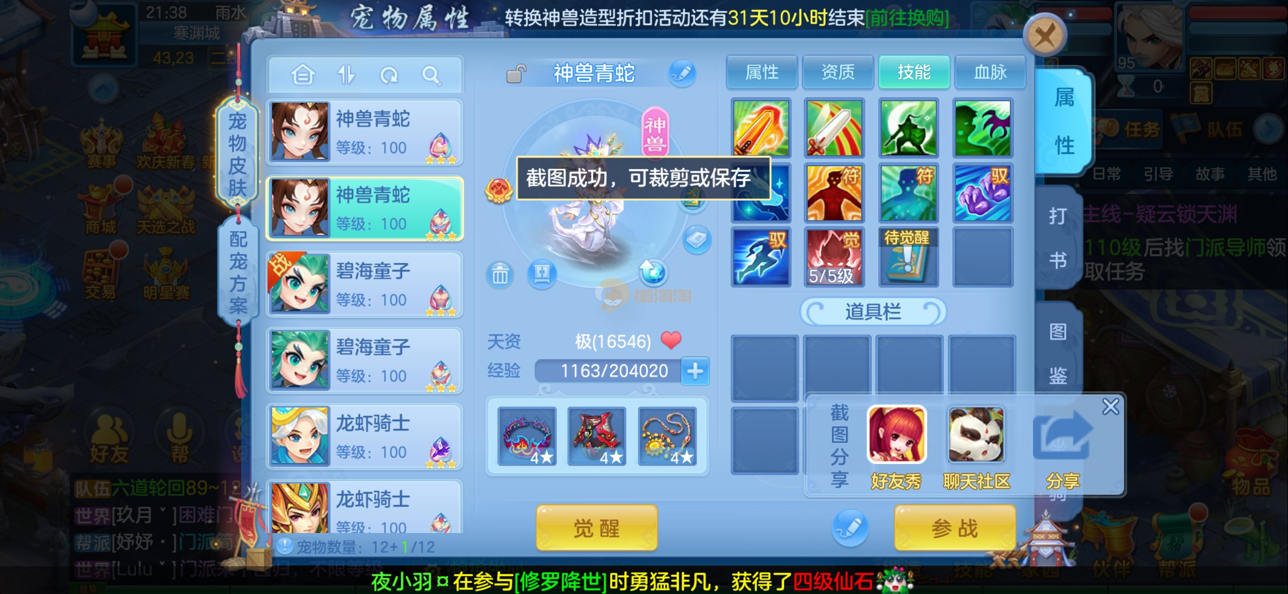 强化仙一龙两蛇一马。特技齐全,宝宝皮肤全,10个满兽魂,辅助特技妙手。13段混12,还有145万银,1884金,坐骑衣橱全,单身海景房,资源满满