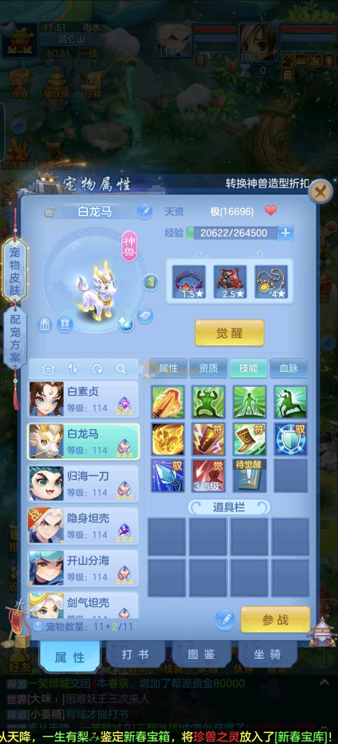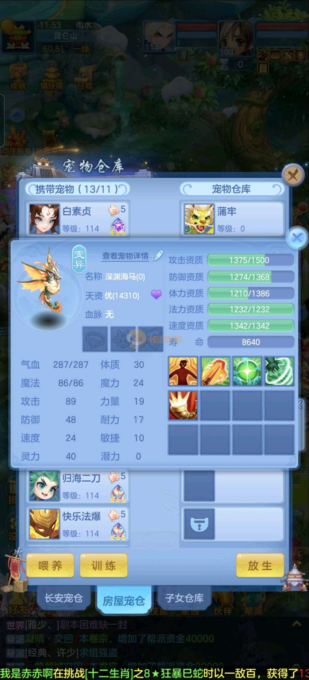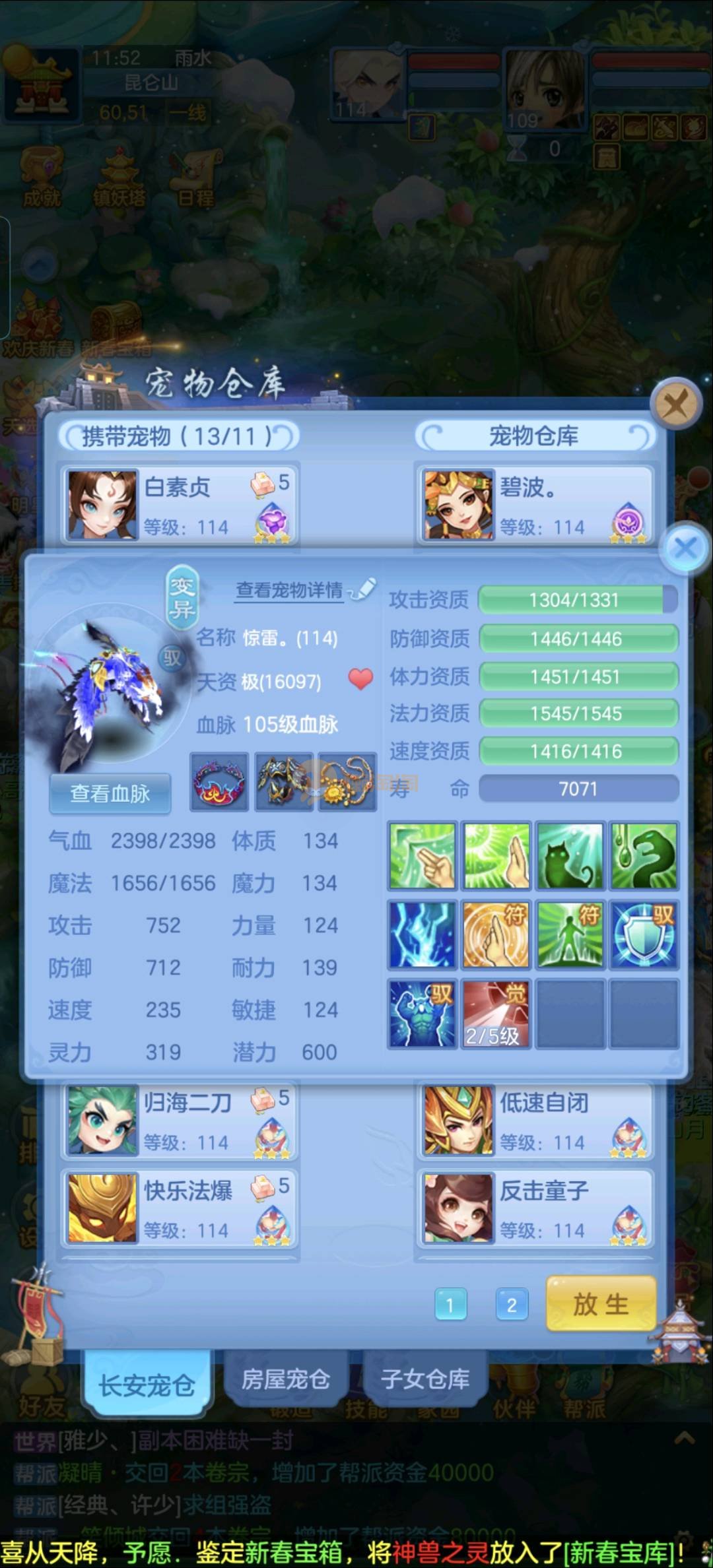 强化仙一龙两蛇一马。特技齐全,宝宝皮肤全,10个满兽魂,辅助特技妙手。13段混12,还有145万银,1884金,坐骑衣橱全,单身海景房,资源满满
