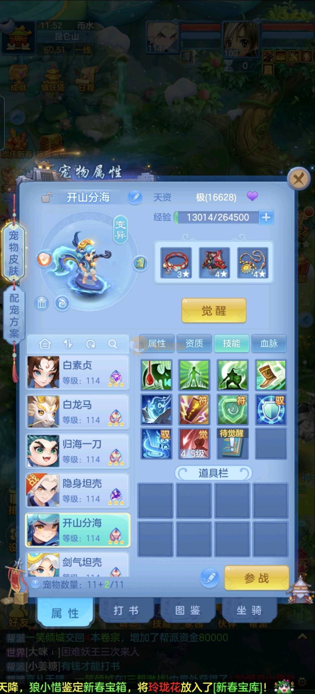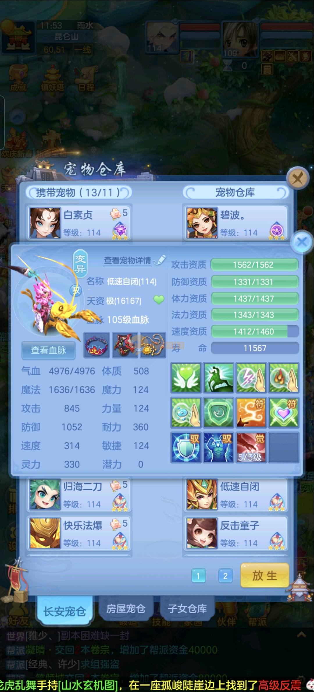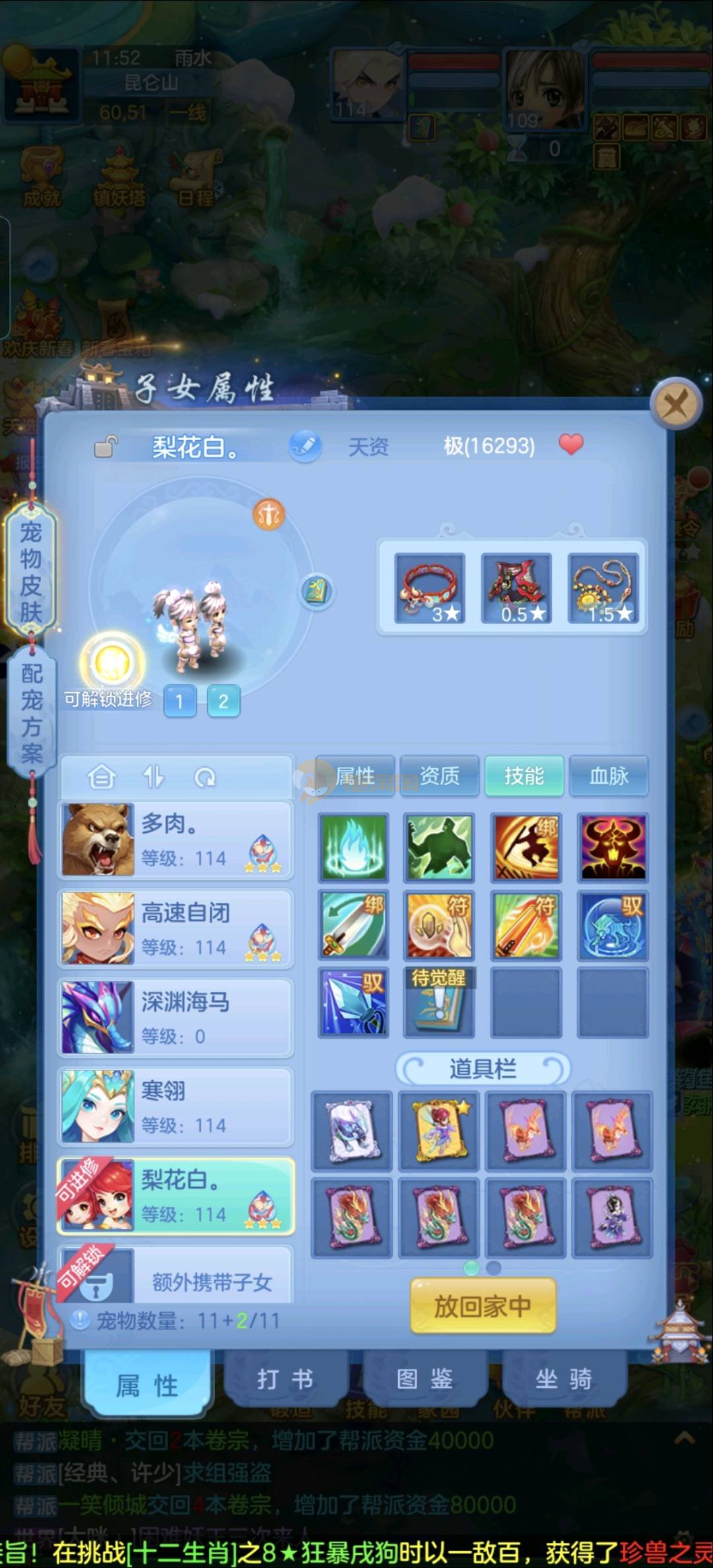 强化仙一龙两蛇一马。特技齐全,宝宝皮肤全,10个满兽魂,辅助特技妙手。13段混12,还有145万银,1884金,坐骑衣橱全,单身海景房,资源满满